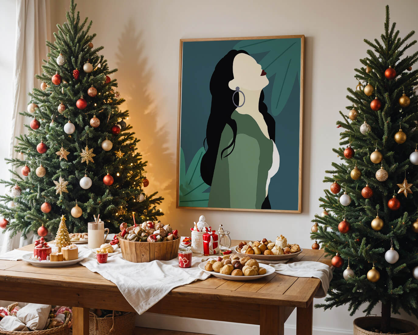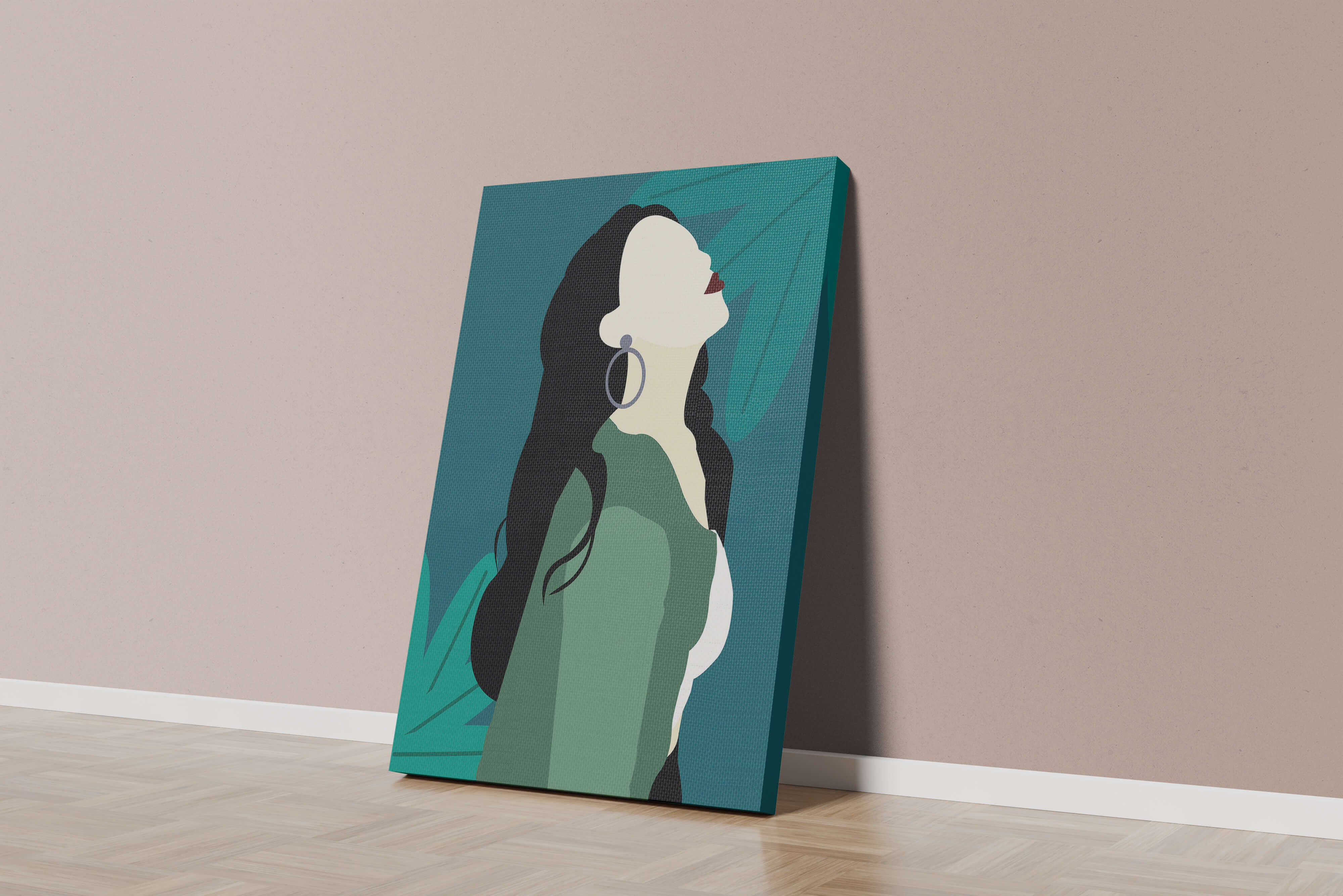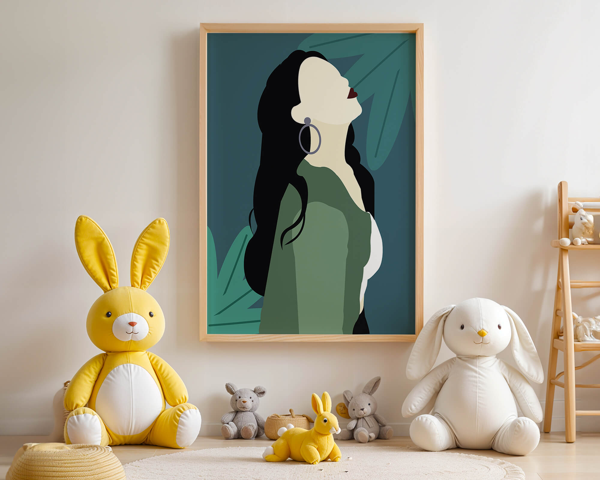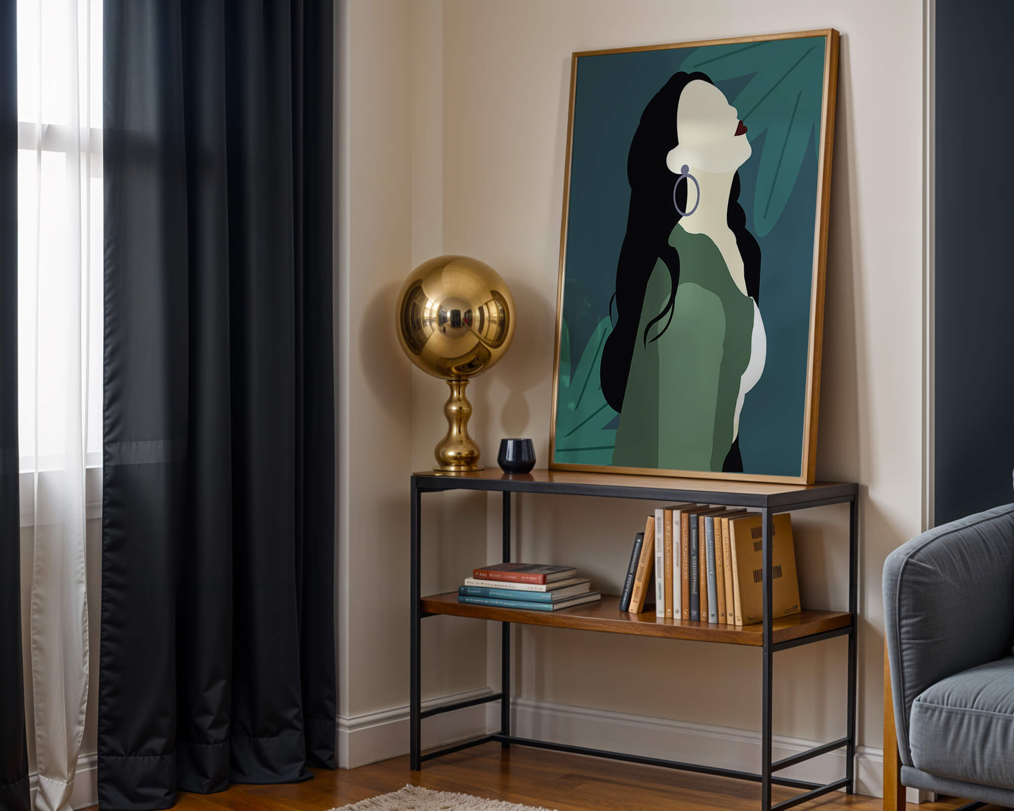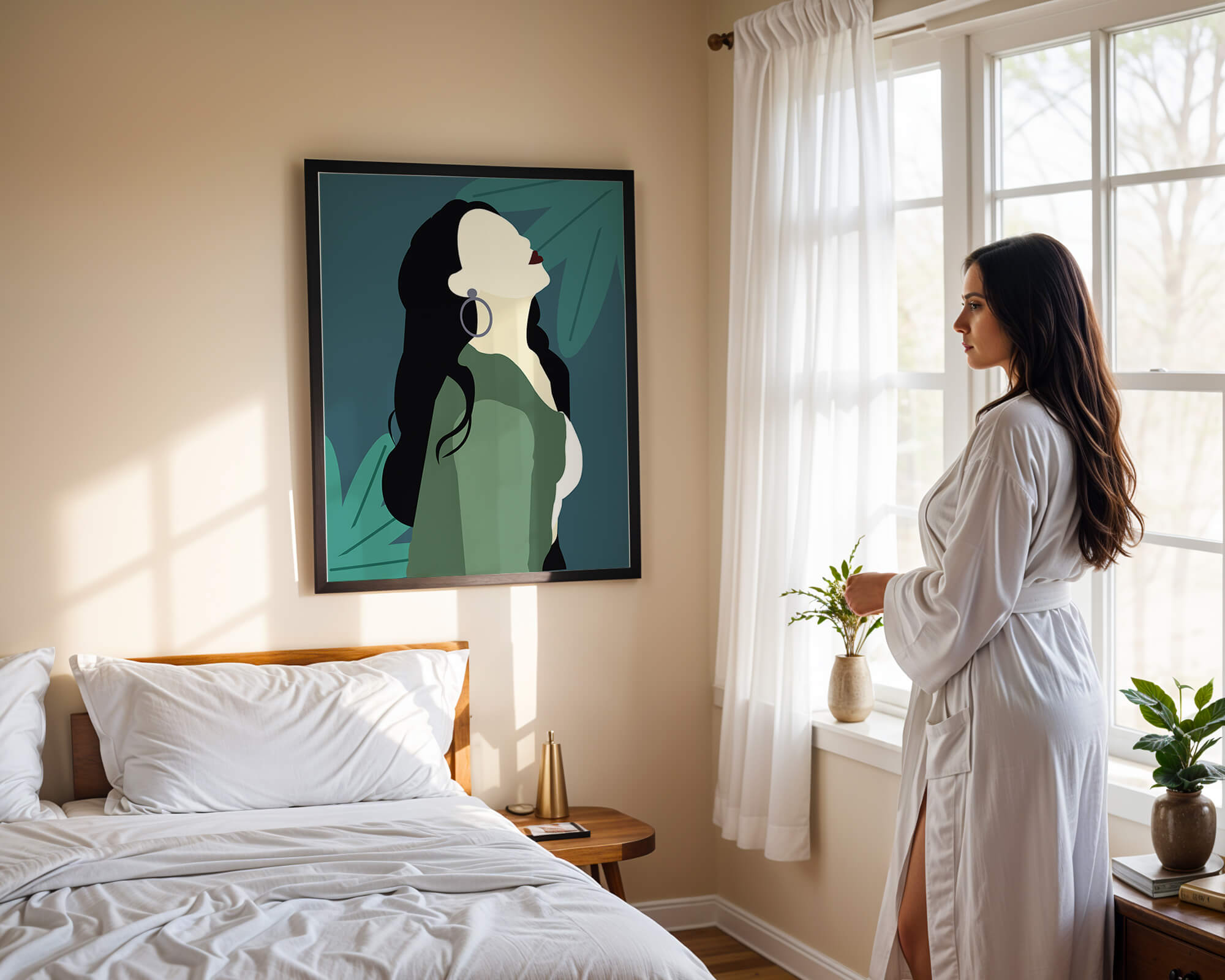 The simplicity of this artwork makes it a perfect piece for any contemporary space. The muted colors of green and blue create a soothing atmosphere, while the bold black hair and red lipstick of the woman add striking contrast. Large hoop earrings add a touch of elegance and modern fashion, highlighting her graceful demeanor.This piece can transform any room, adding a sense of tranquility and sophistication. The abstract foliage in the backdrop complements the minimalist style of the illustration, making it a versatile addition to various interior décors. Whether displayed in a living room or a personal study, this artwork will surely draw the viewers attention and invoke contemplation.