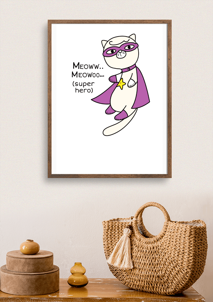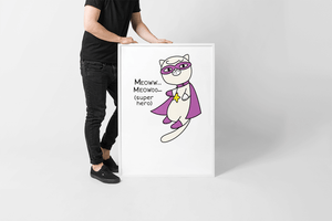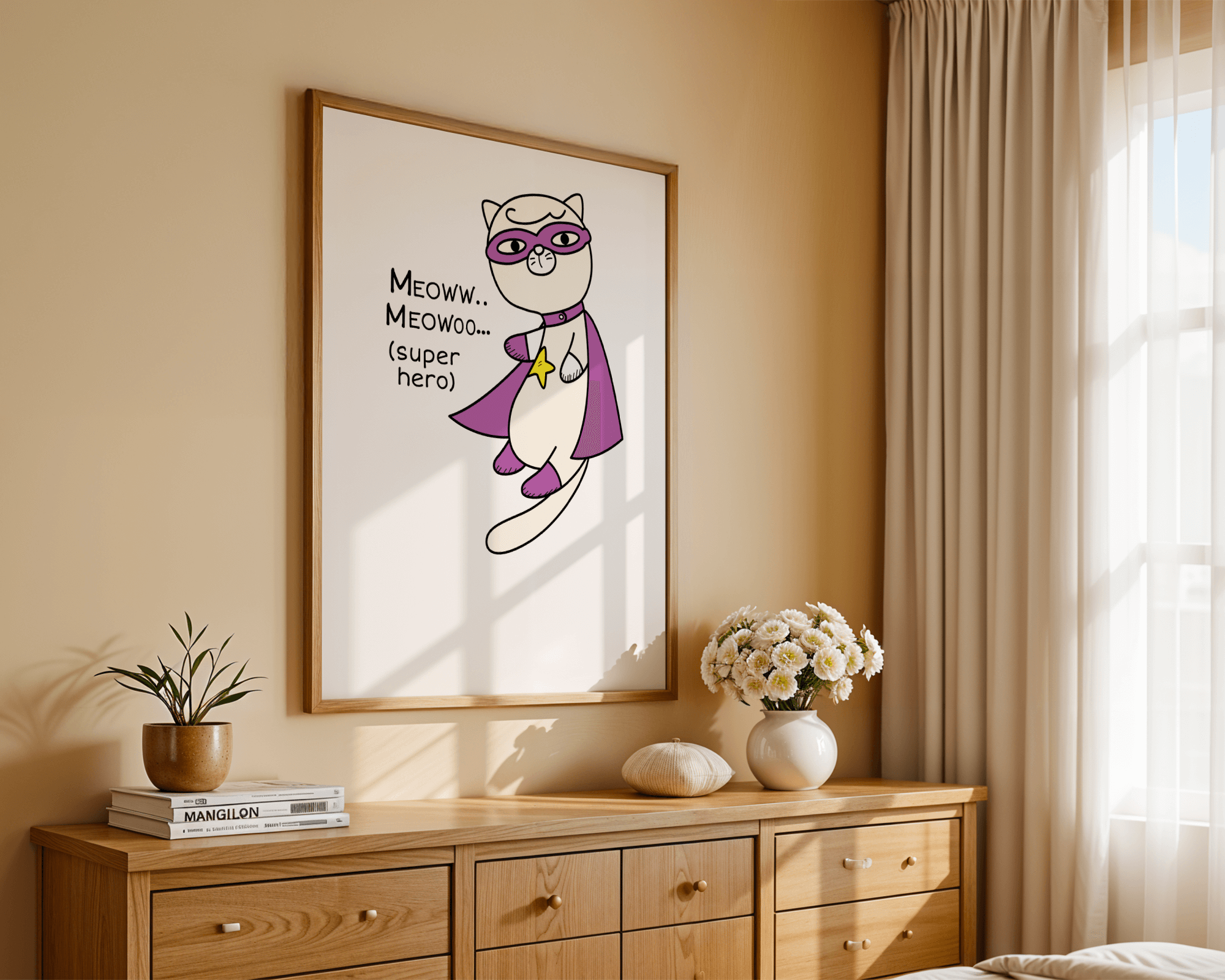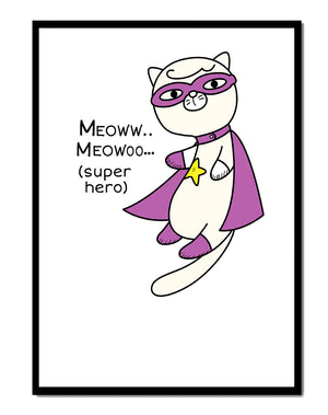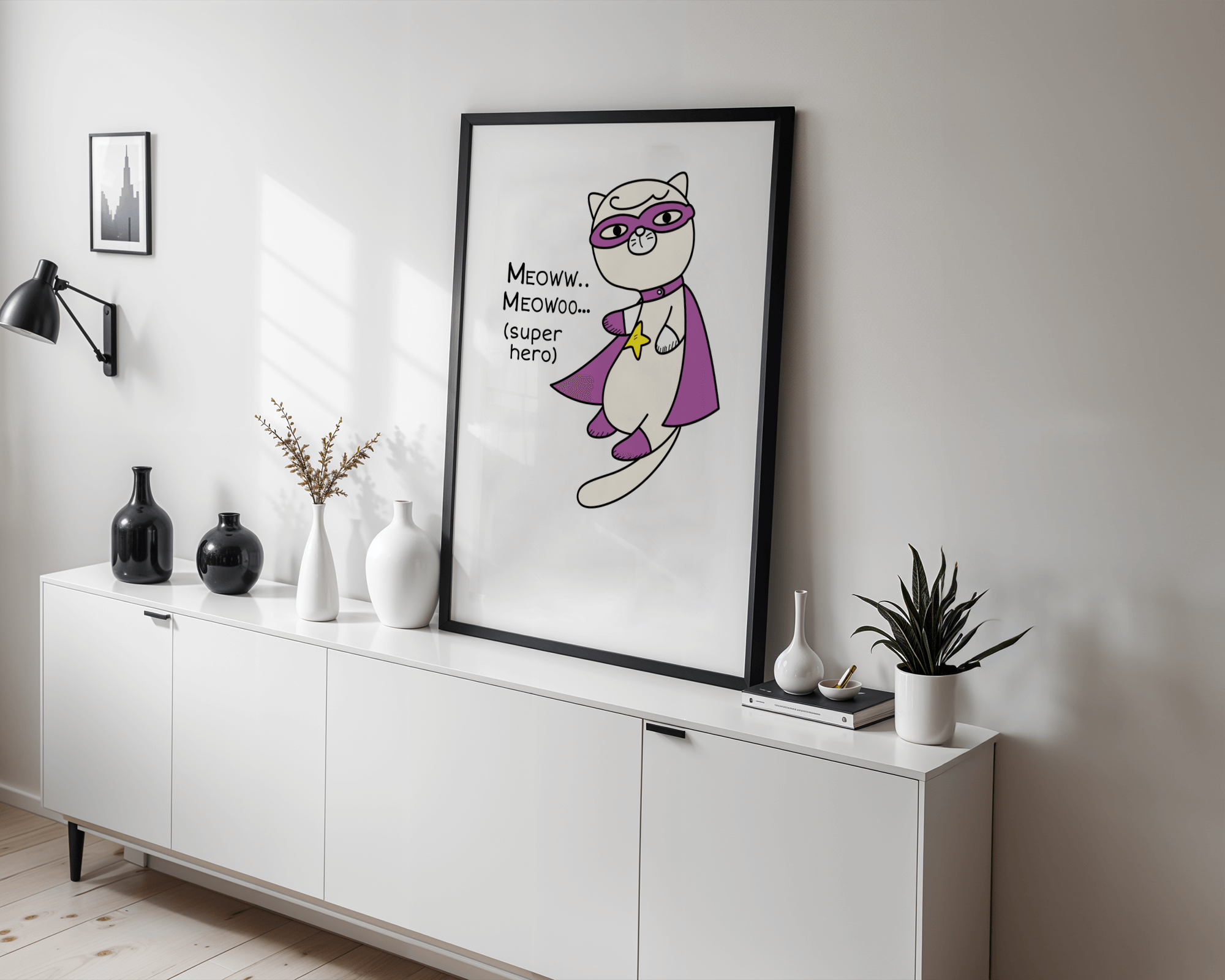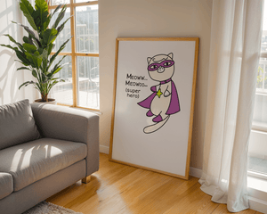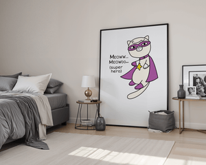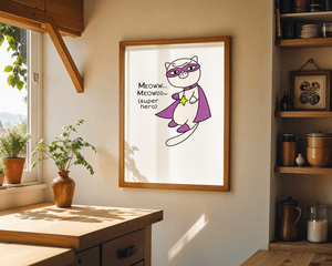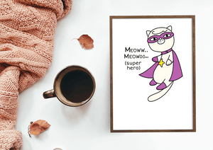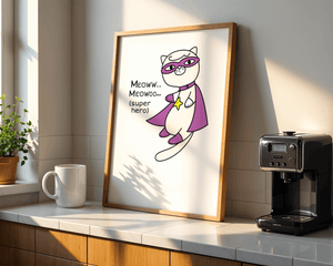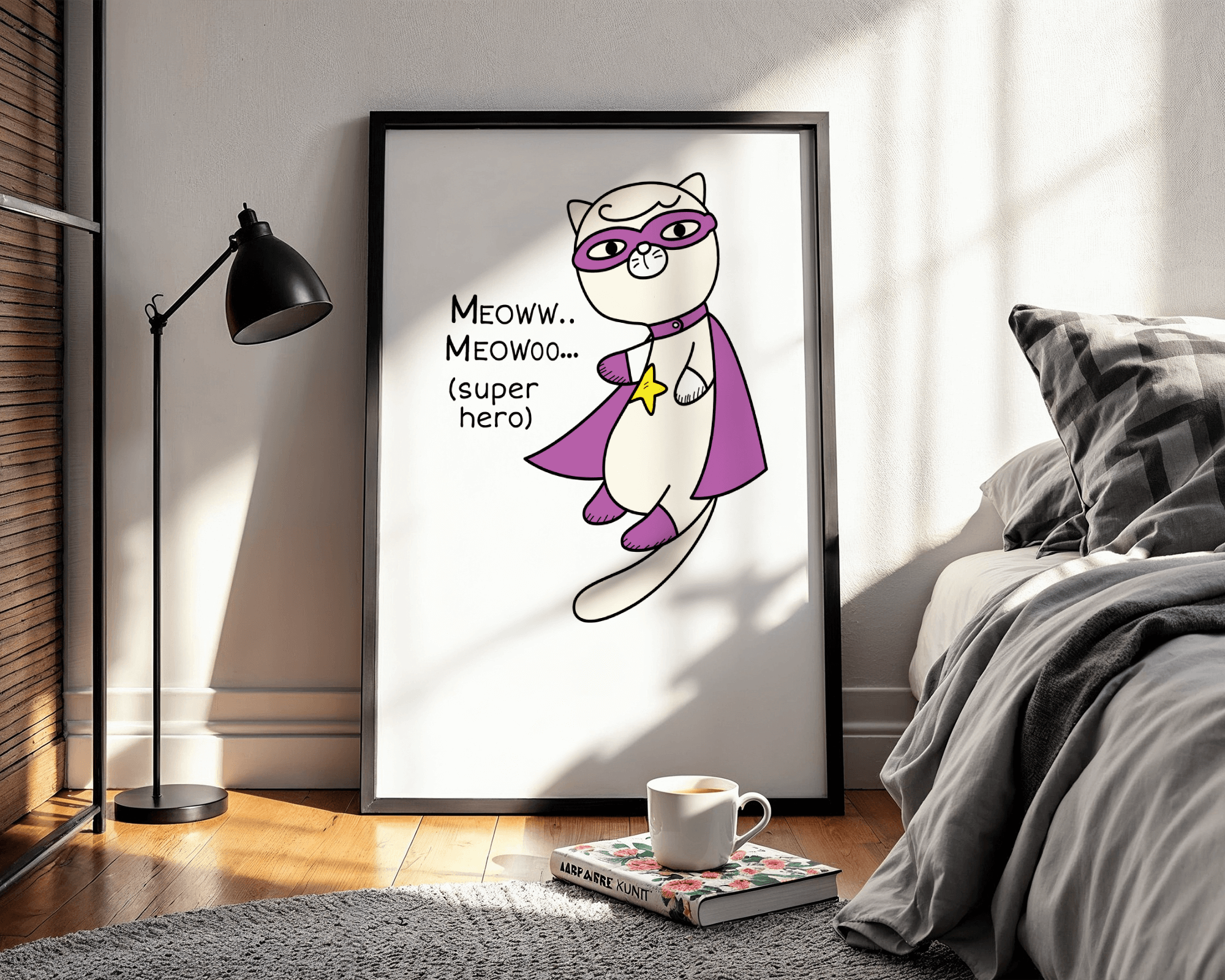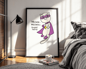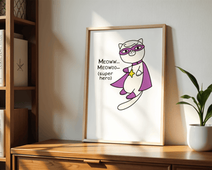 A fun and playful superhero cat illustration featuring a cute feline hero in a purple cape and mask, ready to save the day. With bold comic-style text, this artwork adds a touch of humor and adventure to any space.