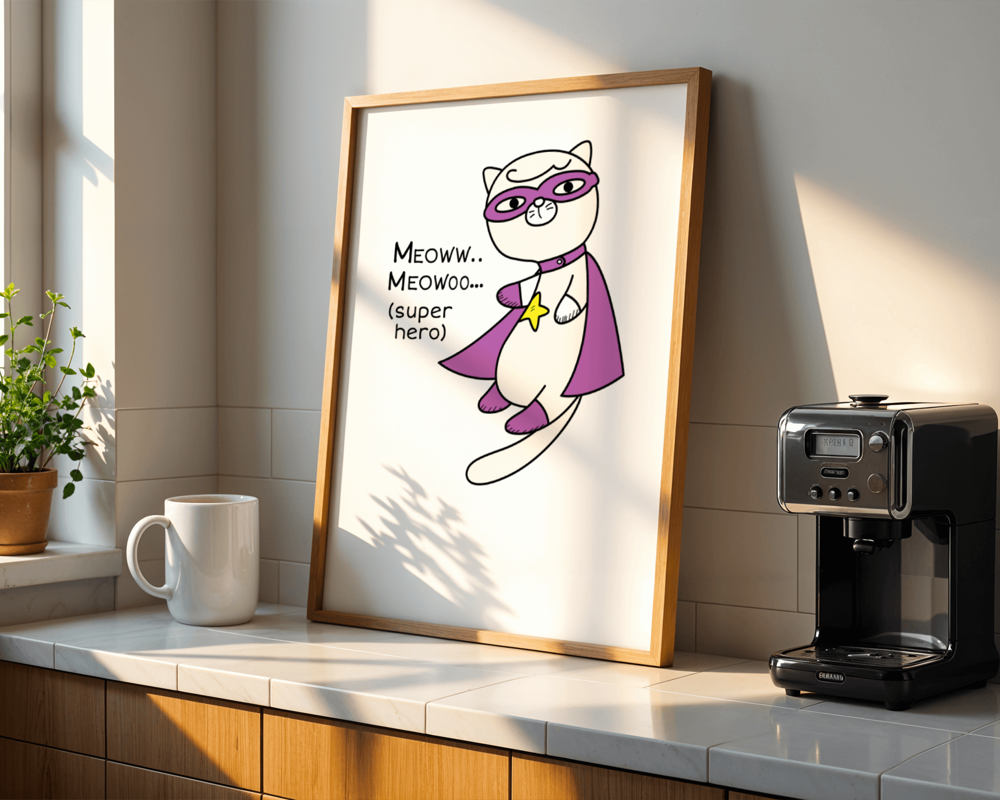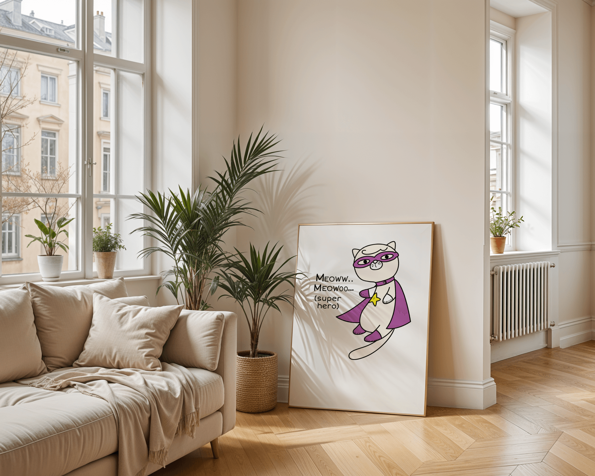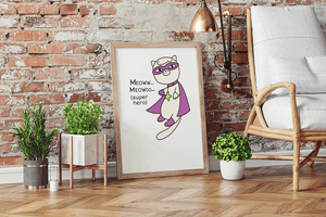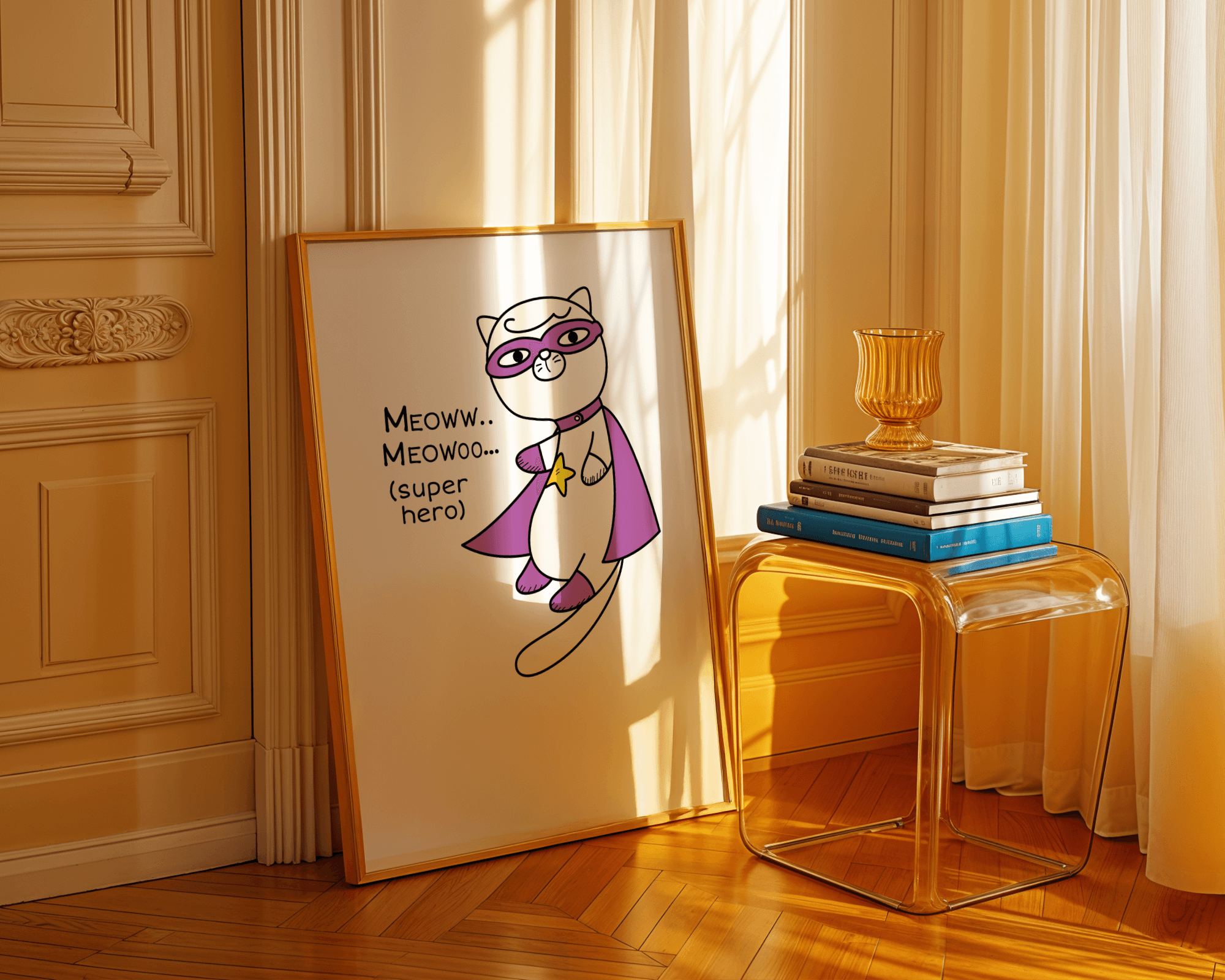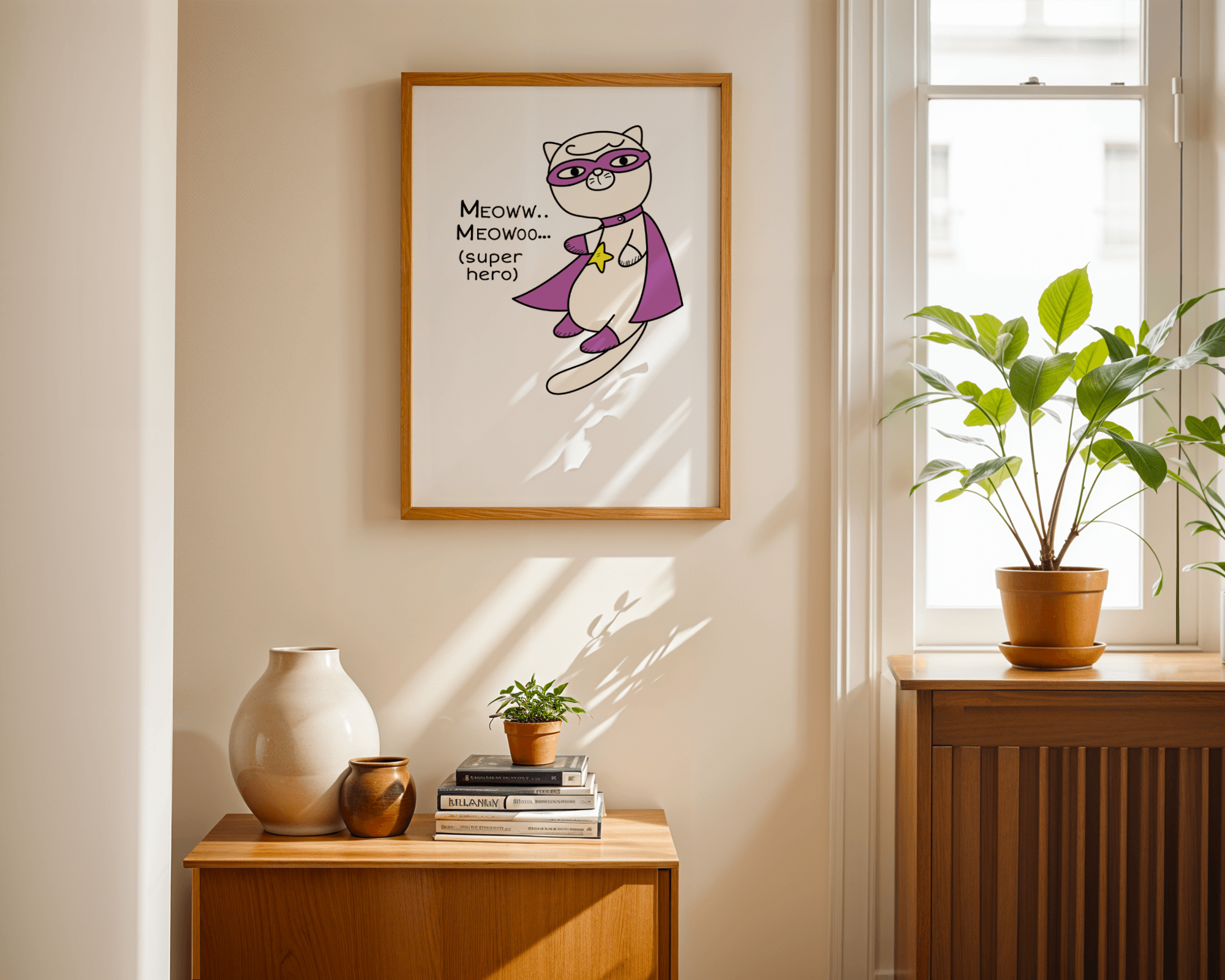 A fun and playful superhero cat illustration featuring a cute feline hero in a purple cape and mask, ready to save the day. With bold comic-style text, this artwork adds a touch of humor and adventure to any space.