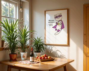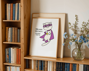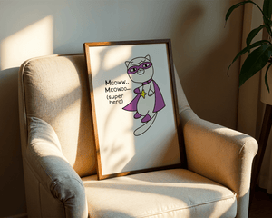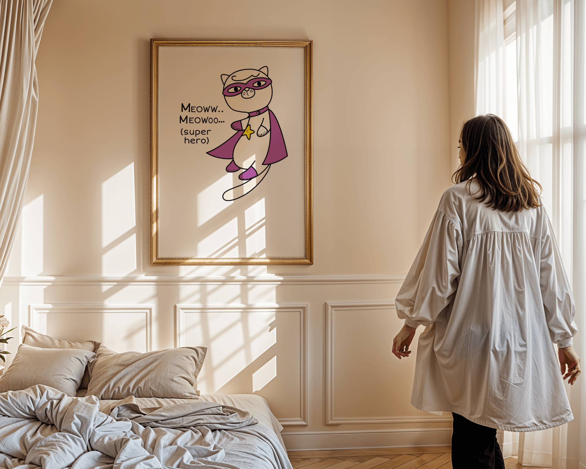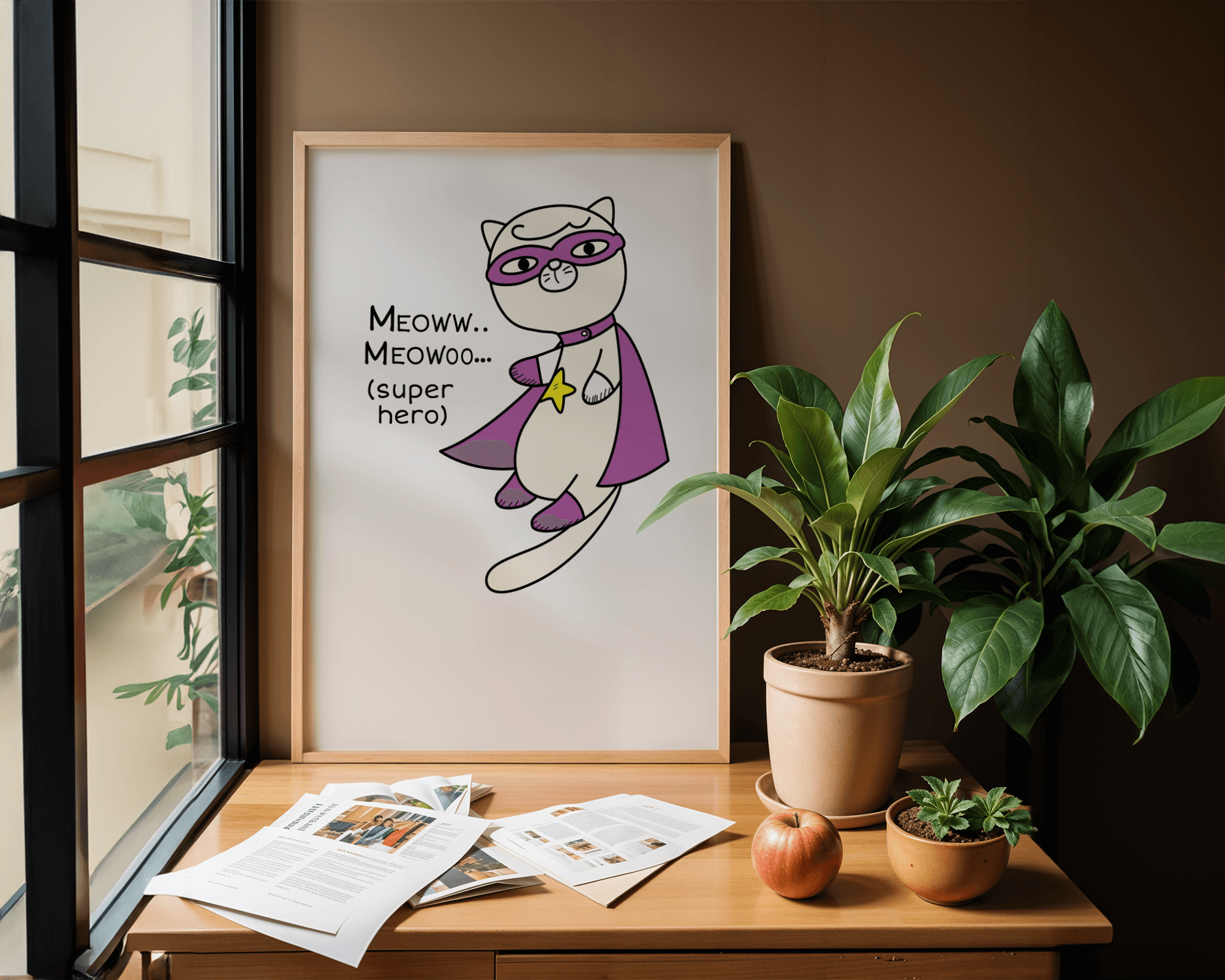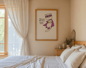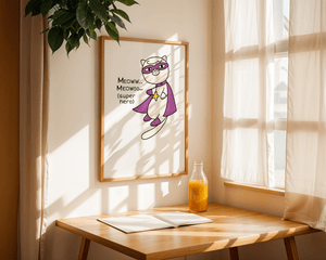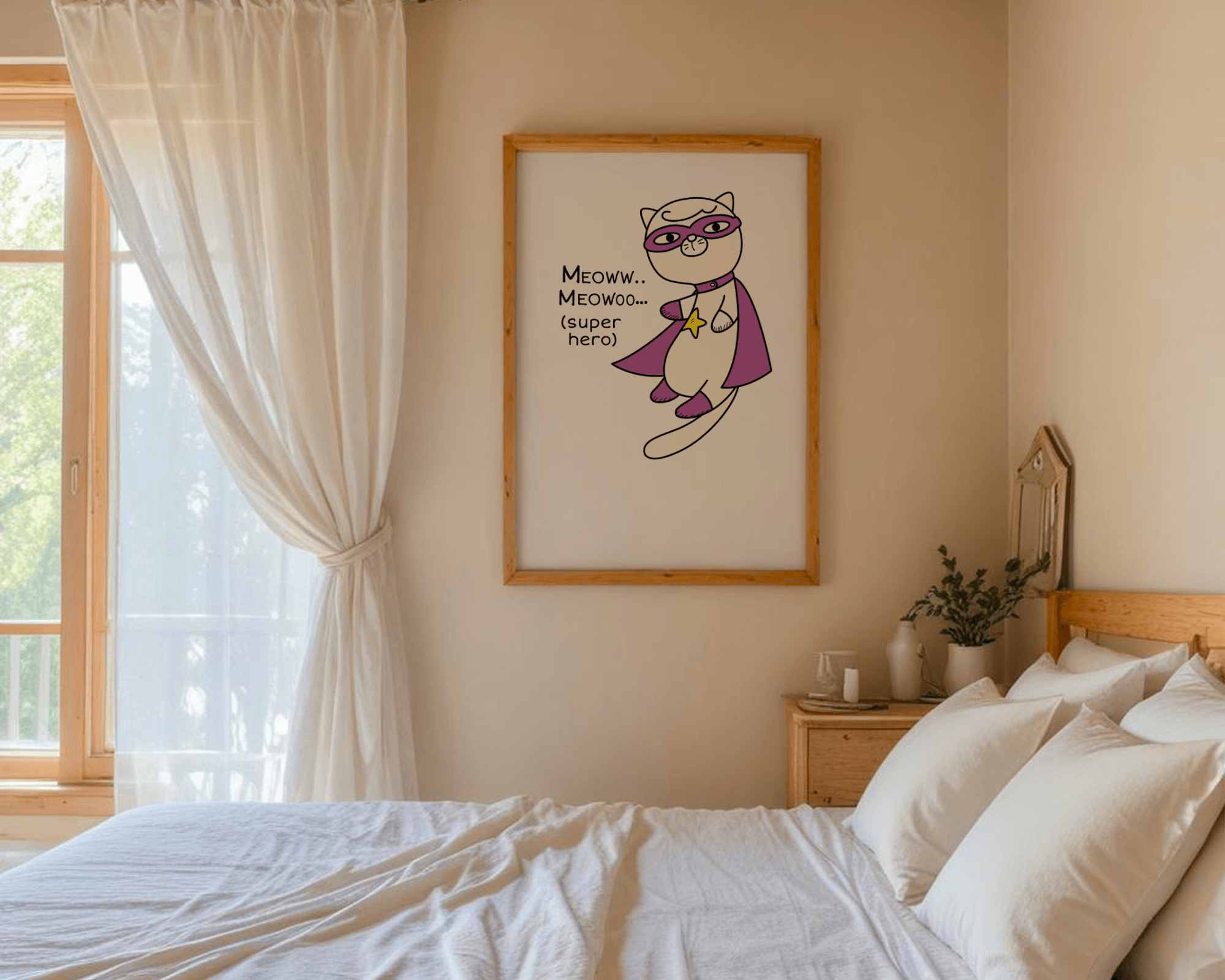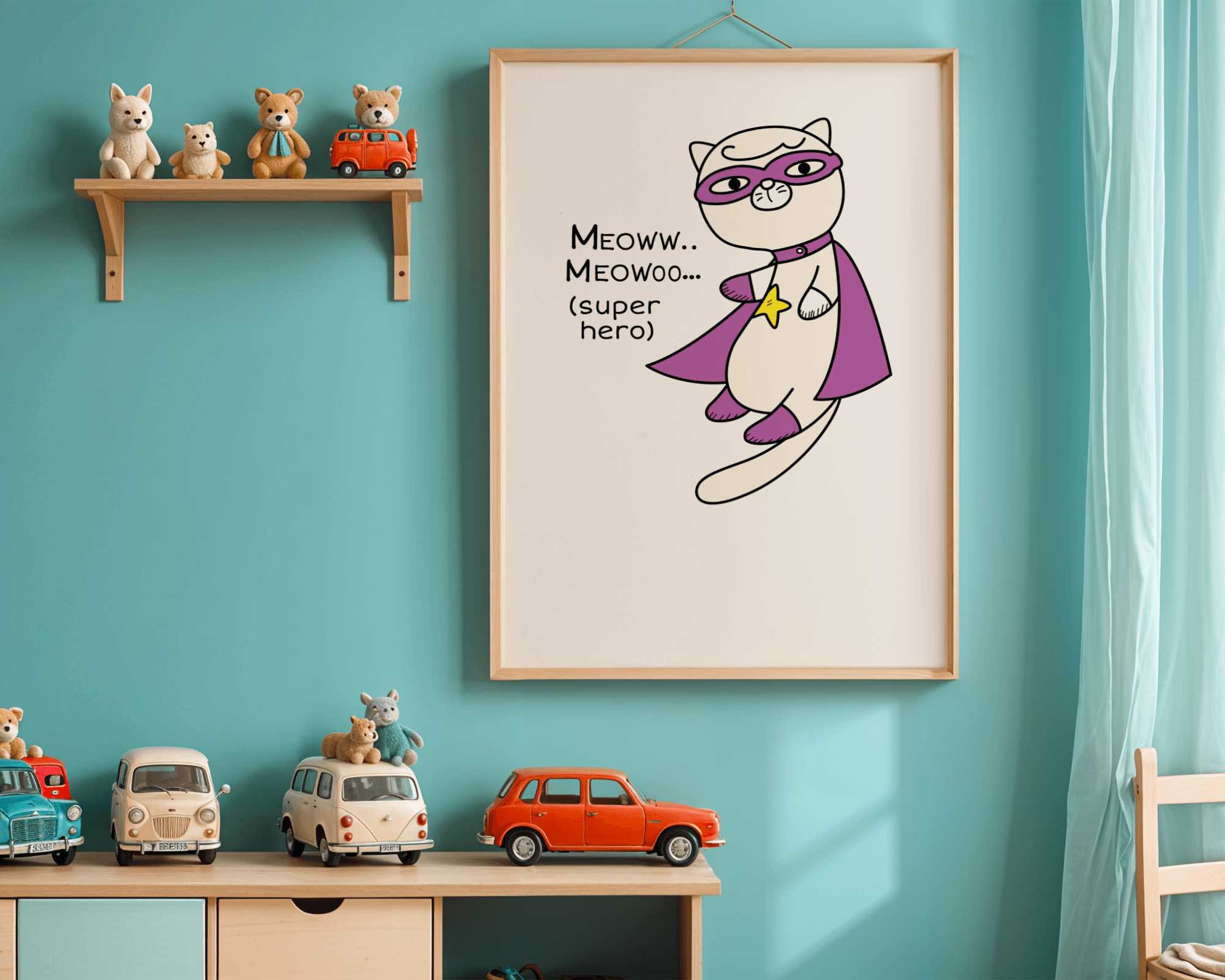 A fun and playful superhero cat illustration featuring a cute feline hero in a purple cape and mask, ready to save the day. With bold comic-style text, this artwork adds a touch of humor and adventure to any space.