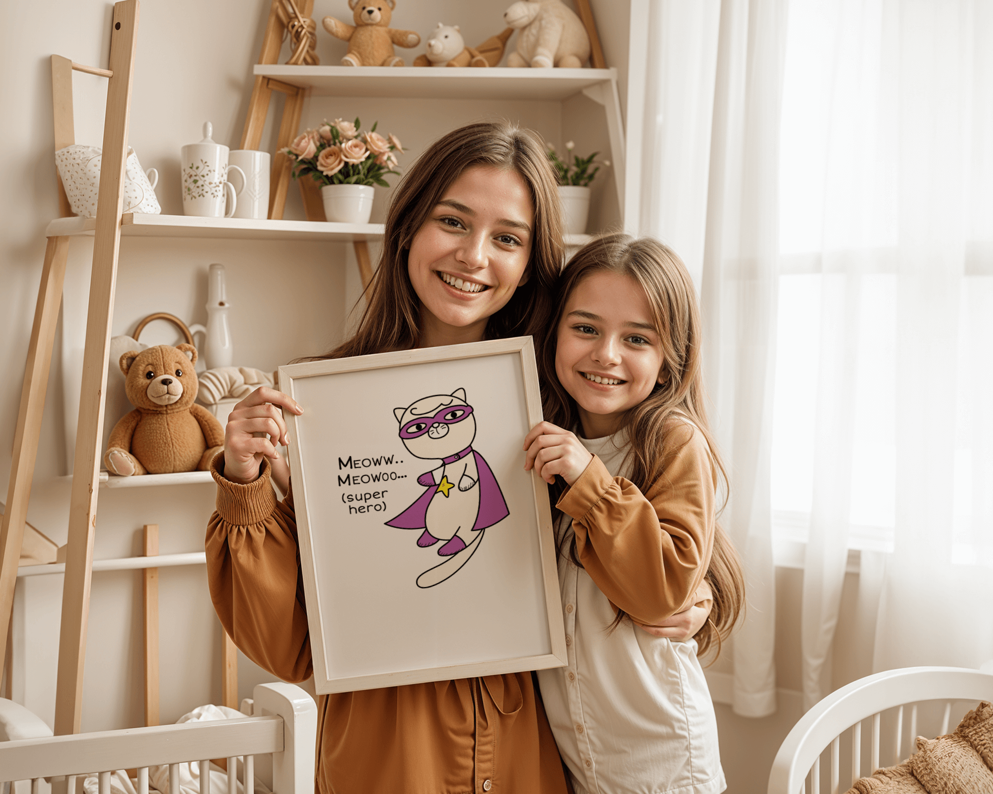 Designed with vibrant colors and a cartoonish charm, this superhero cat brings joy and imagination to children’s rooms, offices, or creative spaces. The expressive design captures the essence of feline mischief with a heroic twist.