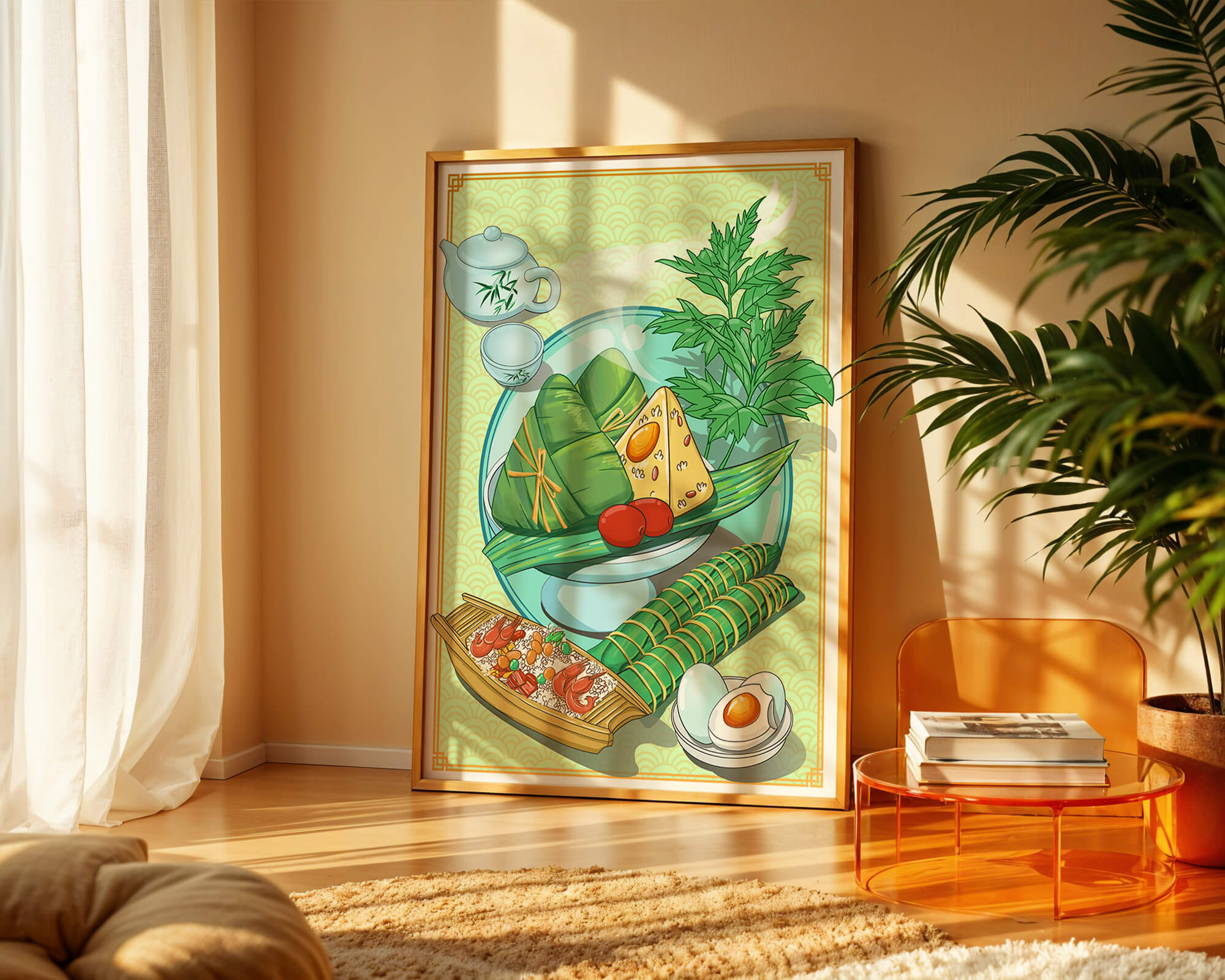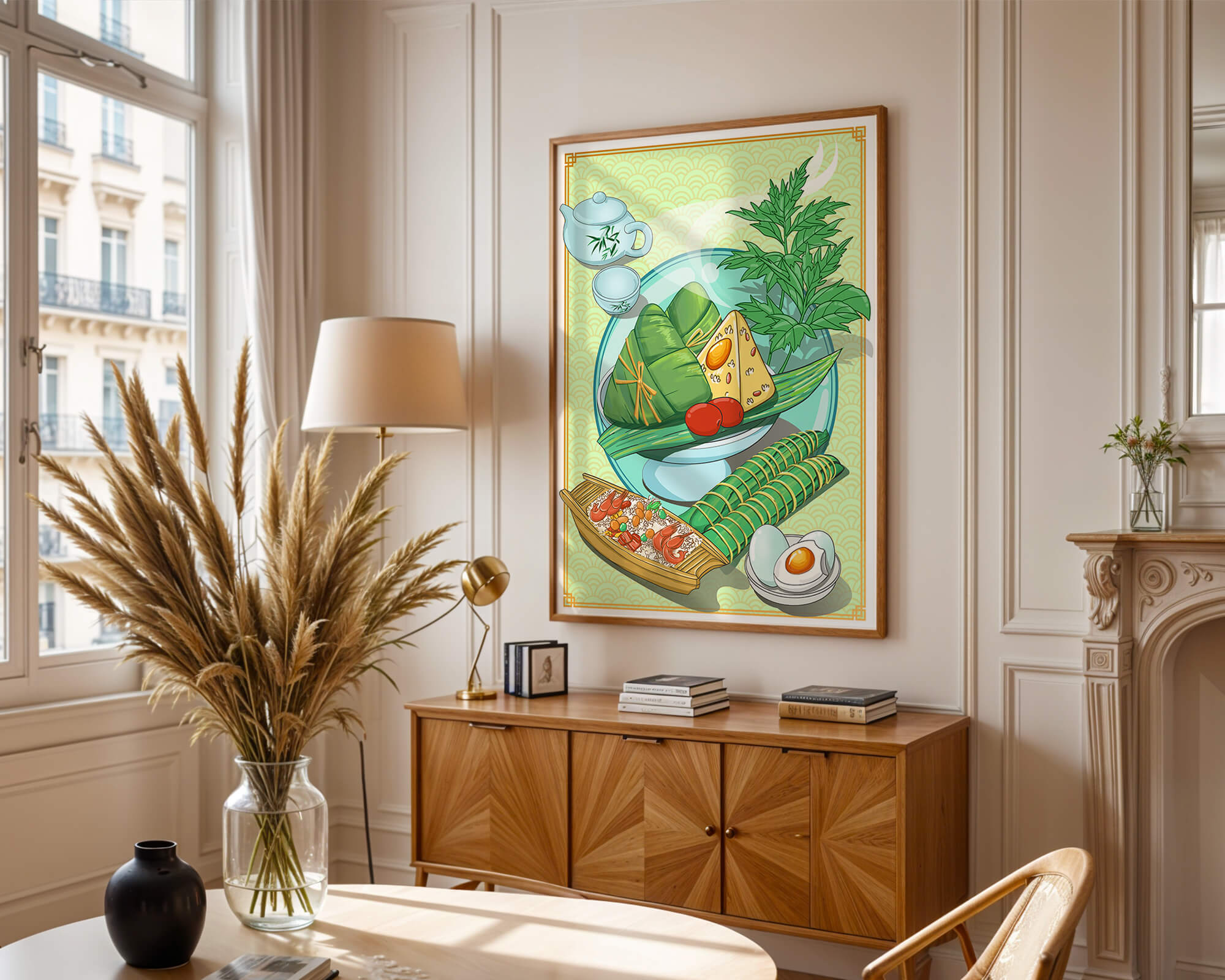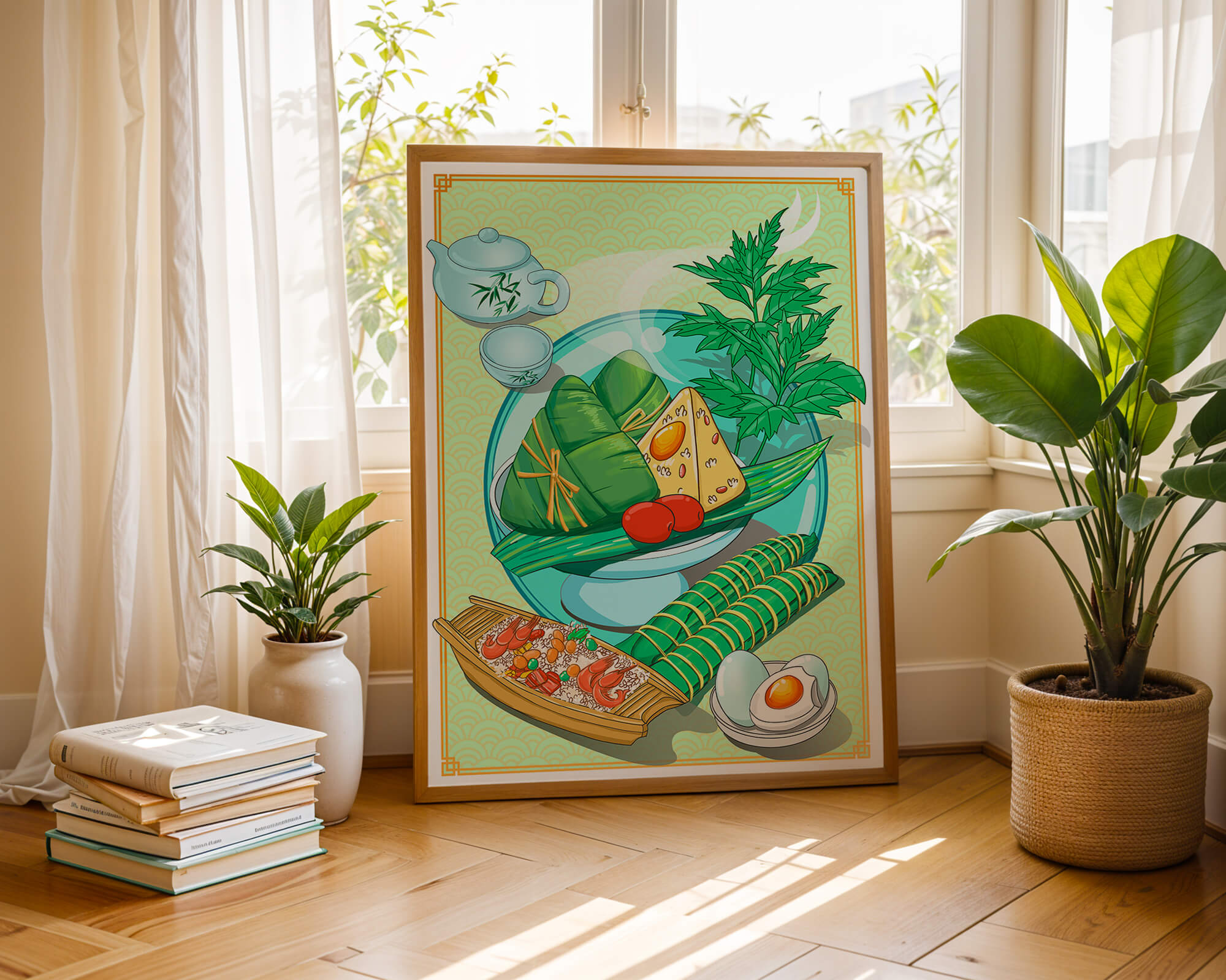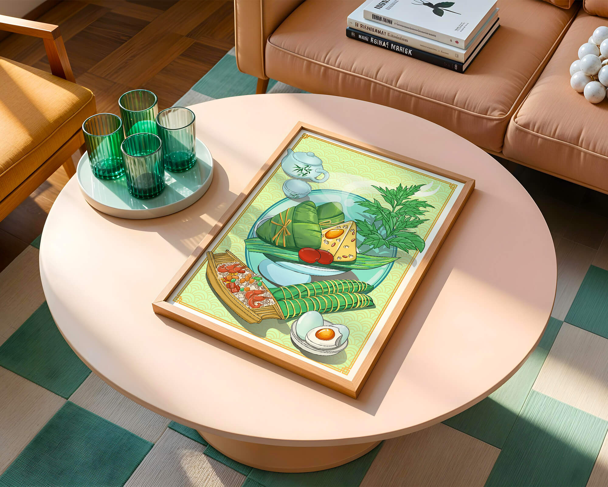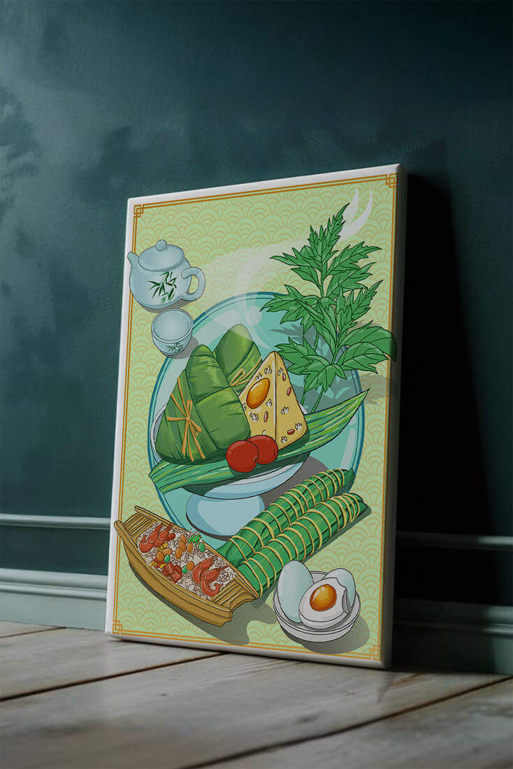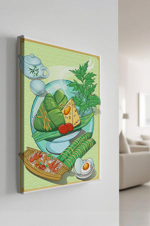 The image beautifully depicts an array of Asian culinary delights, including leaf-wrapped rice, a piece of vibrant yellow cake with a salted egg, and a bamboo serving tray filled with shrimp and vegetables. The intricacy of the wrapped leaves and the enticing appearance of the food invoke a sense of traditional preparation and cultural significance.Complementing this display is a classic tea set with a teapot and cup embellished with bamboo motifs. Fresh herbs add a touch of greenery, visually enhancing the scene. The image brings together visual and cultural elements, making it perfect for those interested in food art and Asian traditions.