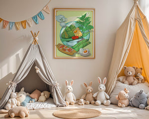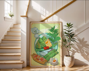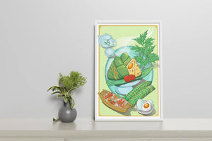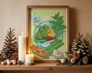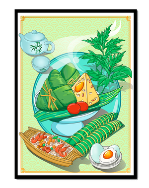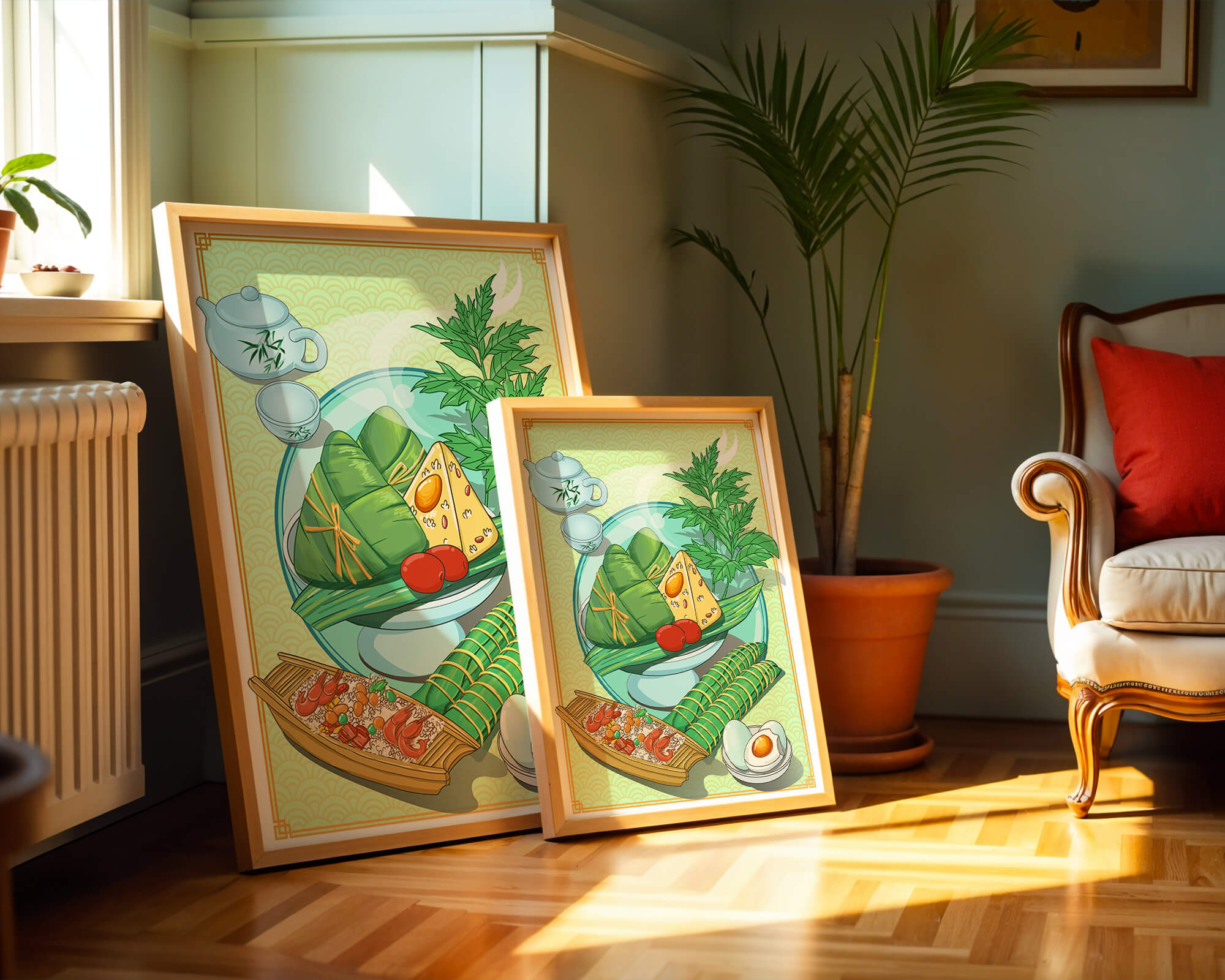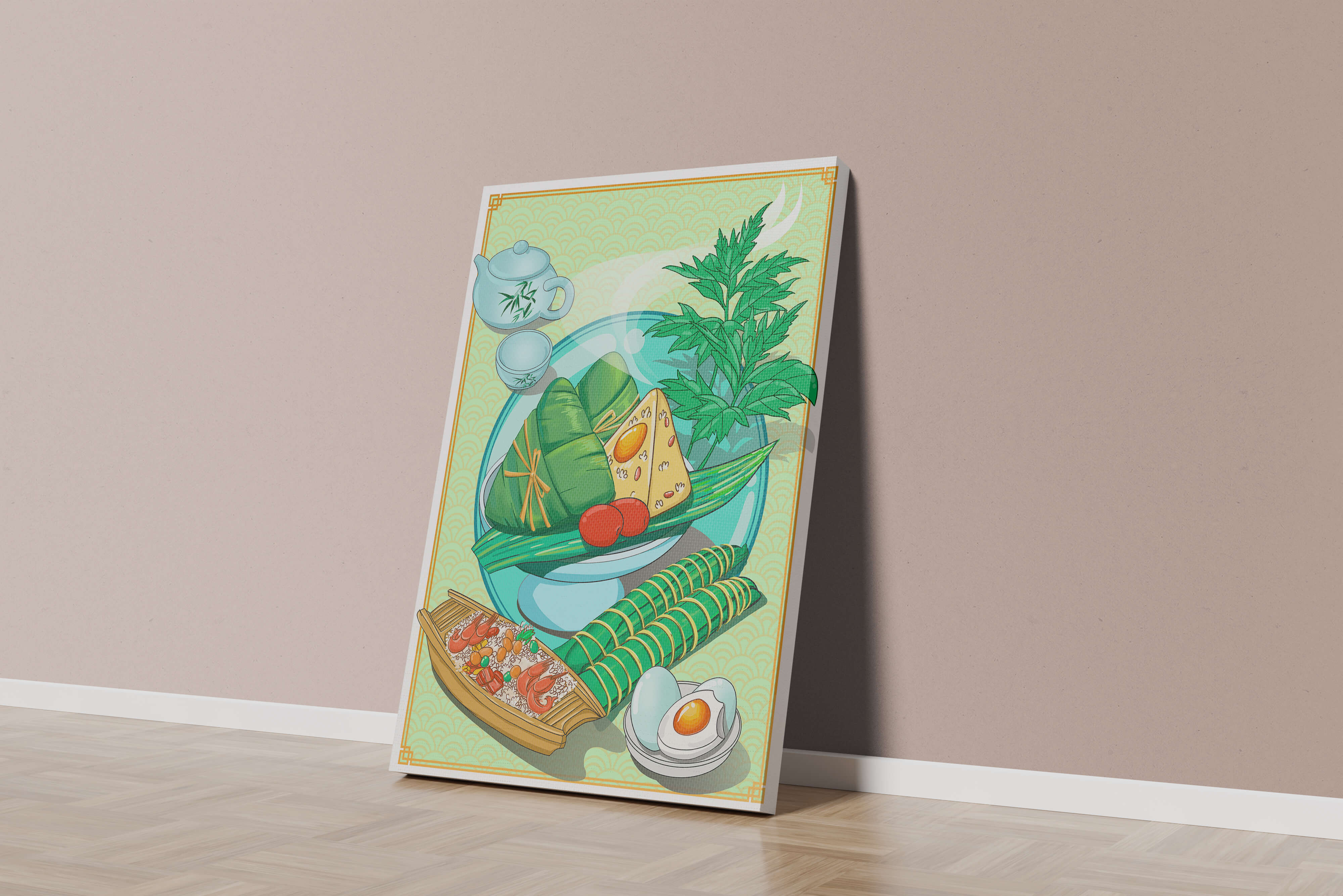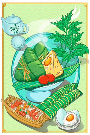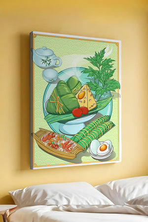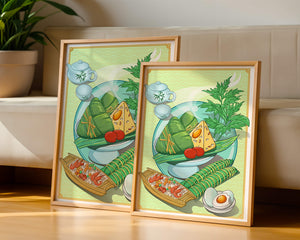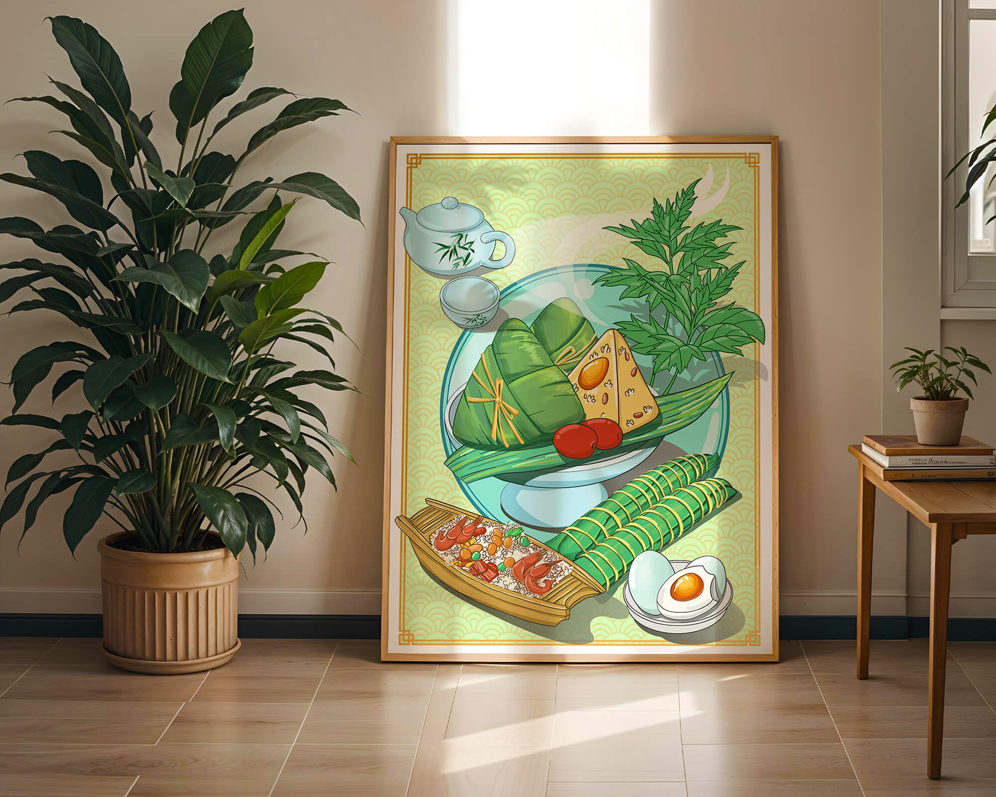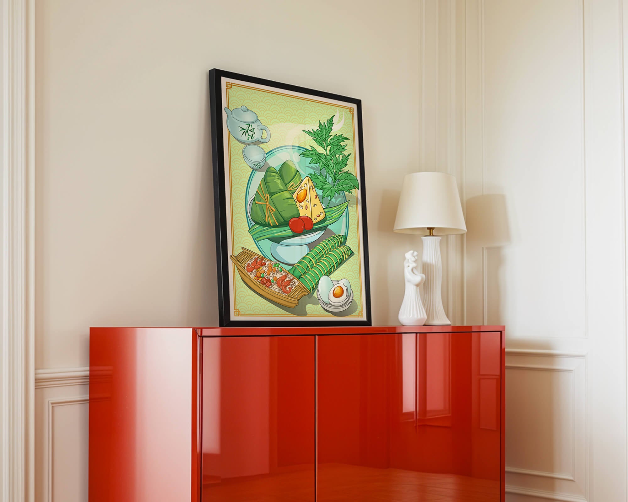 The image beautifully depicts an array of Asian culinary delights, including leaf-wrapped rice, a piece of vibrant yellow cake with a salted egg, and a bamboo serving tray filled with shrimp and vegetables. The intricacy of the wrapped leaves and the enticing appearance of the food invoke a sense of traditional preparation and cultural significance.Complementing this display is a classic tea set with a teapot and cup embellished with bamboo motifs. Fresh herbs add a touch of greenery, visually enhancing the scene. The image brings together visual and cultural elements, making it perfect for those interested in food art and Asian traditions.