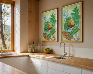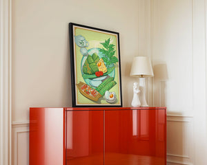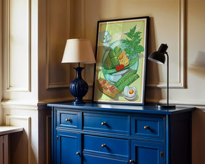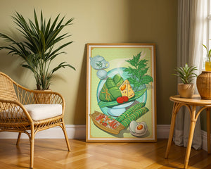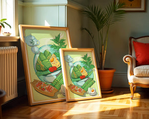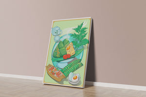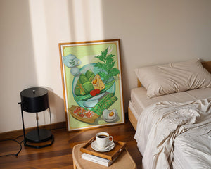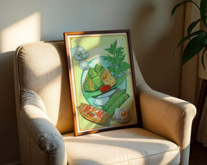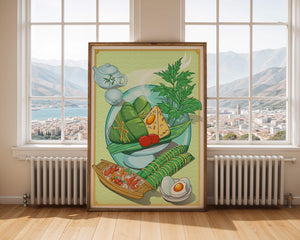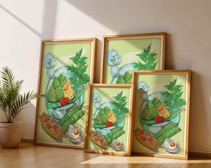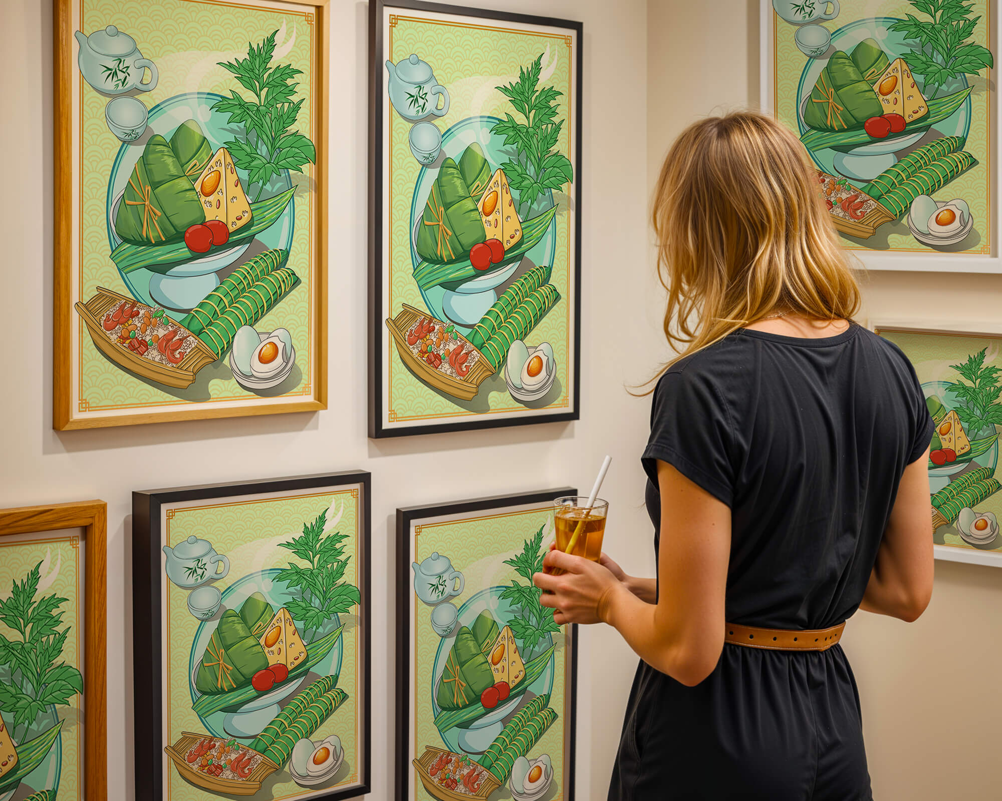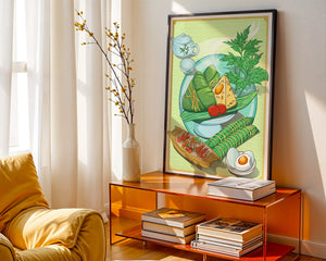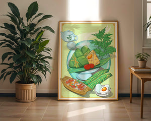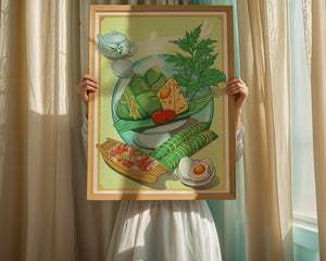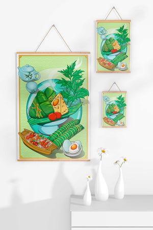 This captivating image captures the essence of traditional Asian cuisine with intricate illustrations of various dishes and elements. The vibrant colors and detailed design make it an eye-catching representation of cultural food artistry.