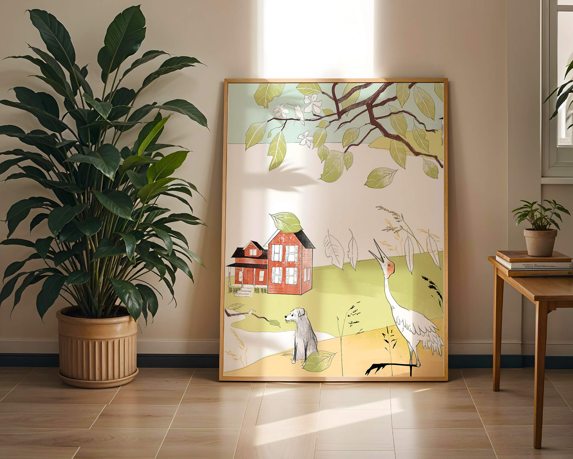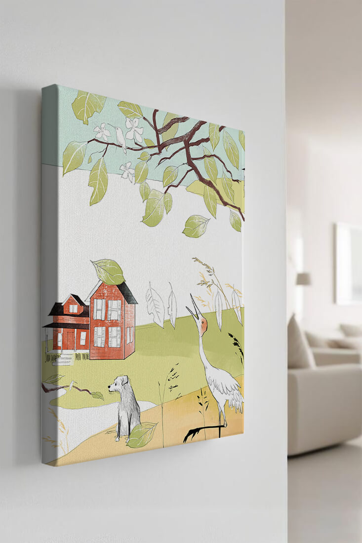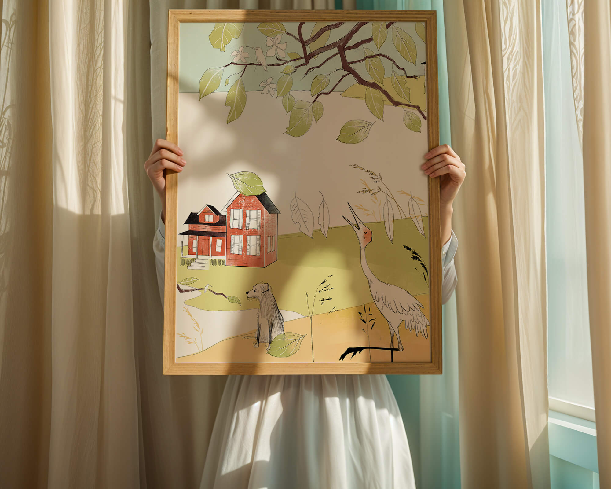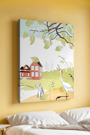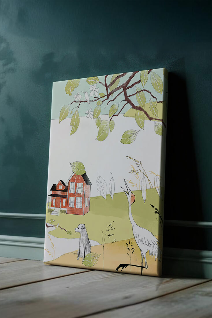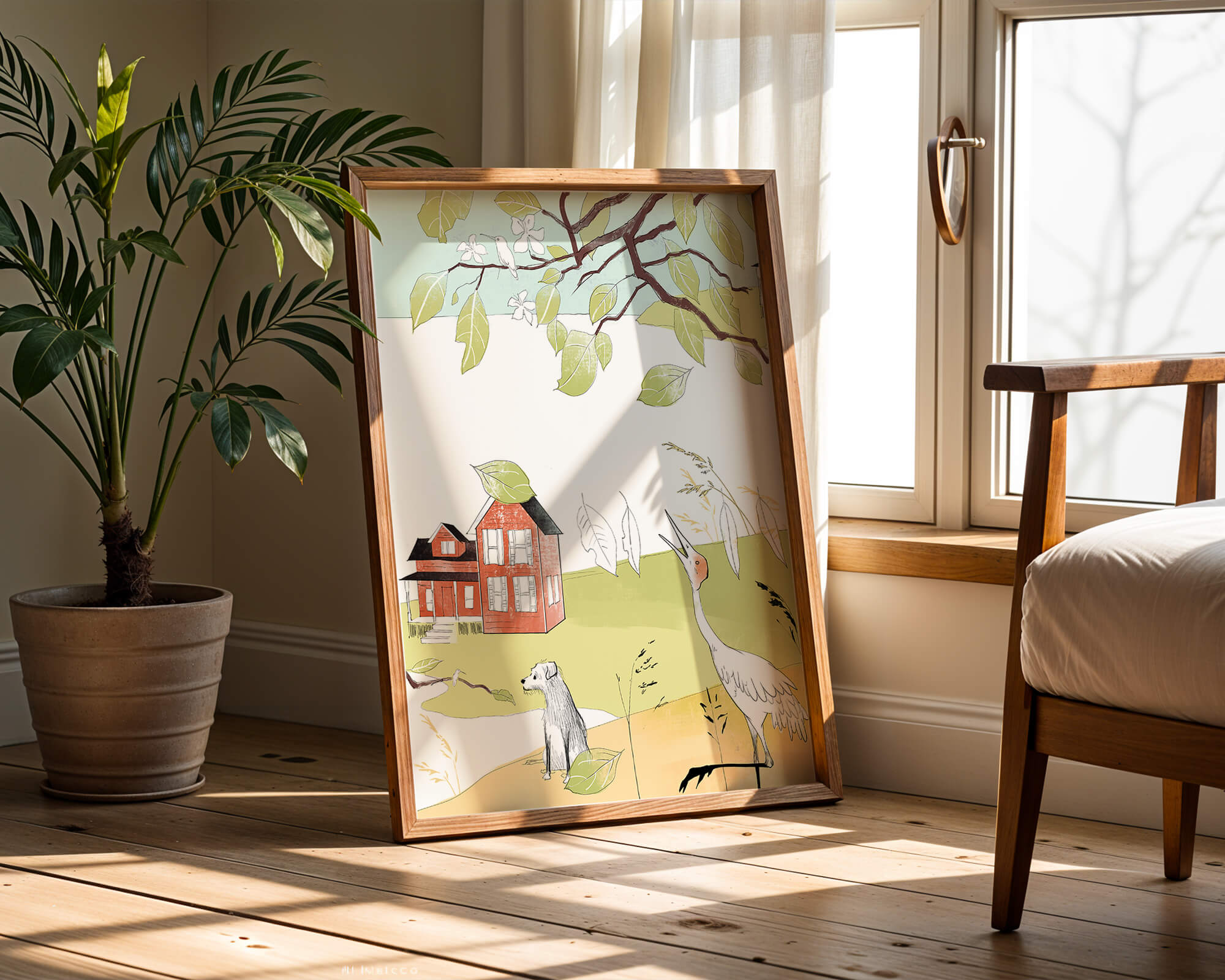 The image captures a picturesque setting where a rustic red house sits amidst rolling green fields. A dog is seen calmly observing the surroundings, adding a touch of life and warmth to the scene. Nearby, a graceful crane stands, contributing to the ethereal quality of the backdrop. The upper part of the image is adorned with large, delicate leaves swaying in the breeze, and a branch with a solitary bird rests above, symbolizing tranquility. This composition reflects a serene country environment, inviting viewers to imagine the gentle sounds of nature and imagine themselves in such a peaceful locale.| Type |