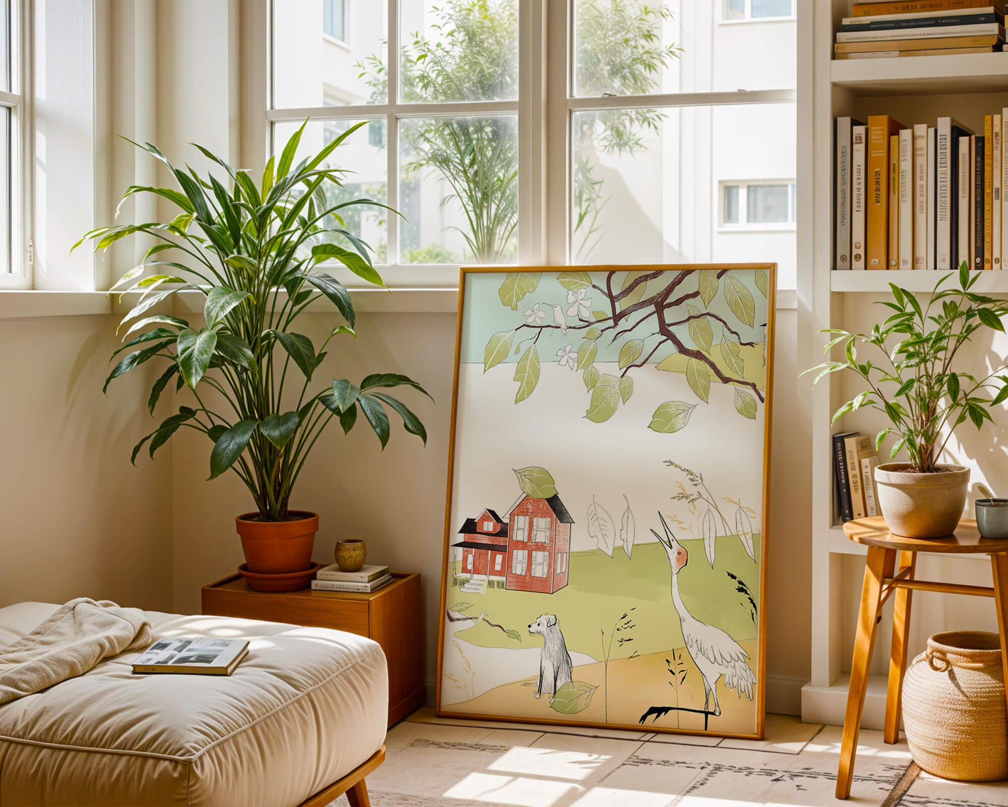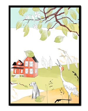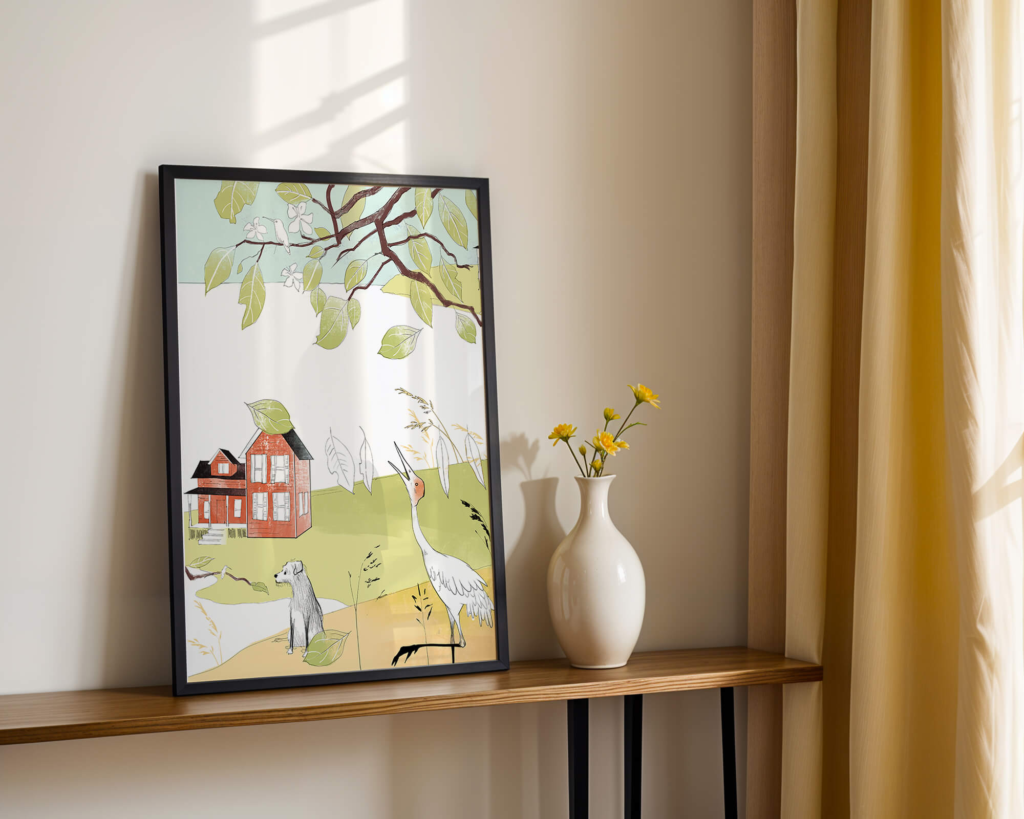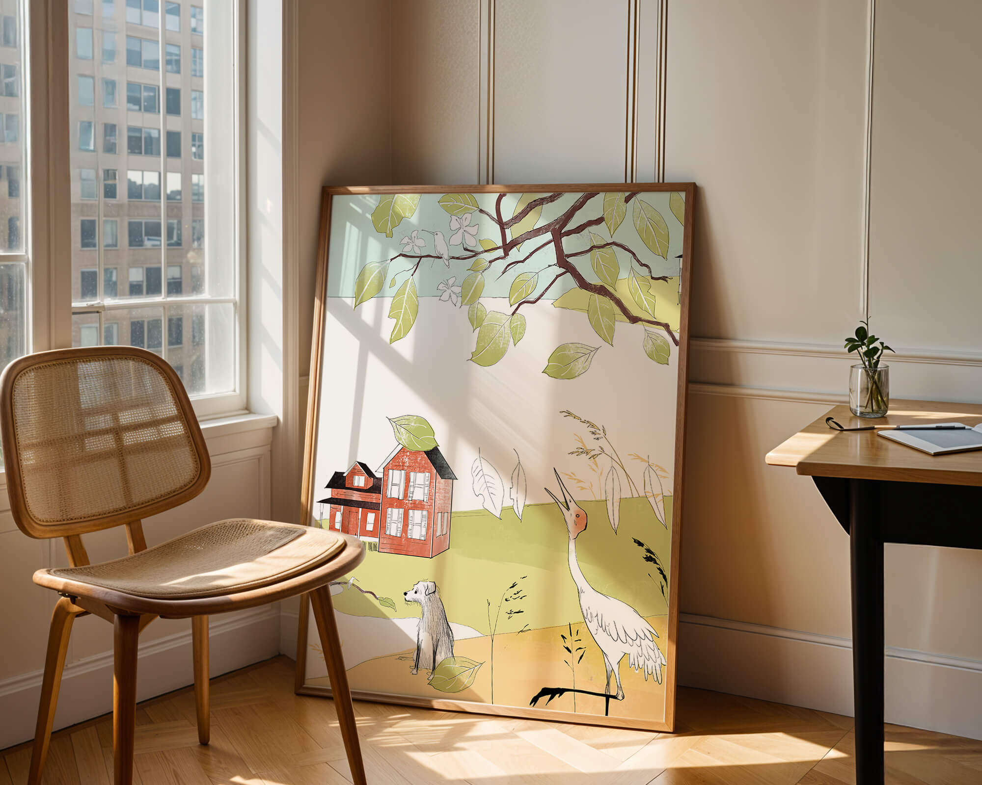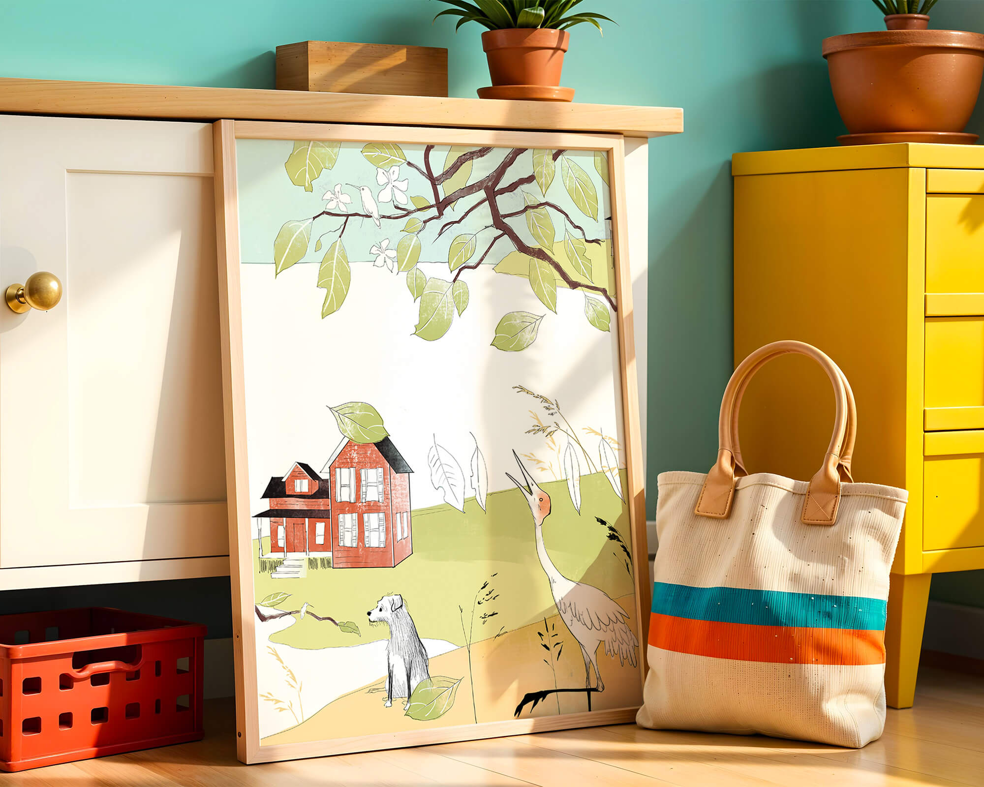 The image captures a picturesque setting where a rustic red house sits amidst rolling green fields. A dog is seen calmly observing the surroundings, adding a touch of life and warmth to the scene. Nearby, a graceful crane stands, contributing to the ethereal quality of the backdrop. The upper part of the image is adorned with large, delicate leaves swaying in the breeze, and a branch with a solitary bird rests above, symbolizing tranquility. This composition reflects a serene country environment, inviting viewers to imagine the gentle sounds of nature and imagine themselves in such a peaceful locale.| Type |