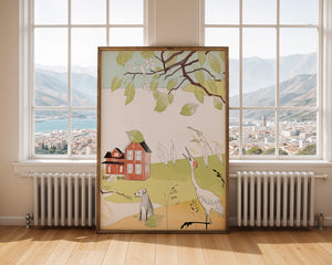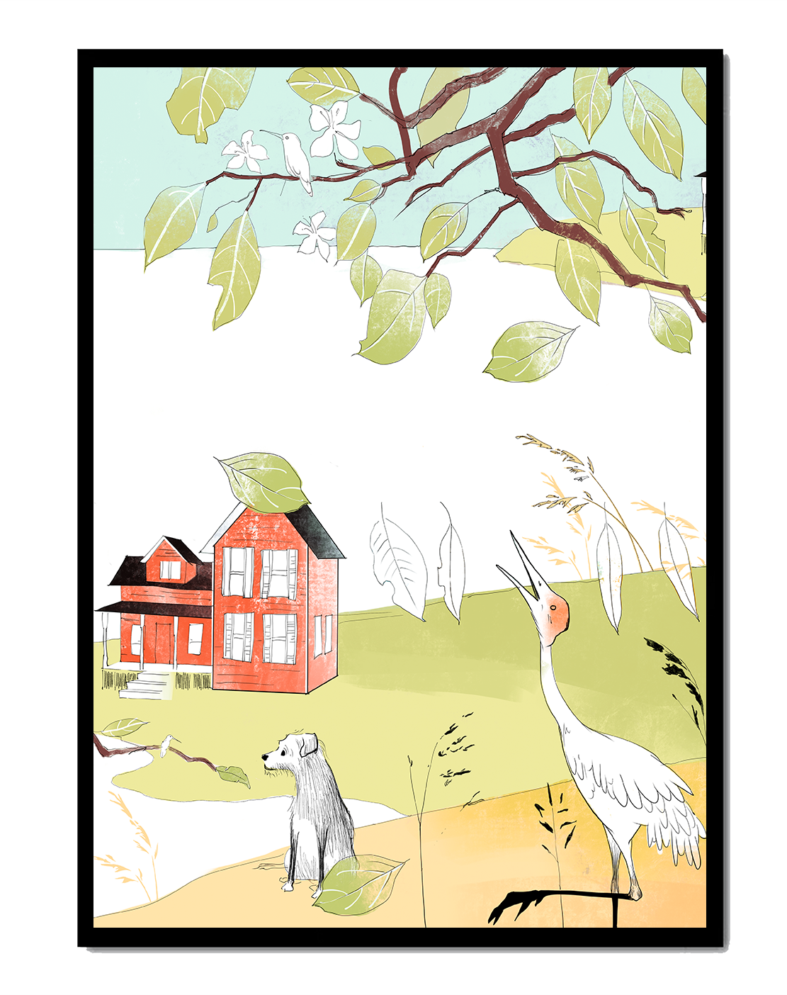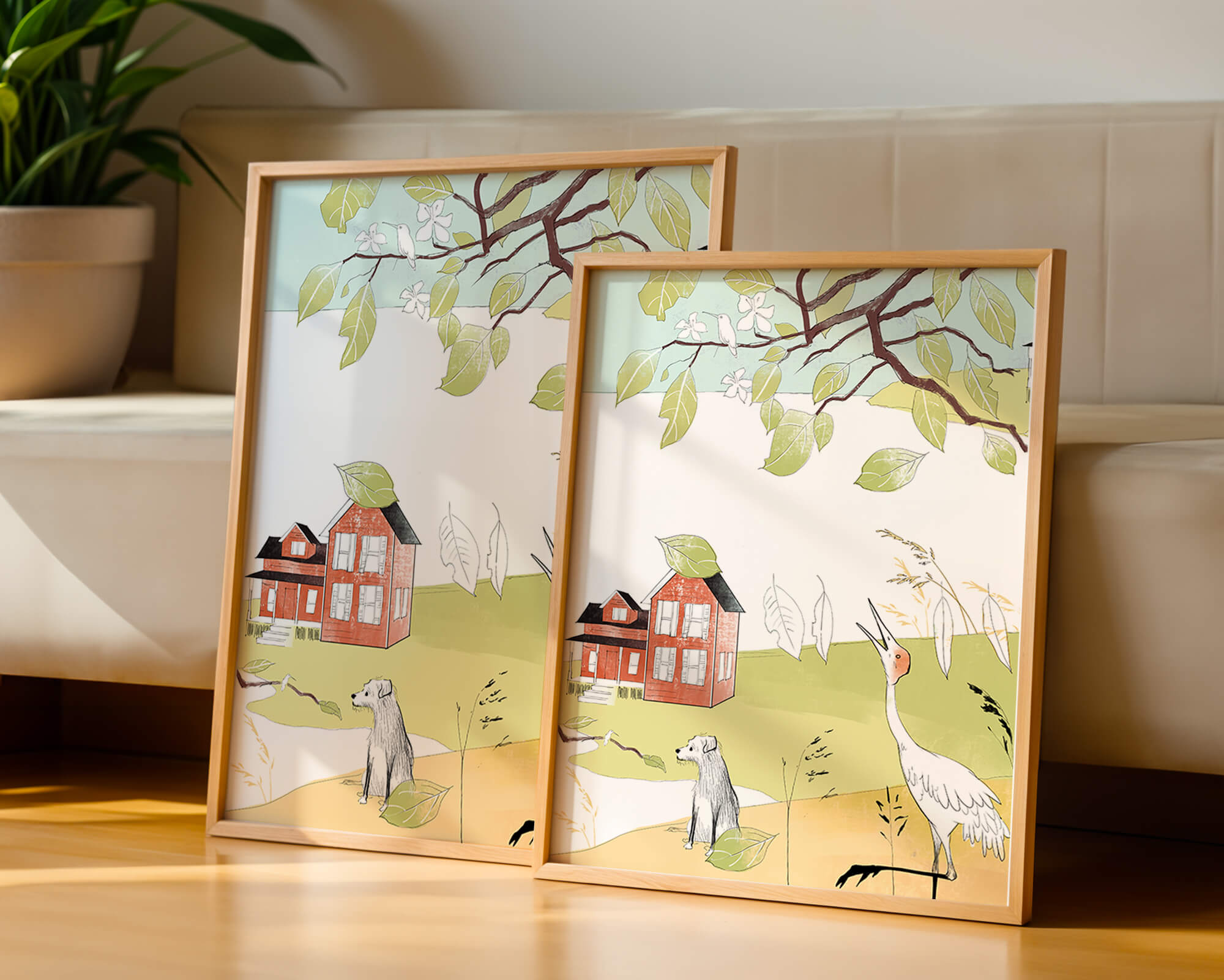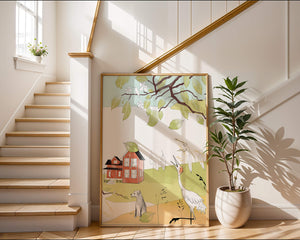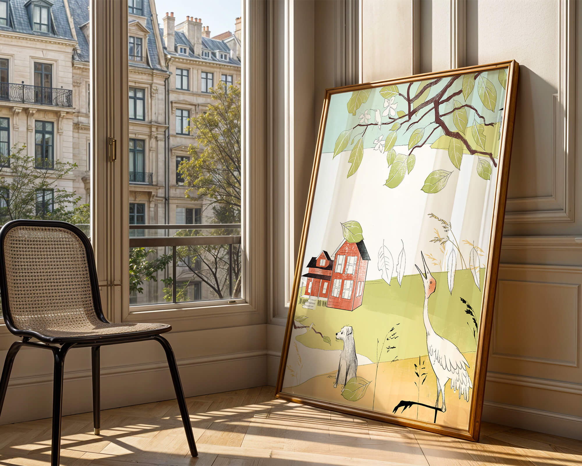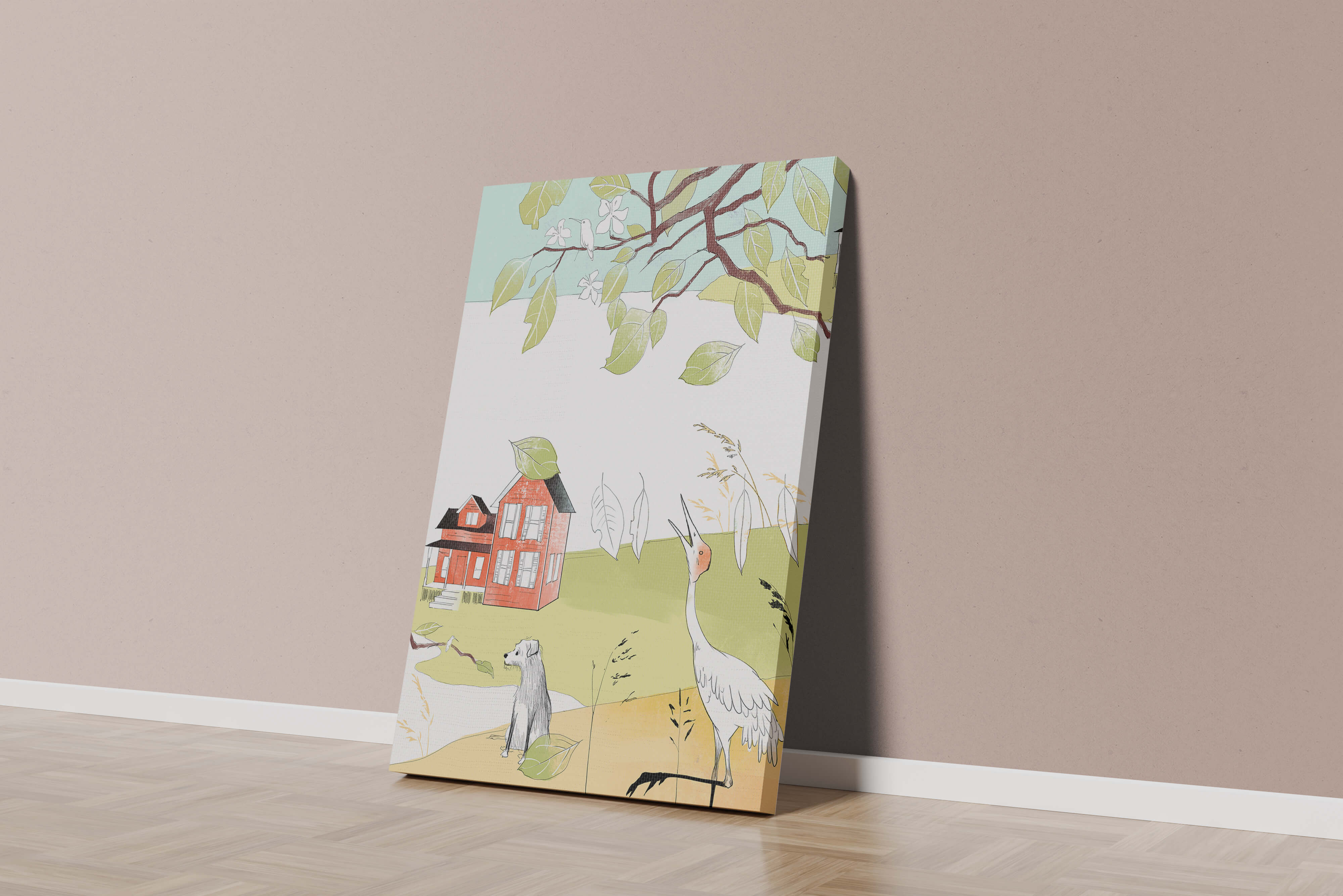 The image captures a picturesque setting where a rustic red house sits amidst rolling green fields. A dog is seen calmly observing the surroundings, adding a touch of life and warmth to the scene. Nearby, a graceful crane stands, contributing to the ethereal quality of the backdrop. The upper part of the image is adorned with large, delicate leaves swaying in the breeze, and a branch with a solitary bird rests above, symbolizing tranquility. This composition reflects a serene country environment, inviting viewers to imagine the gentle sounds of nature and imagine themselves in such a peaceful locale.| Type |