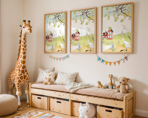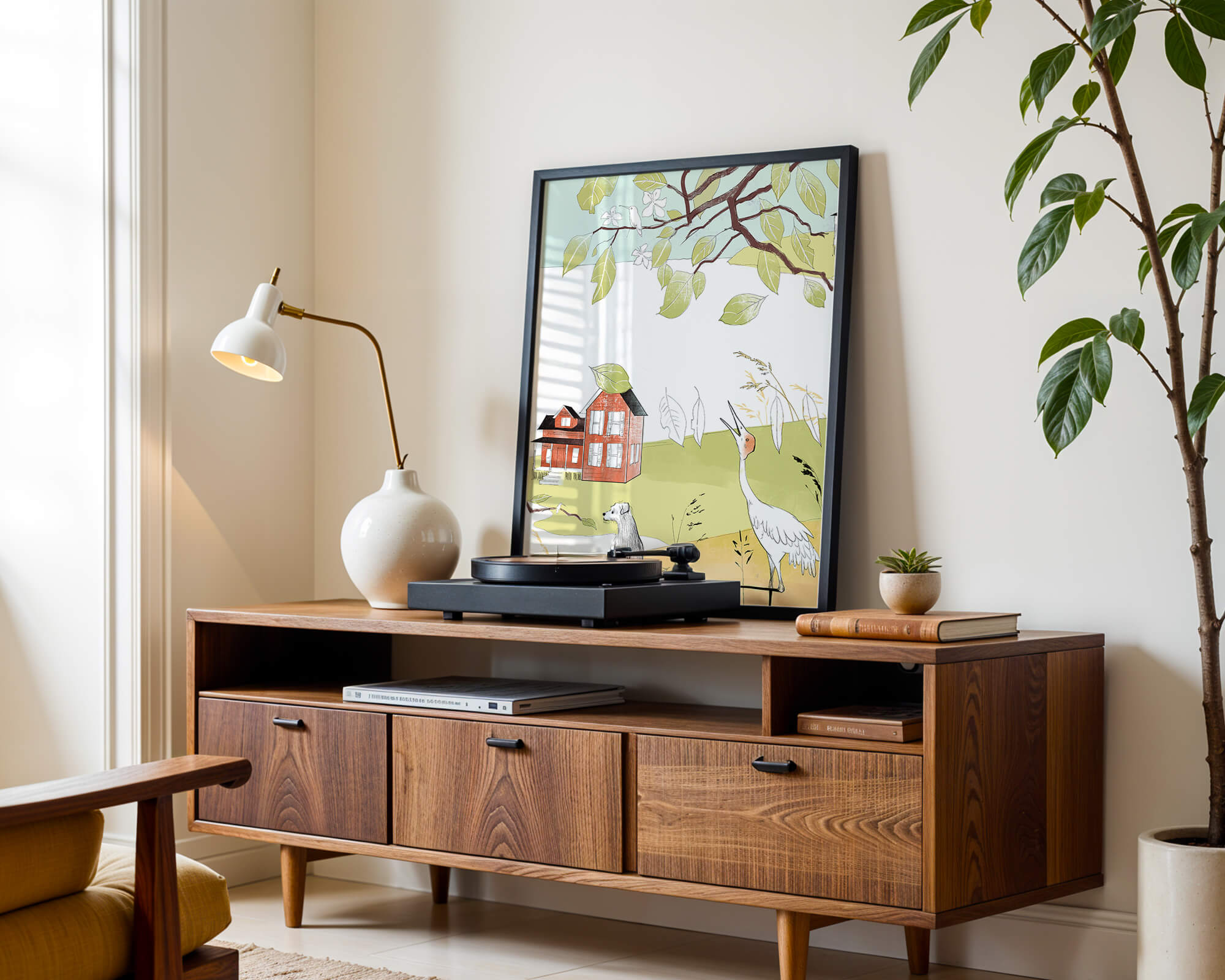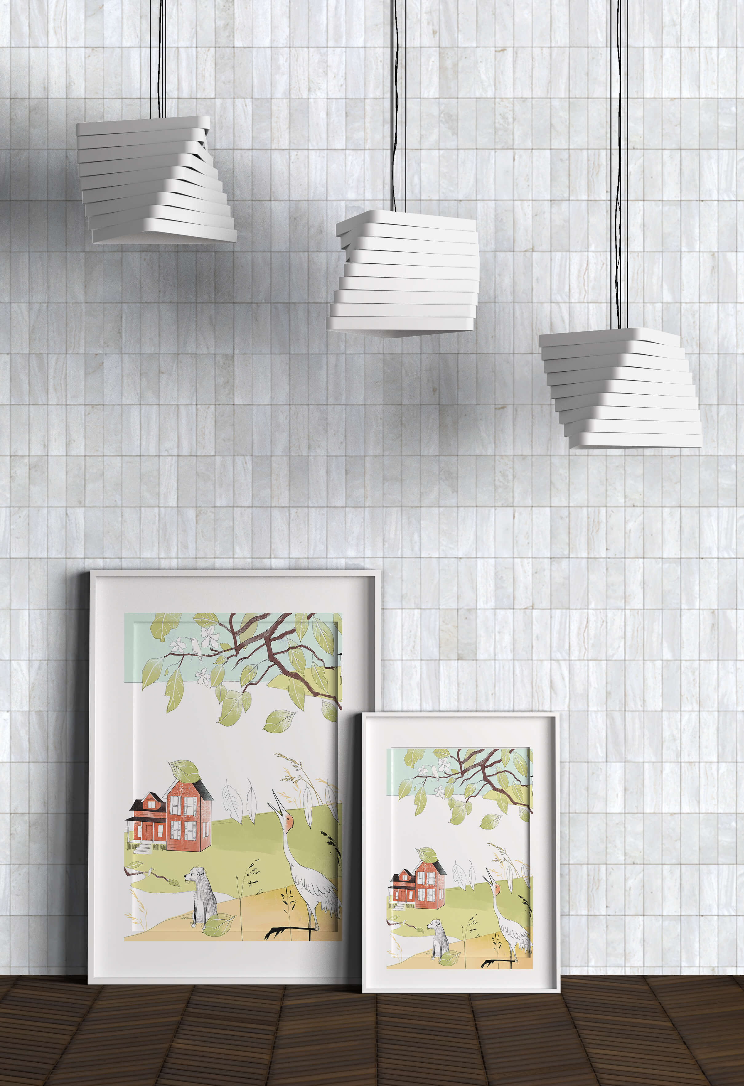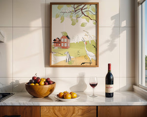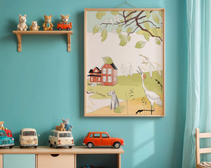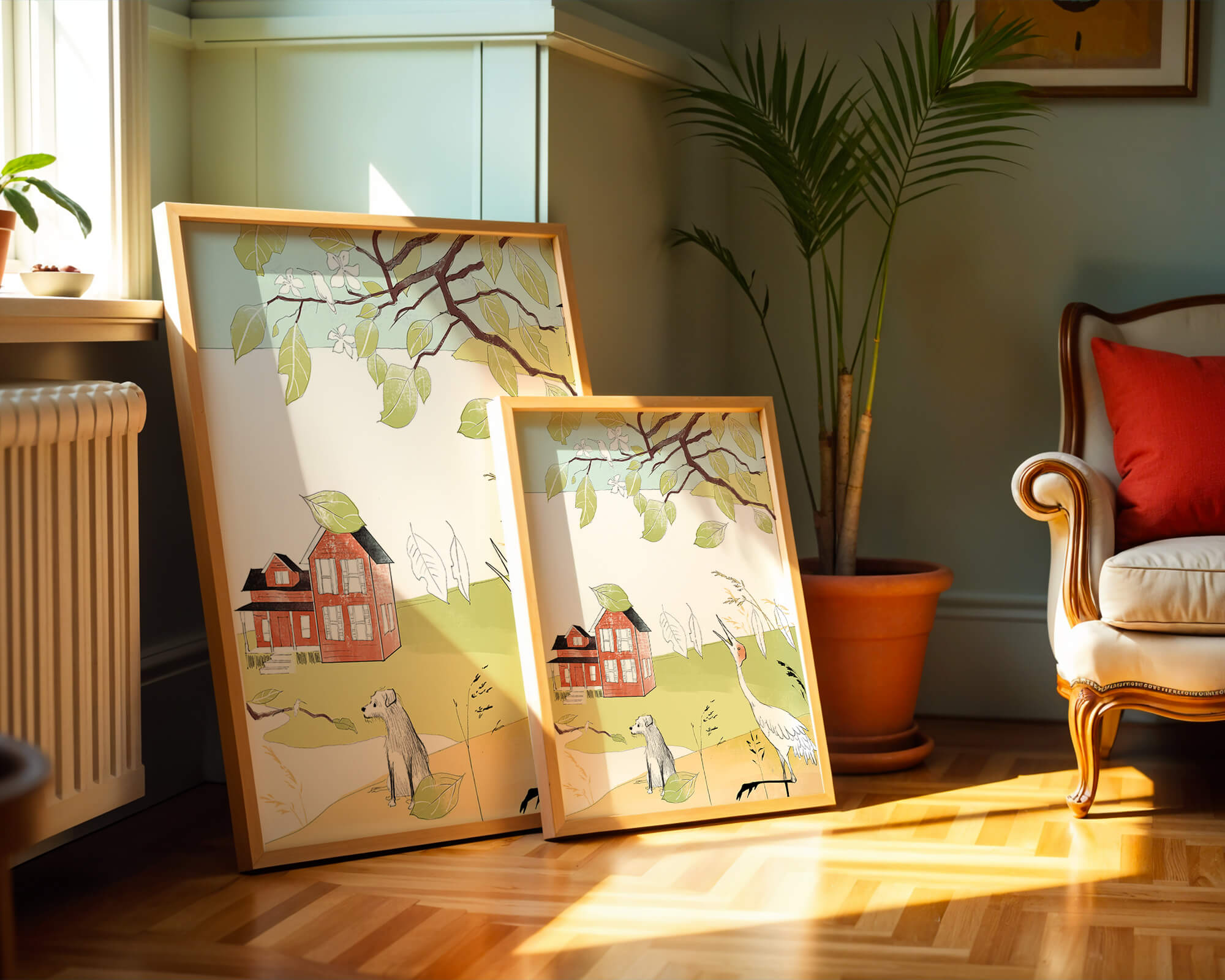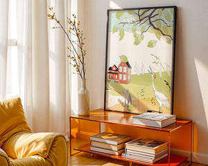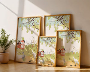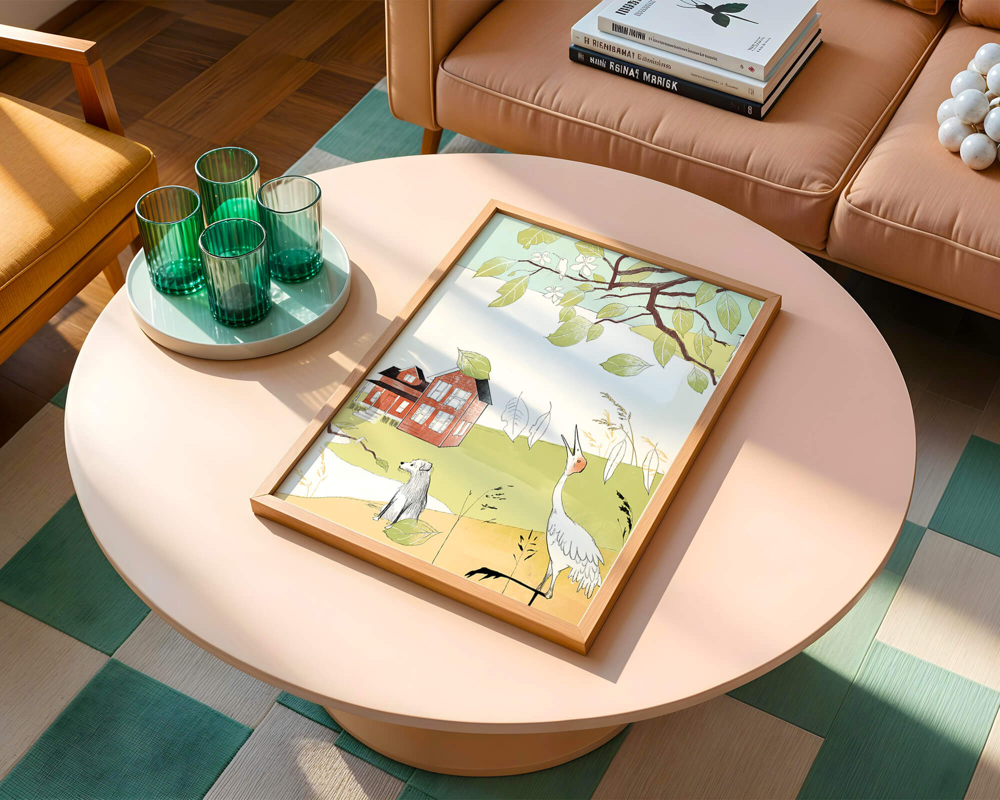 The image captures a picturesque setting where a rustic red house sits amidst rolling green fields. A dog is seen calmly observing the surroundings, adding a touch of life and warmth to the scene. Nearby, a graceful crane stands, contributing to the ethereal quality of the backdrop. The upper part of the image is adorned with large, delicate leaves swaying in the breeze, and a branch with a solitary bird rests above, symbolizing tranquility. This composition reflects a serene country environment, inviting viewers to imagine the gentle sounds of nature and imagine themselves in such a peaceful locale.| Type |