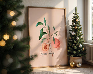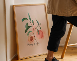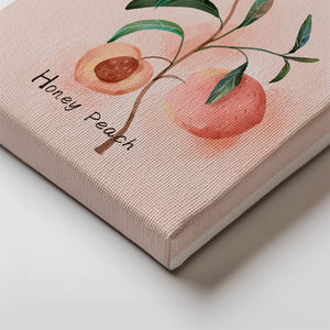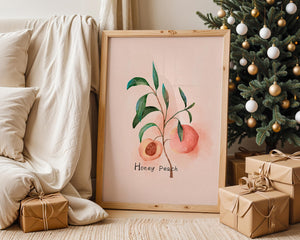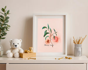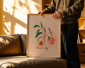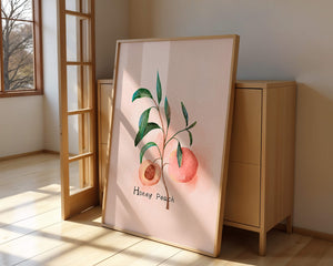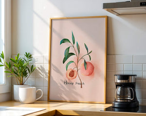 This delightful watercolor depiction captures the essence of a honey peach surrounded by lush green leaves. Set against a light, pastel background, it offers a touch of elegance and calm to any space.