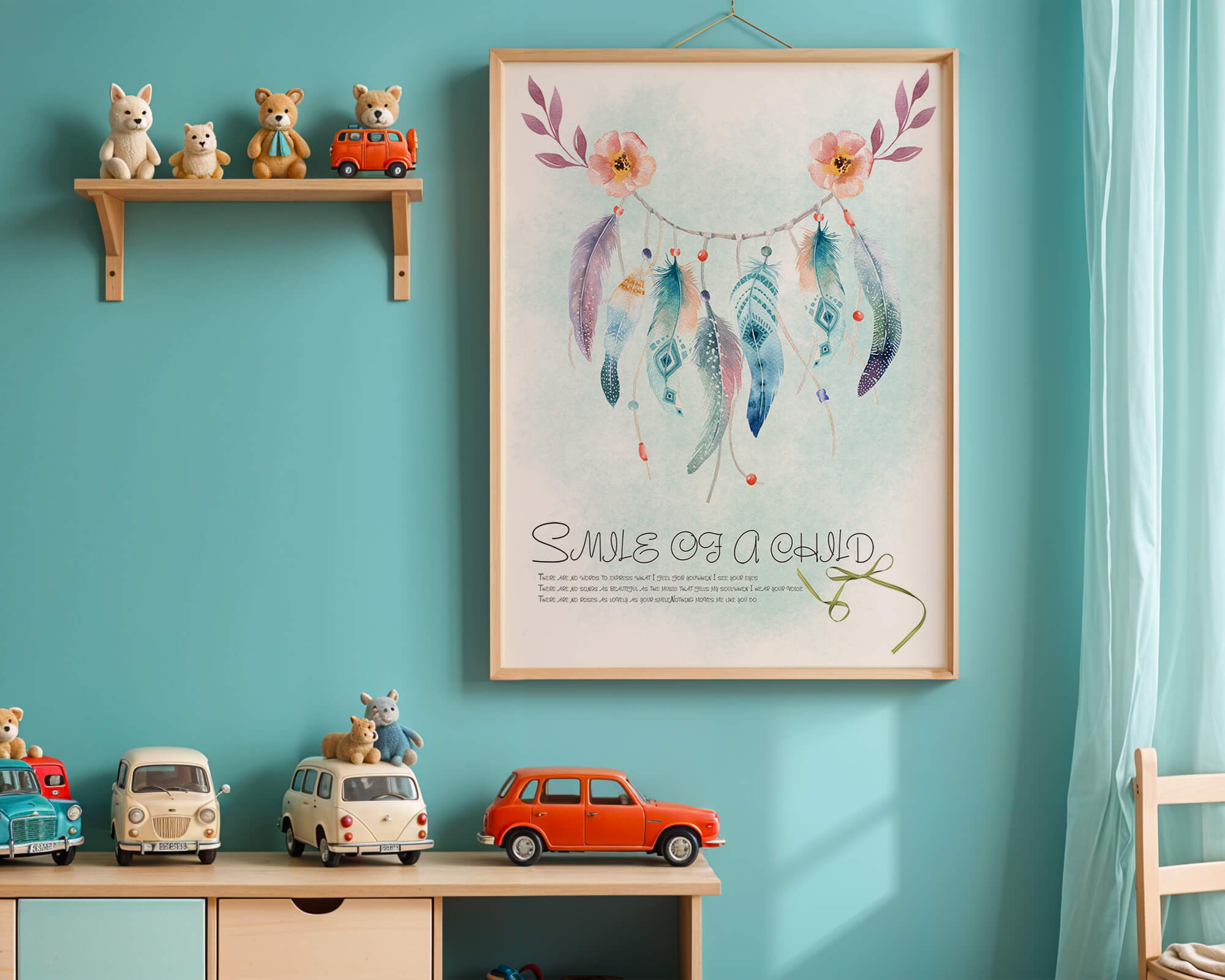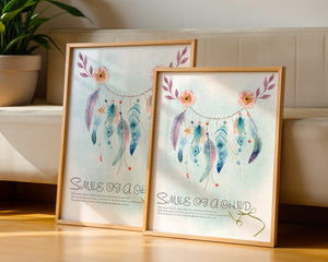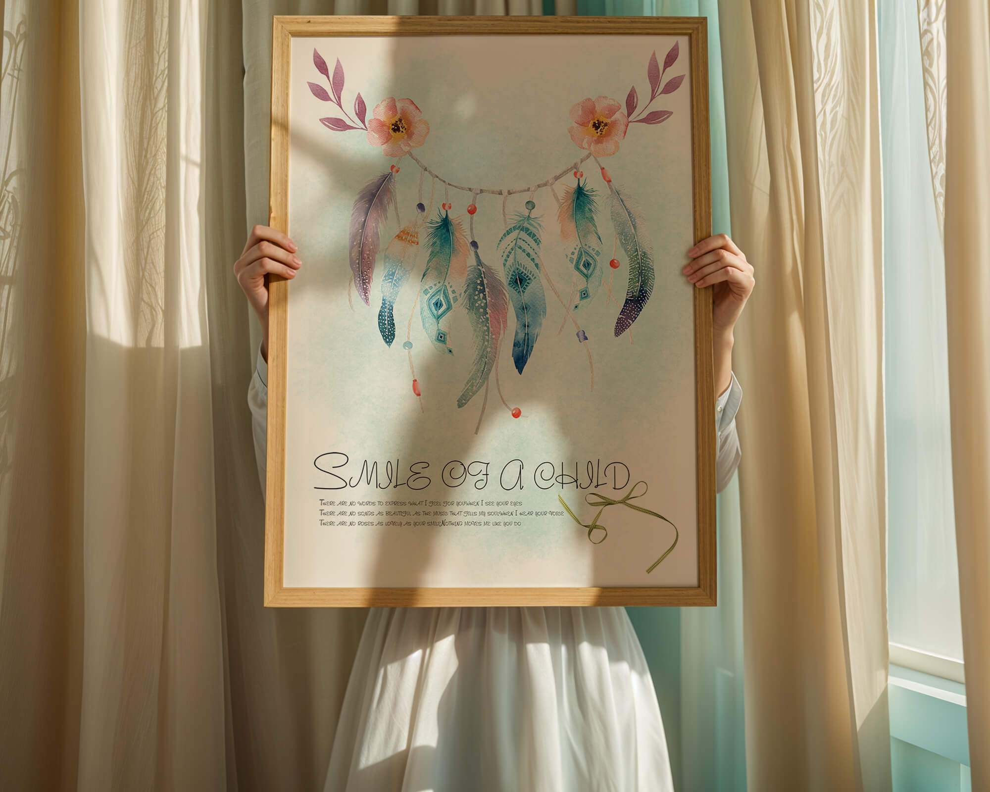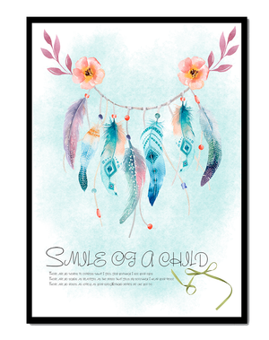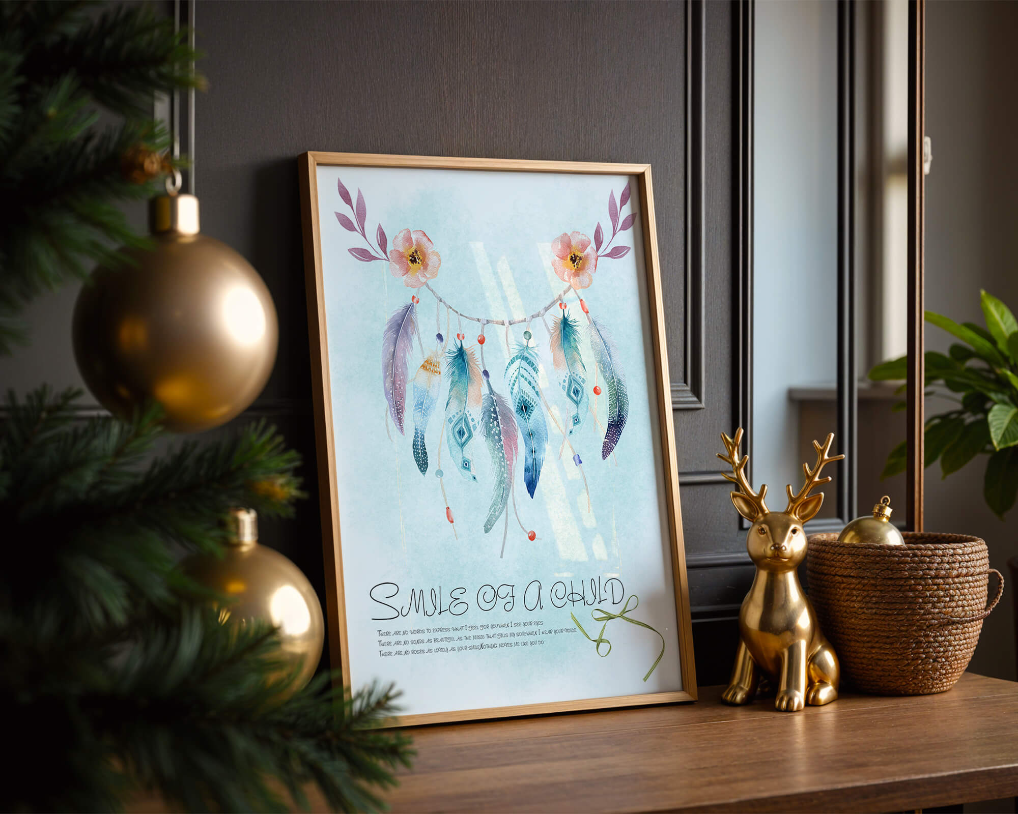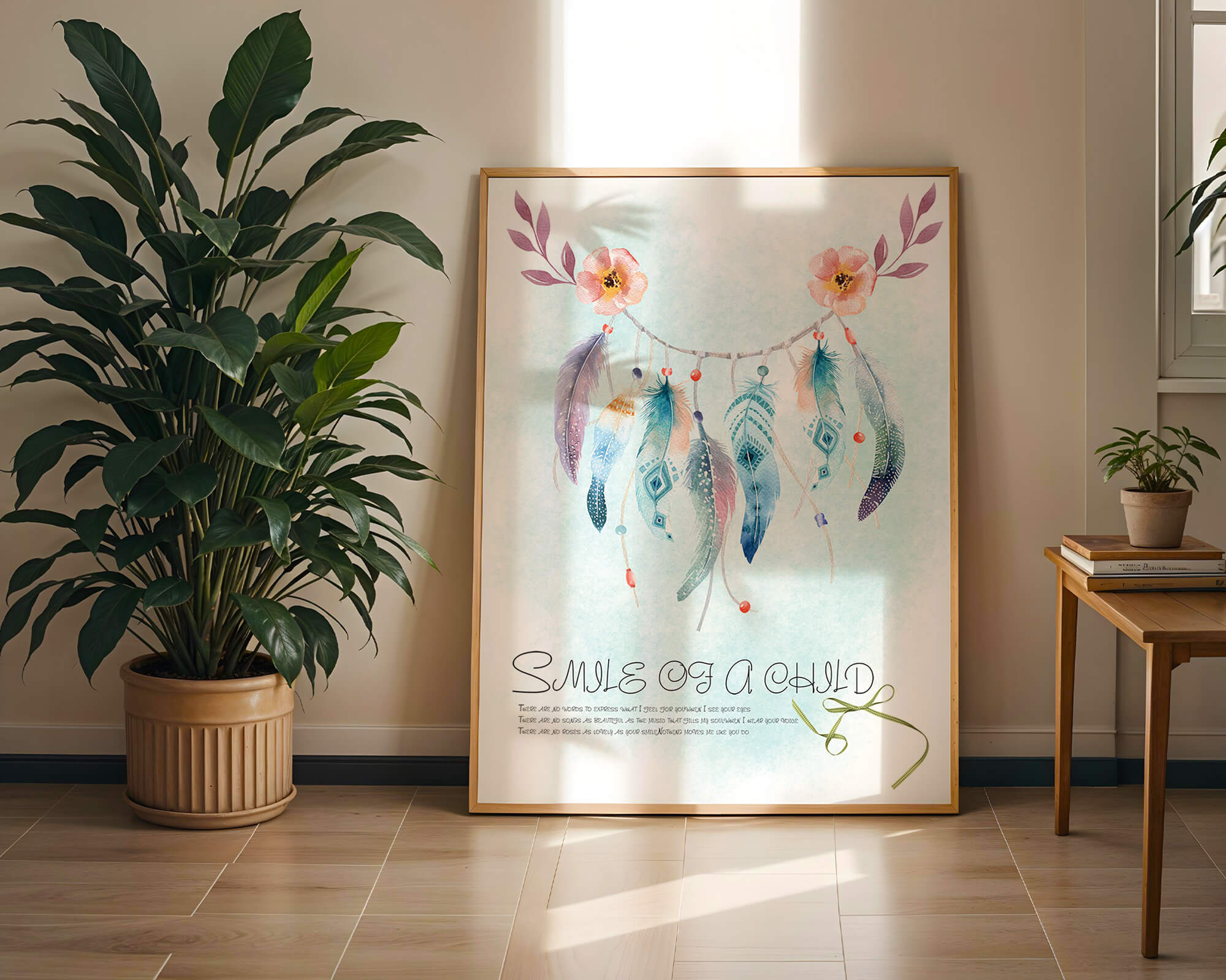 In this enchanting artwork, a string of delicate feathers hangs gracefully, each adorned with intricate patterns and soft hues of blue, purple, and orange. The feathers are interspersed with beads and are flanked by charming flowers, adding a touch of nature and tenderness to the piece. The arrangement creates a feeling of delight and wonder, making it an ideal addition to any space where an inspirational and calming ambiance is desired.The text below the dreamcatcher, "Smile of a Child," evokes sentiments of innocence and joy, further enhancing the images warmth and appeal. This illustration captures the essence of childhood happiness, making it a lovely gift for a new parent or as a focal piece in a cozy| Type |
