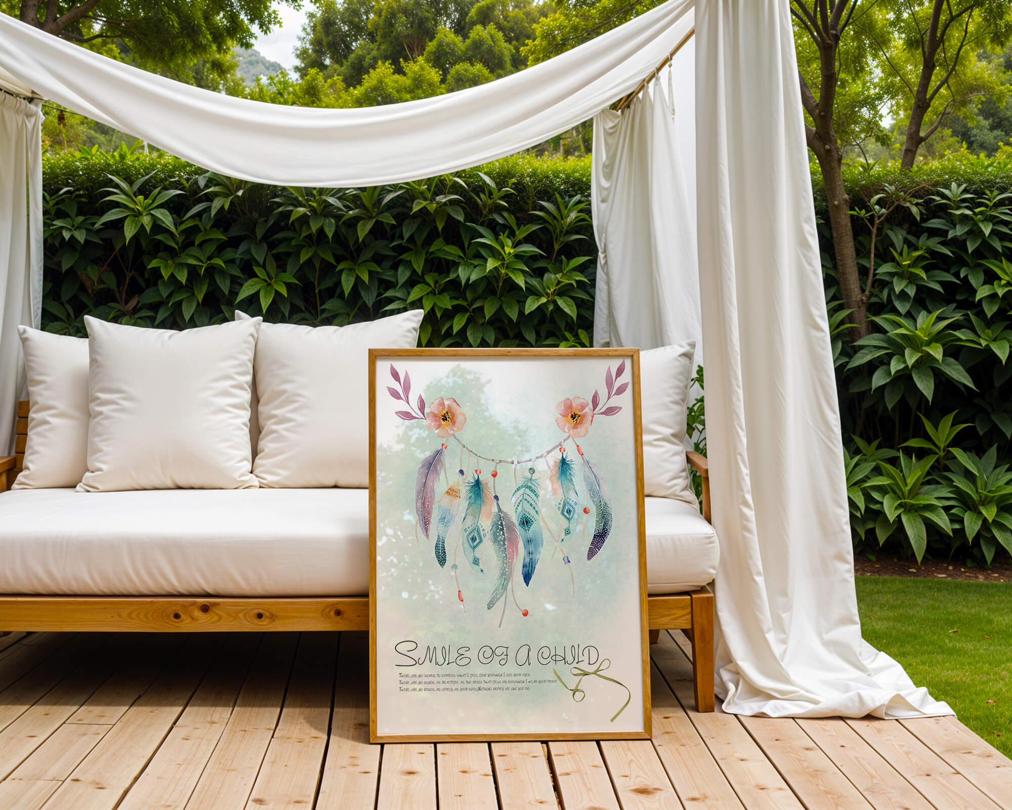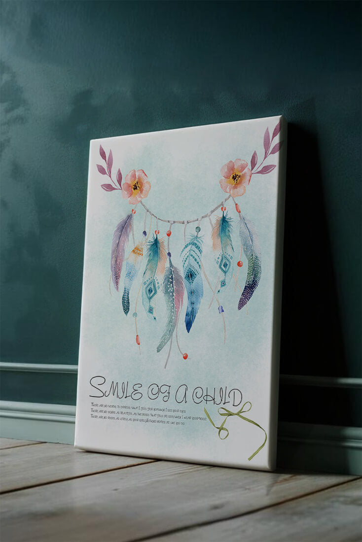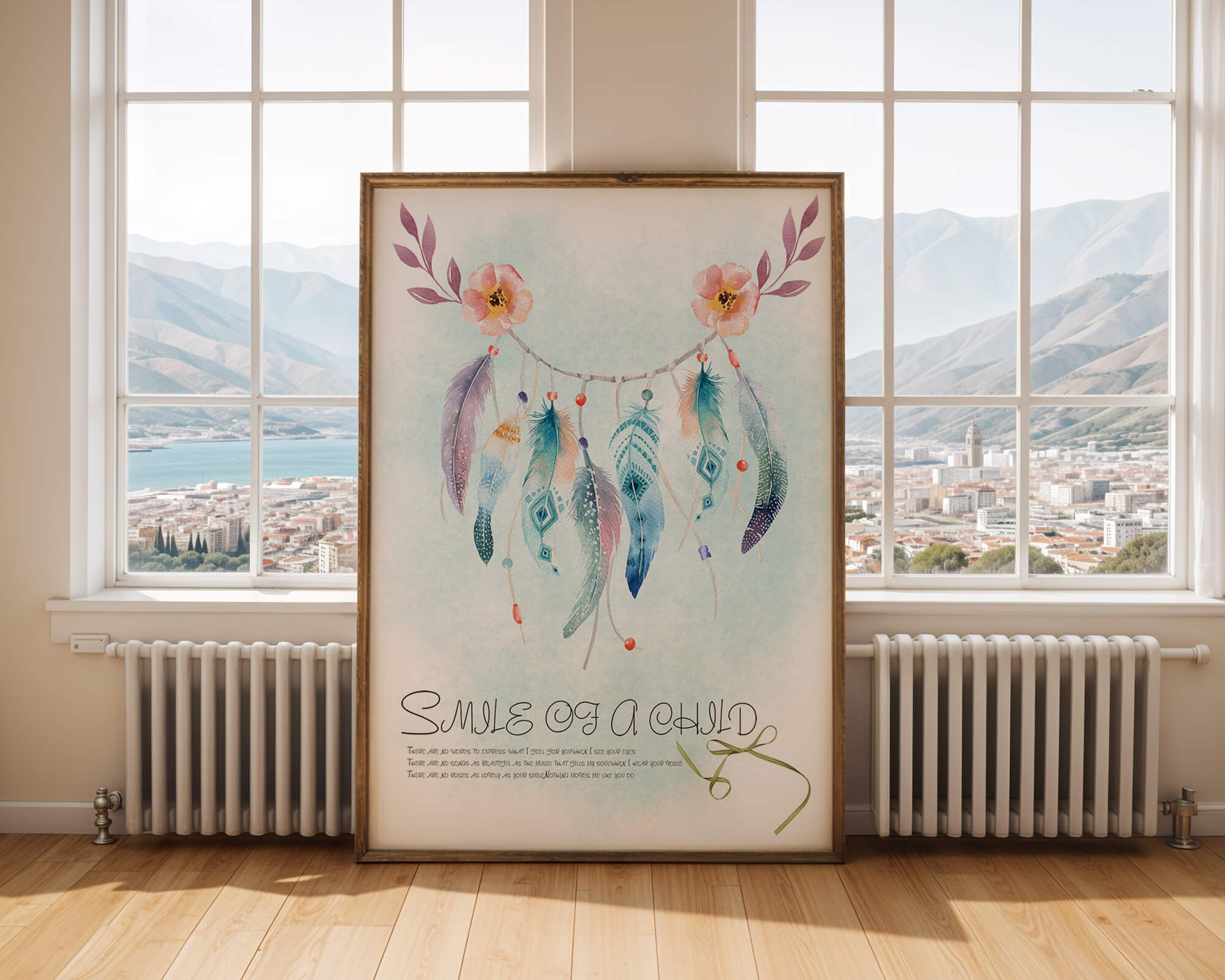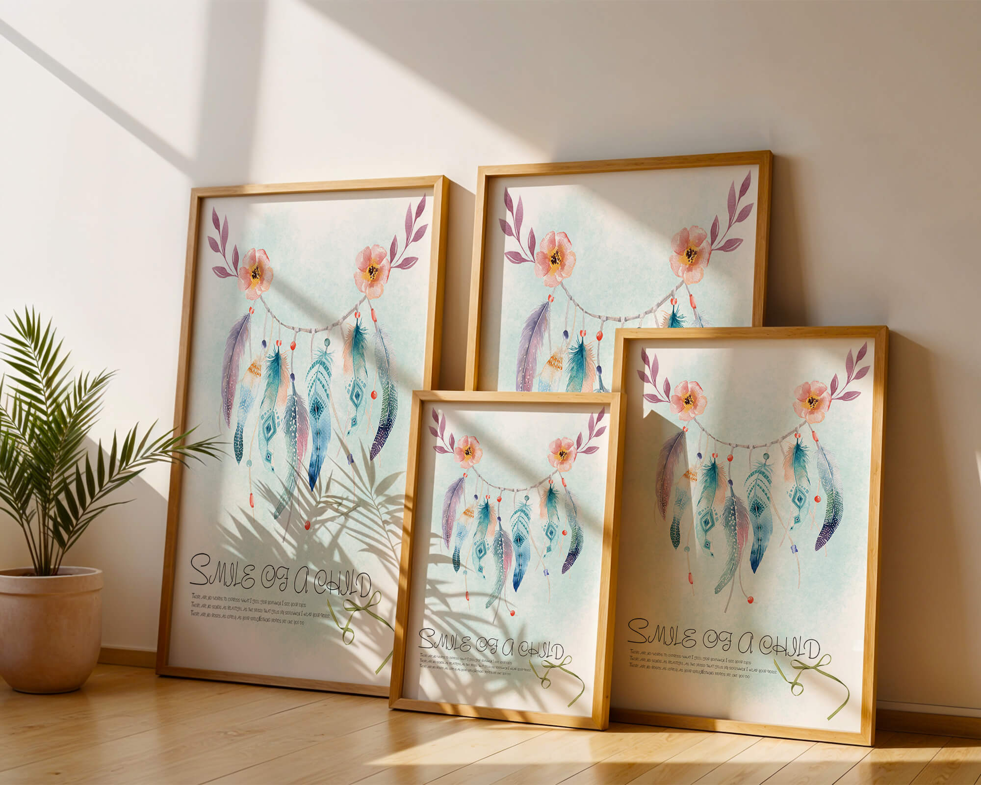 In this enchanting artwork, a string of delicate feathers hangs gracefully, each adorned with intricate patterns and soft hues of blue, purple, and orange. The feathers are interspersed with beads and are flanked by charming flowers, adding a touch of nature and tenderness to the piece. The arrangement creates a feeling of delight and wonder, making it an ideal addition to any space where an inspirational and calming ambiance is desired.The text below the dreamcatcher, "Smile of a Child," evokes sentiments of innocence and joy, further enhancing the images warmth and appeal. This illustration captures the essence of childhood happiness, making it a lovely gift for a new parent or as a focal piece in a cozy| Type |