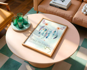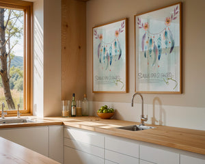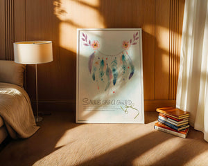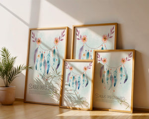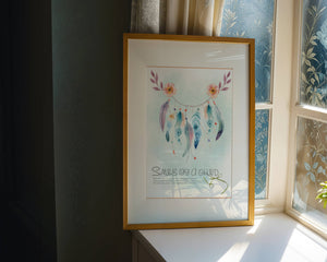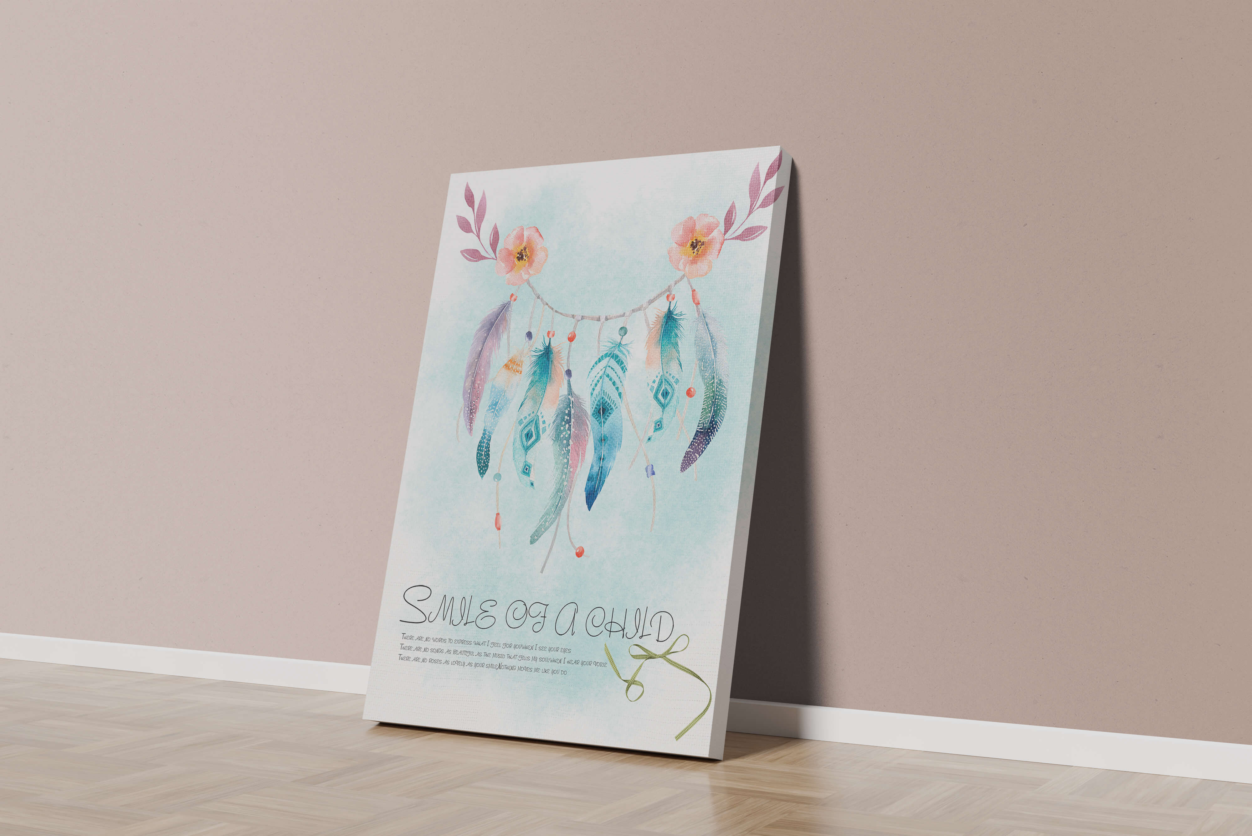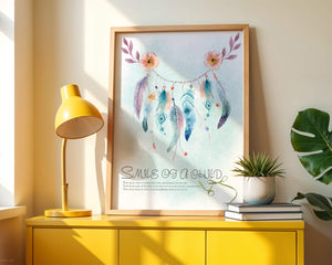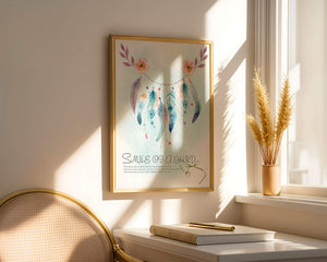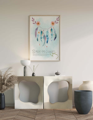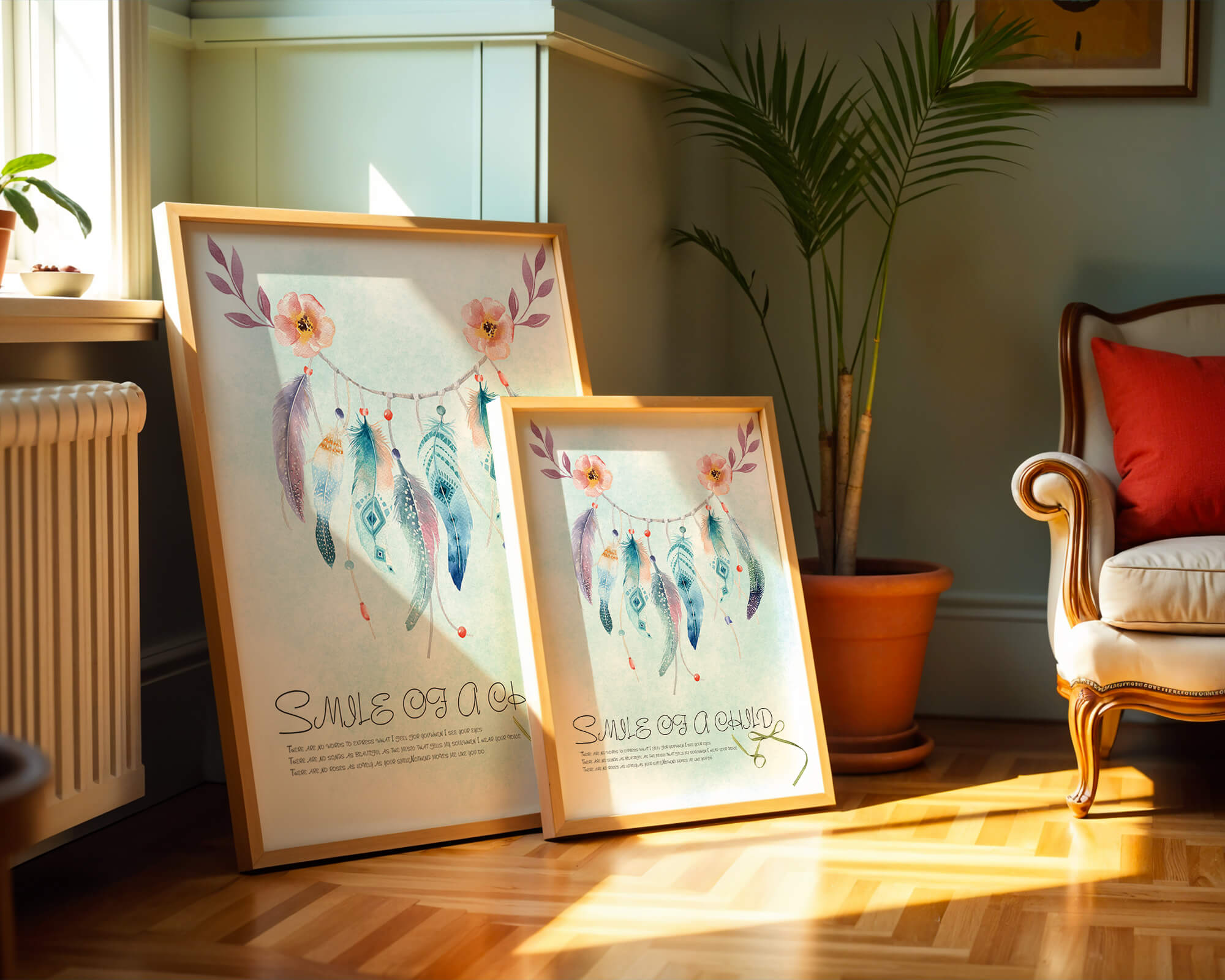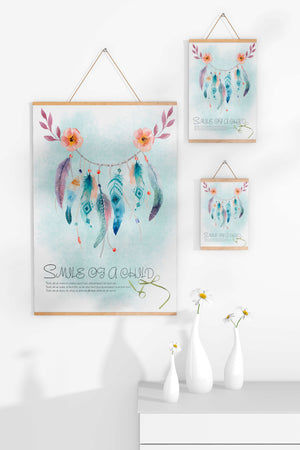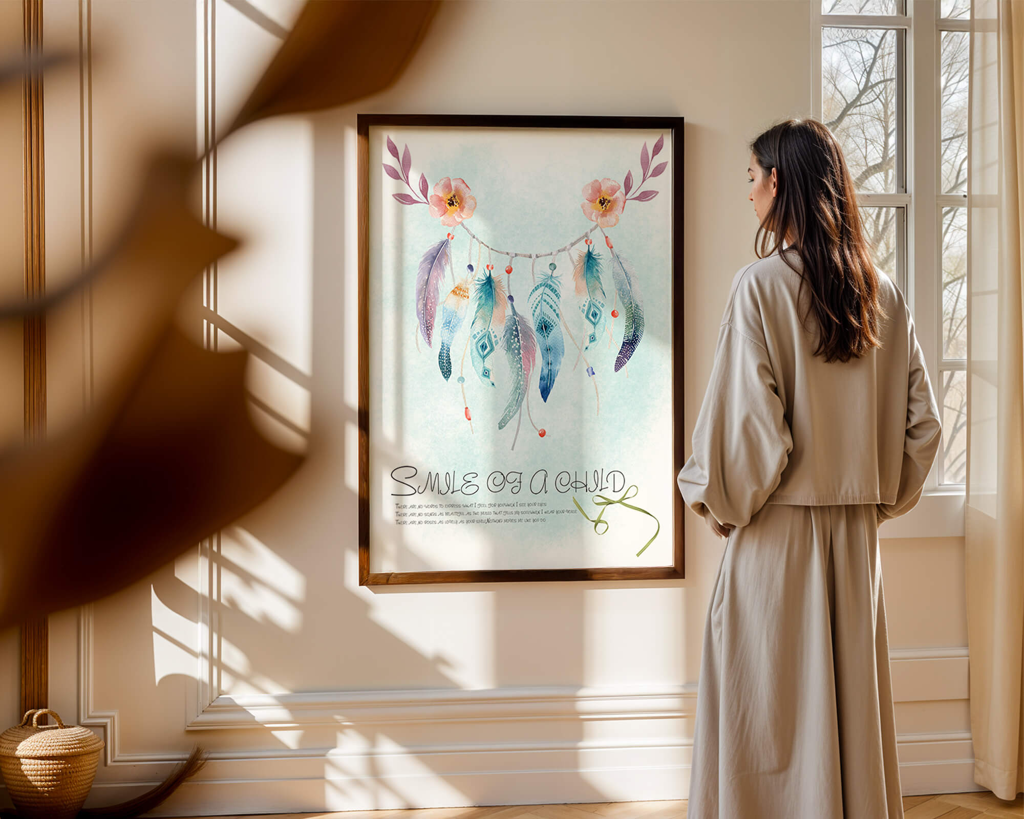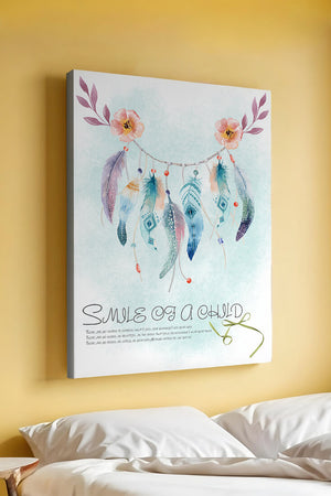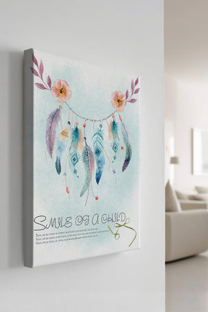 In this enchanting artwork, a string of delicate feathers hangs gracefully, each adorned with intricate patterns and soft hues of blue, purple, and orange. The feathers are interspersed with beads and are flanked by charming flowers, adding a touch of nature and tenderness to the piece. The arrangement creates a feeling of delight and wonder, making it an ideal addition to any space where an inspirational and calming ambiance is desired.The text below the dreamcatcher, "Smile of a Child," evokes sentiments of innocence and joy, further enhancing the images warmth and appeal. This illustration captures the essence of childhood happiness, making it a lovely gift for a new parent or as a focal piece in a cozy| Type |