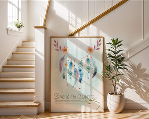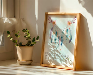 The image showcases a charming watercolor illustration featuring a dreamcatcher with an array of colorful feathers and delicate flowers. This whimsical design uses soft pastels to create a serene and uplifting atmosphere, perfect for decorating a childs room or nursery.