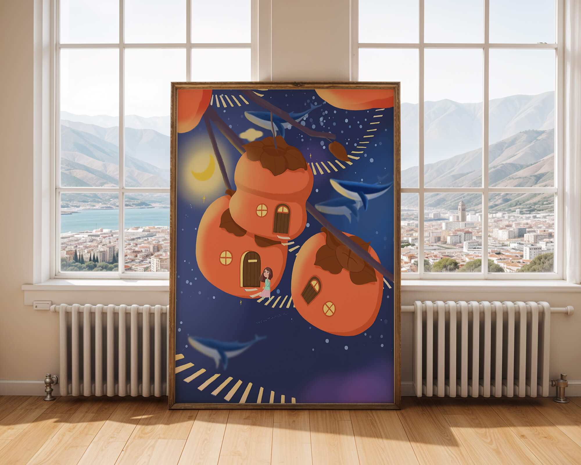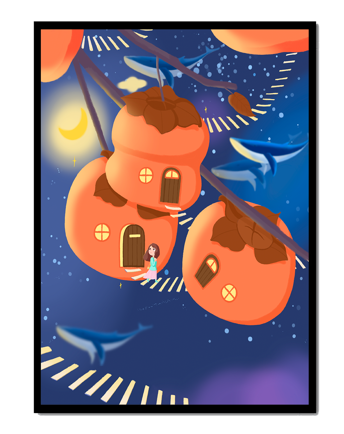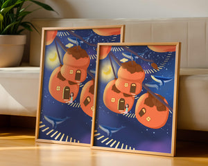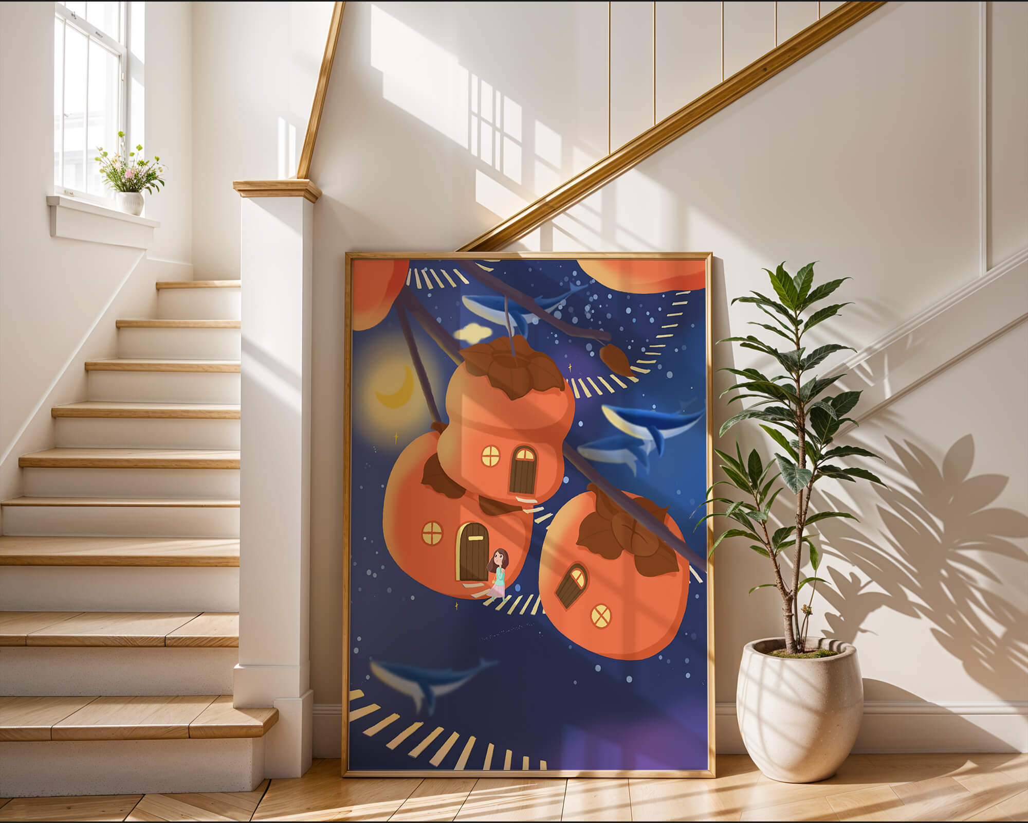 In this magical scene, the night sky is alive with twinkling stars and a crescent moon, illuminating the peculiar sight of houses shaped like persimmons. Each house features warmly lit windows and doors, hinting at the cozy worlds within. The rich orange hues of the persimmons create a striking contrast against the deep blue sky, enhancing the paintings enchanting quality.Below these floating homes, graceful whales swim peacefully through the night, adding to the dreamlike atmosphere. The entire composition evokes a sense of wonder and invites the viewer to let their imagination drift and wander through this surreal night scene. This artwork is| Type |