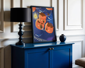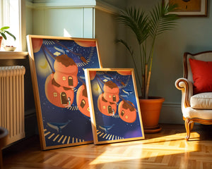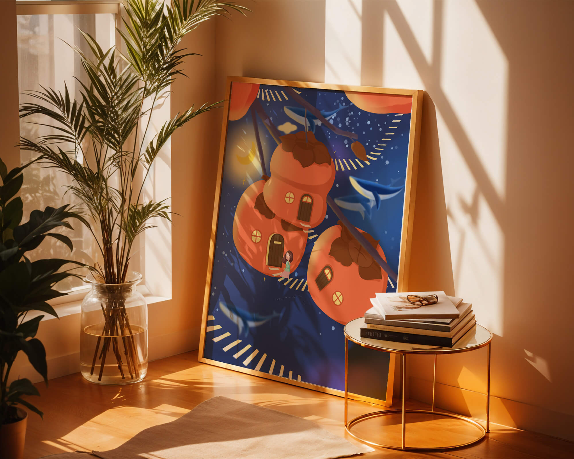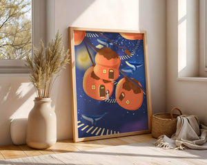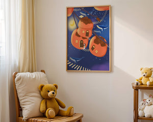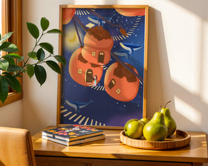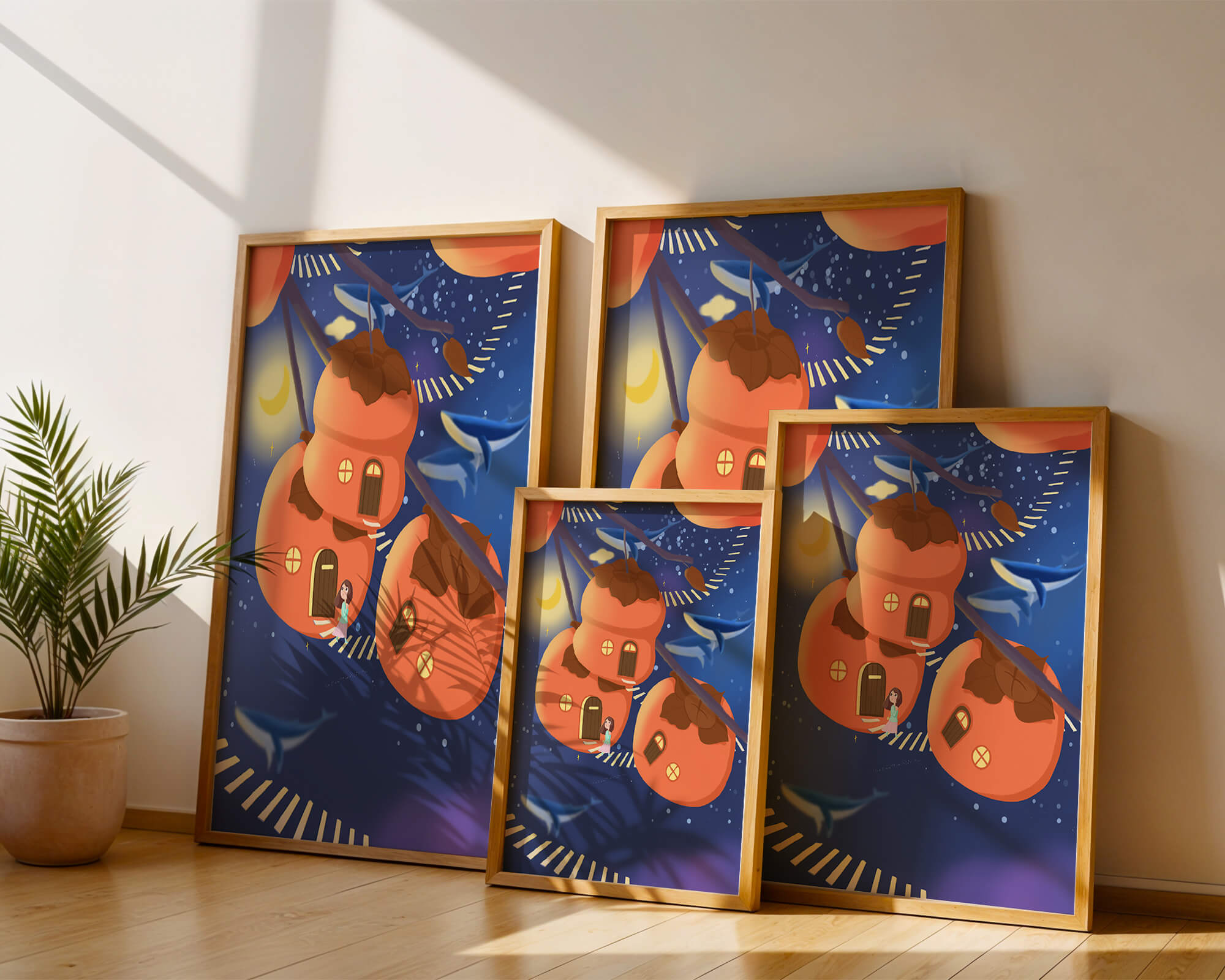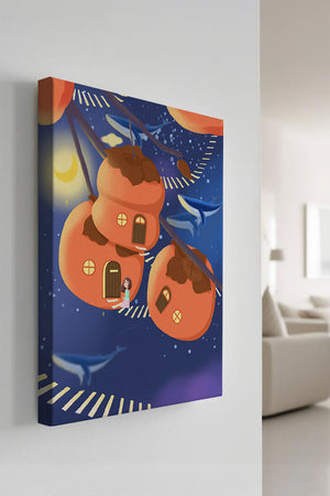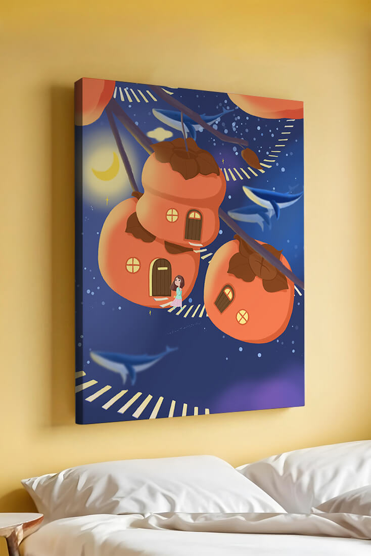 In this magical scene, the night sky is alive with twinkling stars and a crescent moon, illuminating the peculiar sight of houses shaped like persimmons. Each house features warmly lit windows and doors, hinting at the cozy worlds within. The rich orange hues of the persimmons create a striking contrast against the deep blue sky, enhancing the paintings enchanting quality.Below these floating homes, graceful whales swim peacefully through the night, adding to the dreamlike atmosphere. The entire composition evokes a sense of wonder and invites the viewer to let their imagination drift and wander through this surreal night scene. This artwork is| Type |