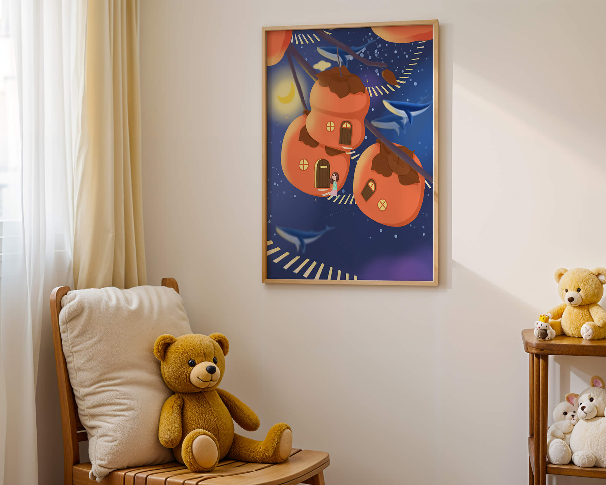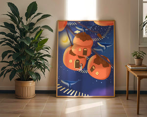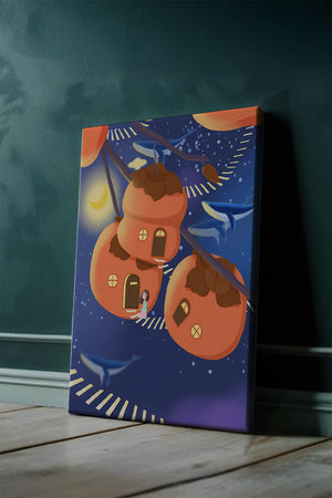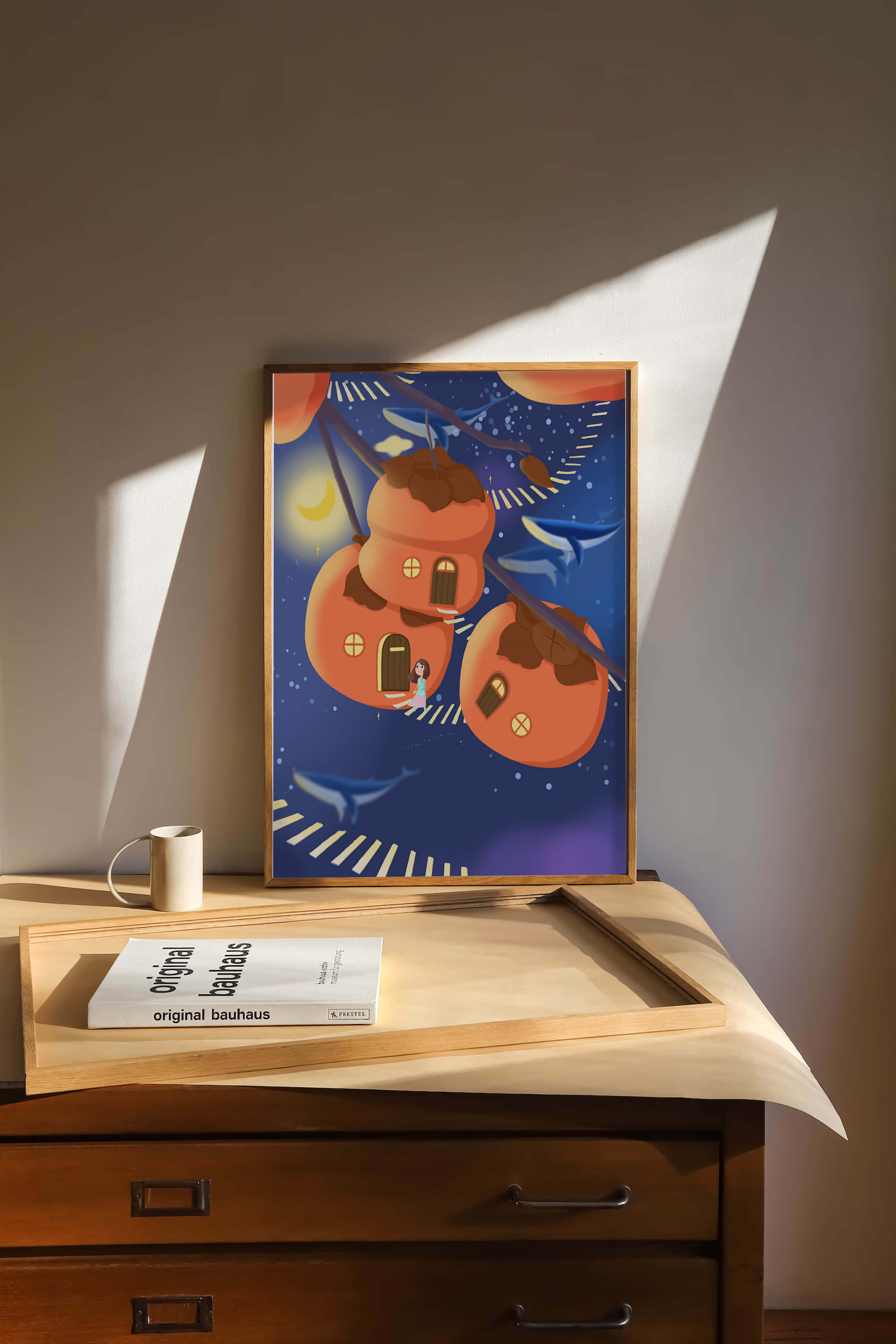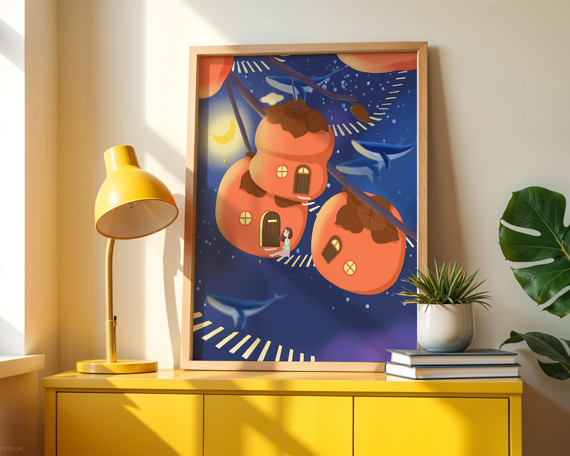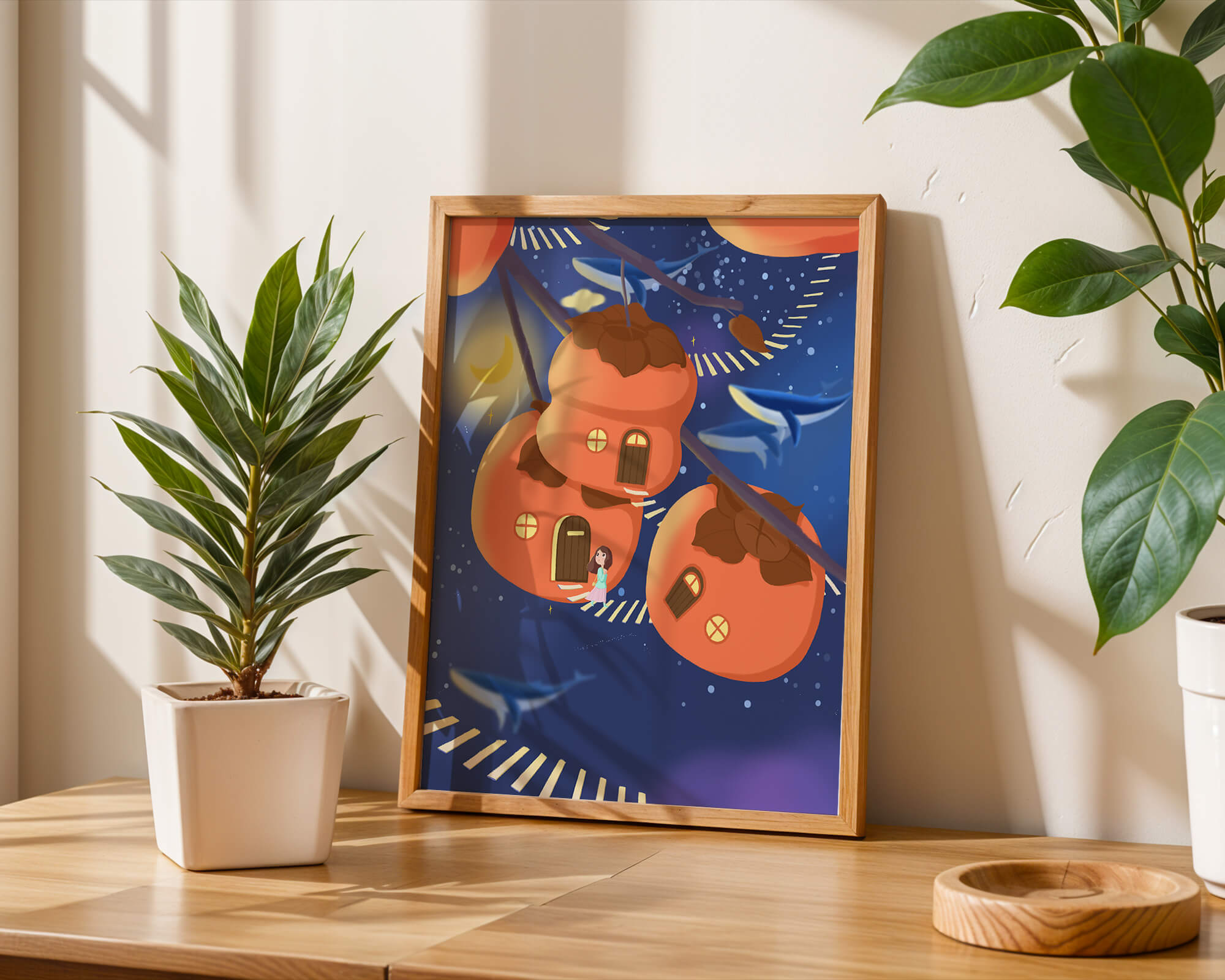Imagine stepping into a dreamlike world where persimmons become whimsical homes hanging on branches under a starry night sky. This enchanting illustration captures the magic of a surreal landscape where ordinary fruit transforms into charming abodes, inviting wanderers to explore their fantastical beauty.