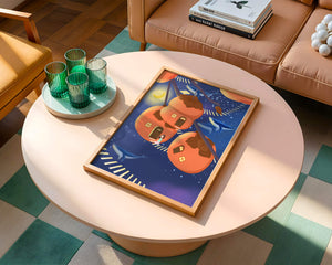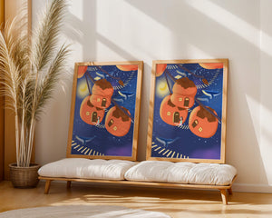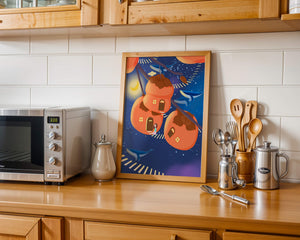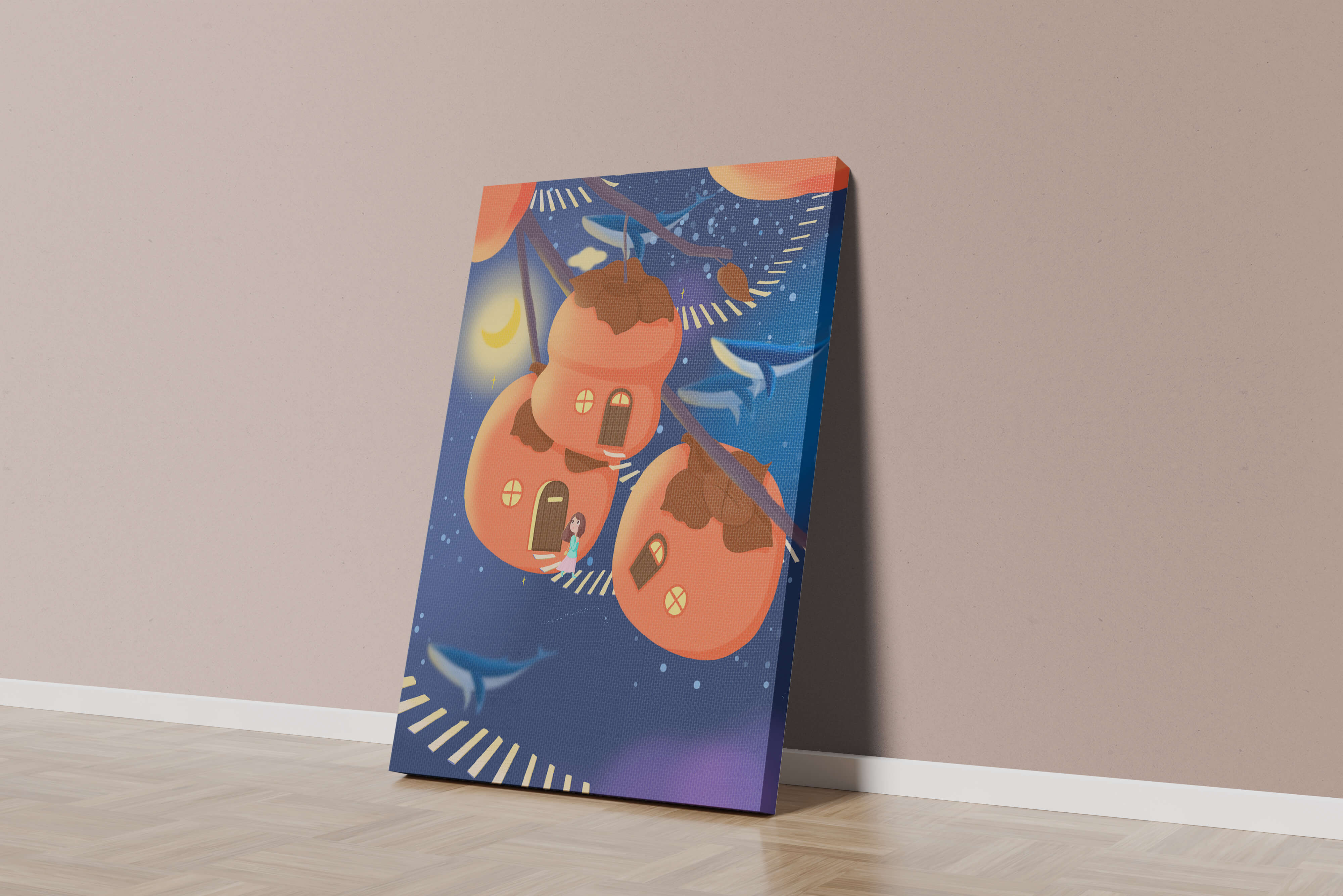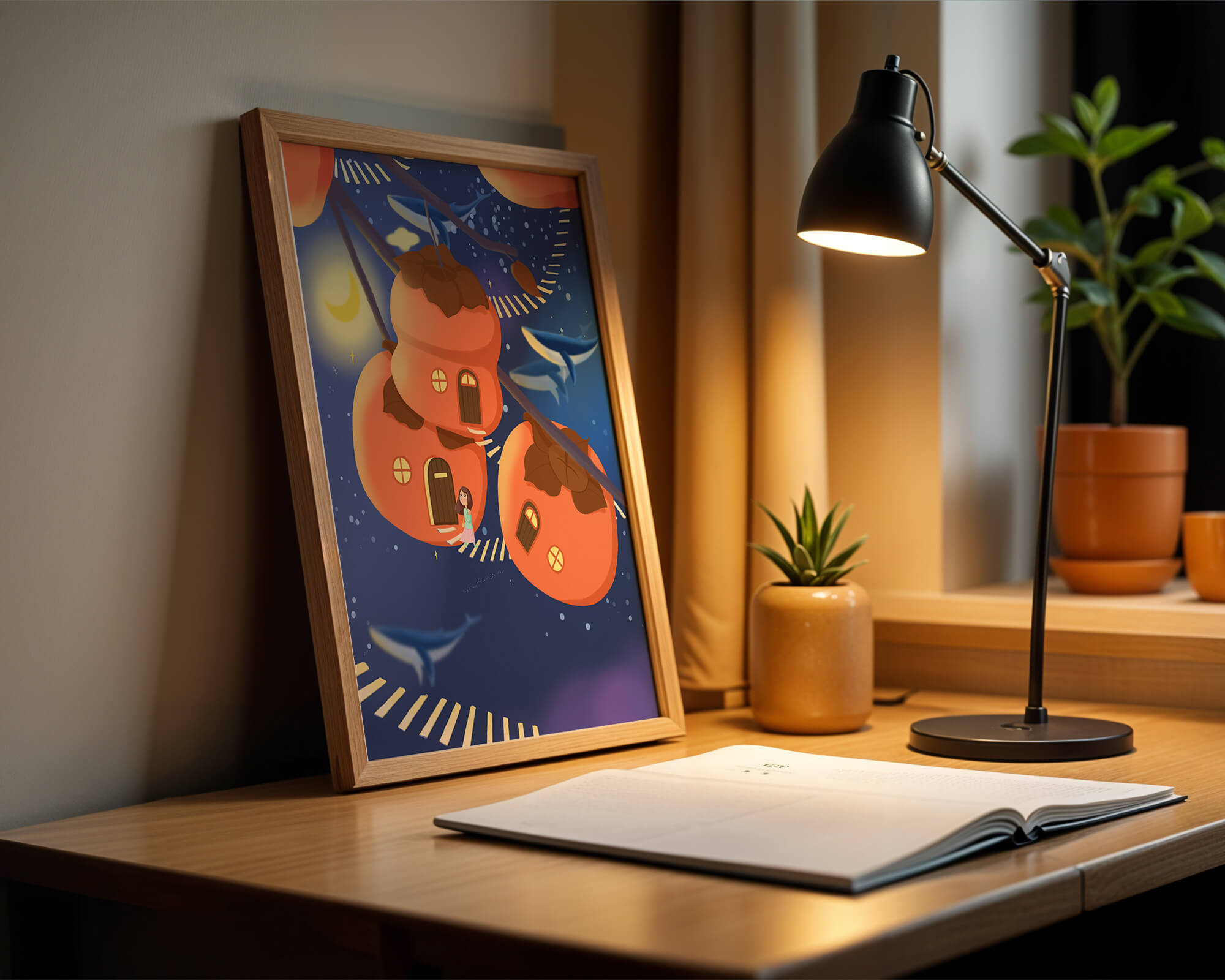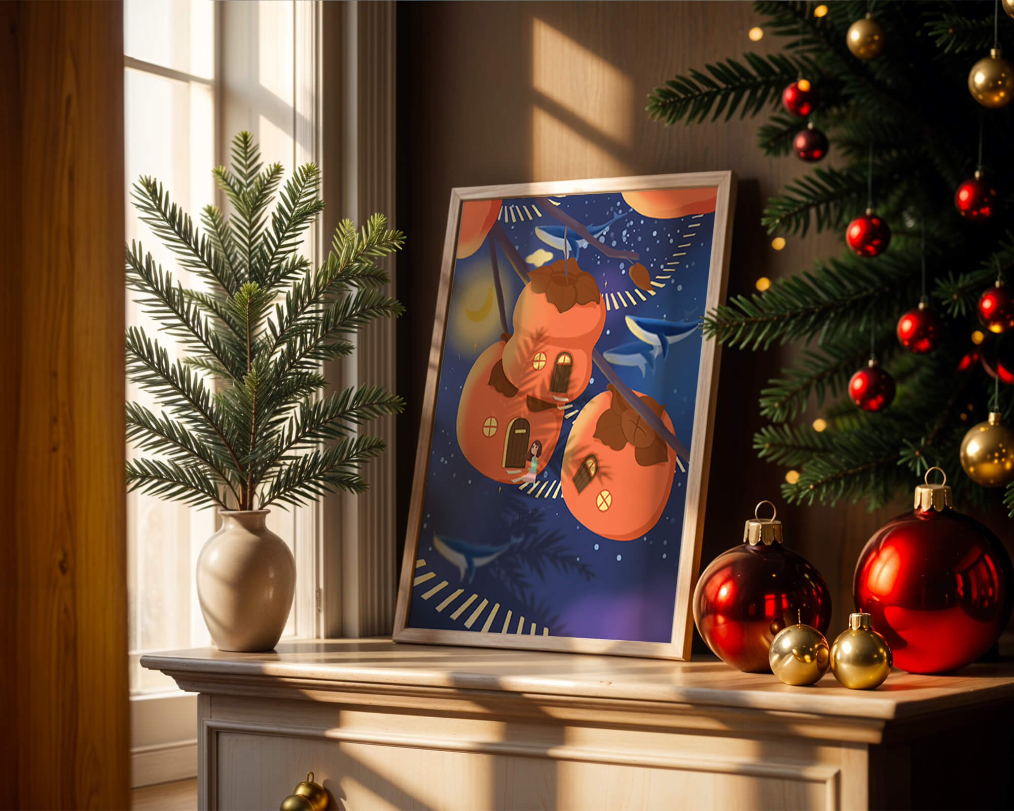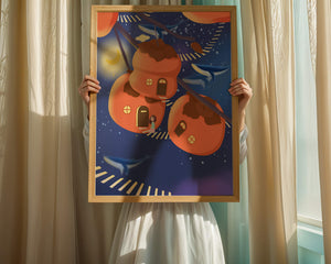 Imagine stepping into a dreamlike world where persimmons become whimsical homes hanging on branches under a starry night sky. This enchanting illustration captures the magic of a surreal landscape where ordinary fruit transforms into charming abodes, inviting wanderers to explore their fantastical beauty.
