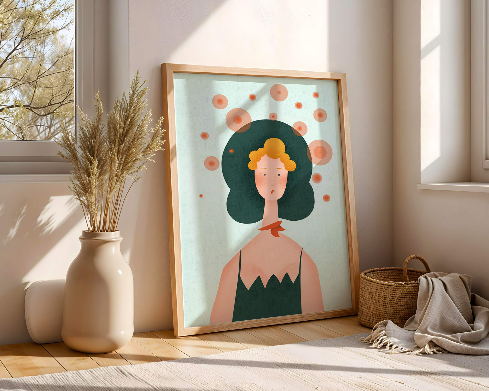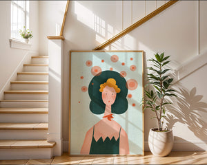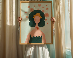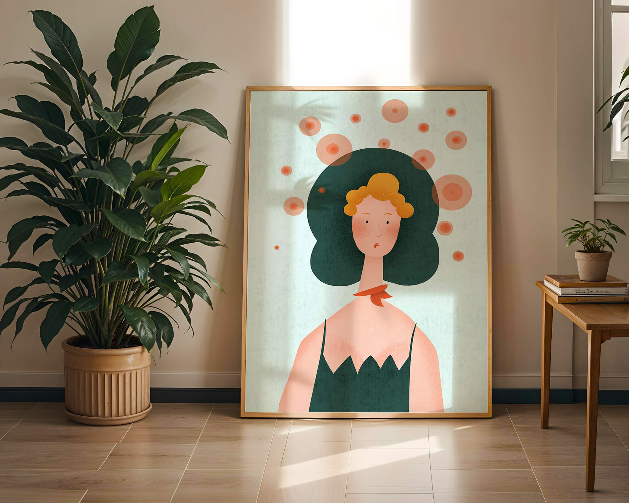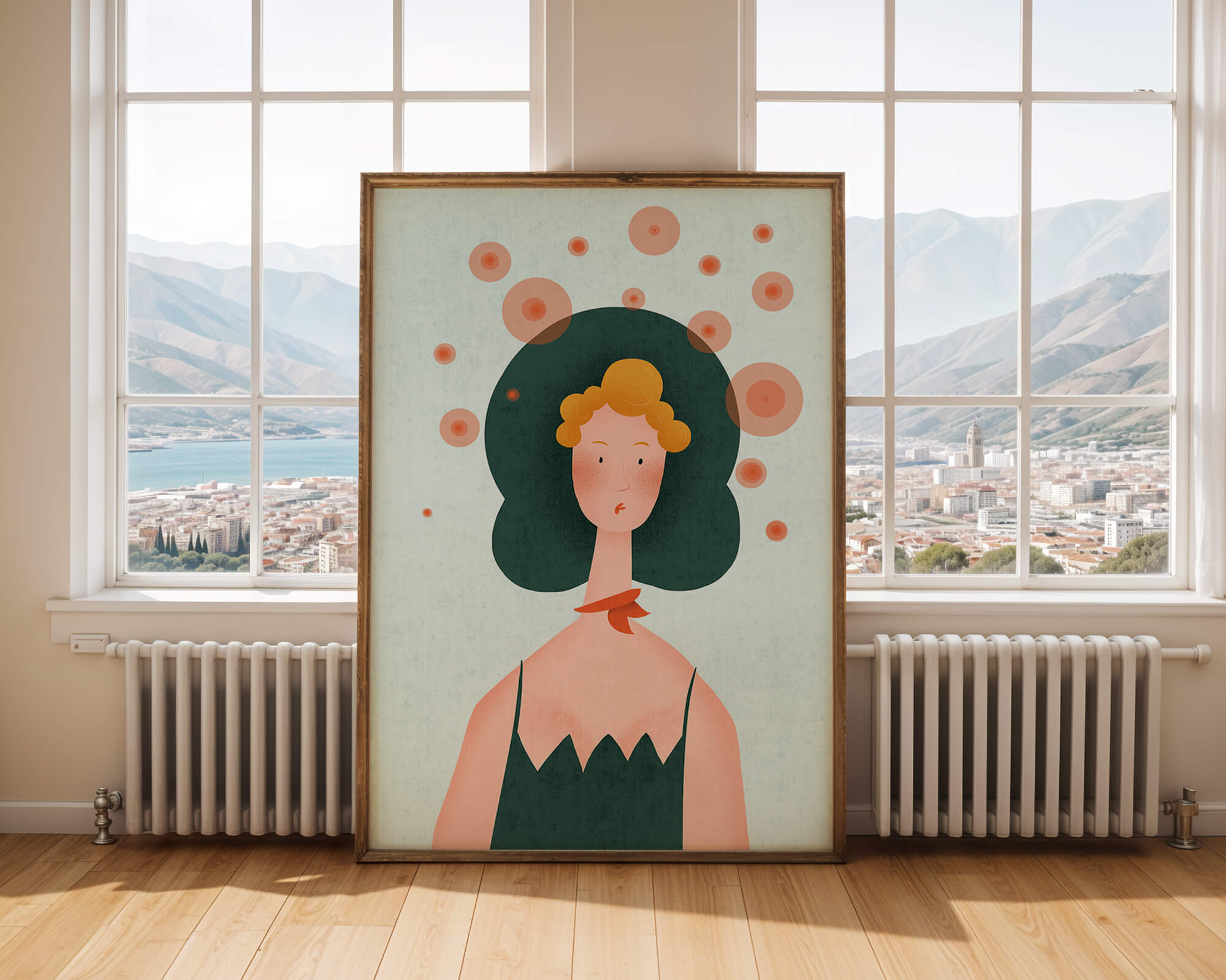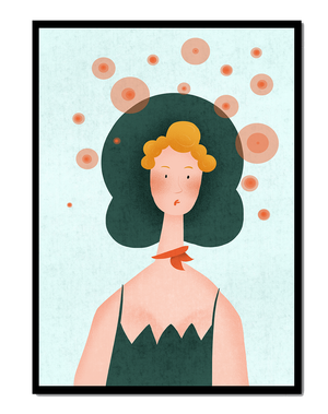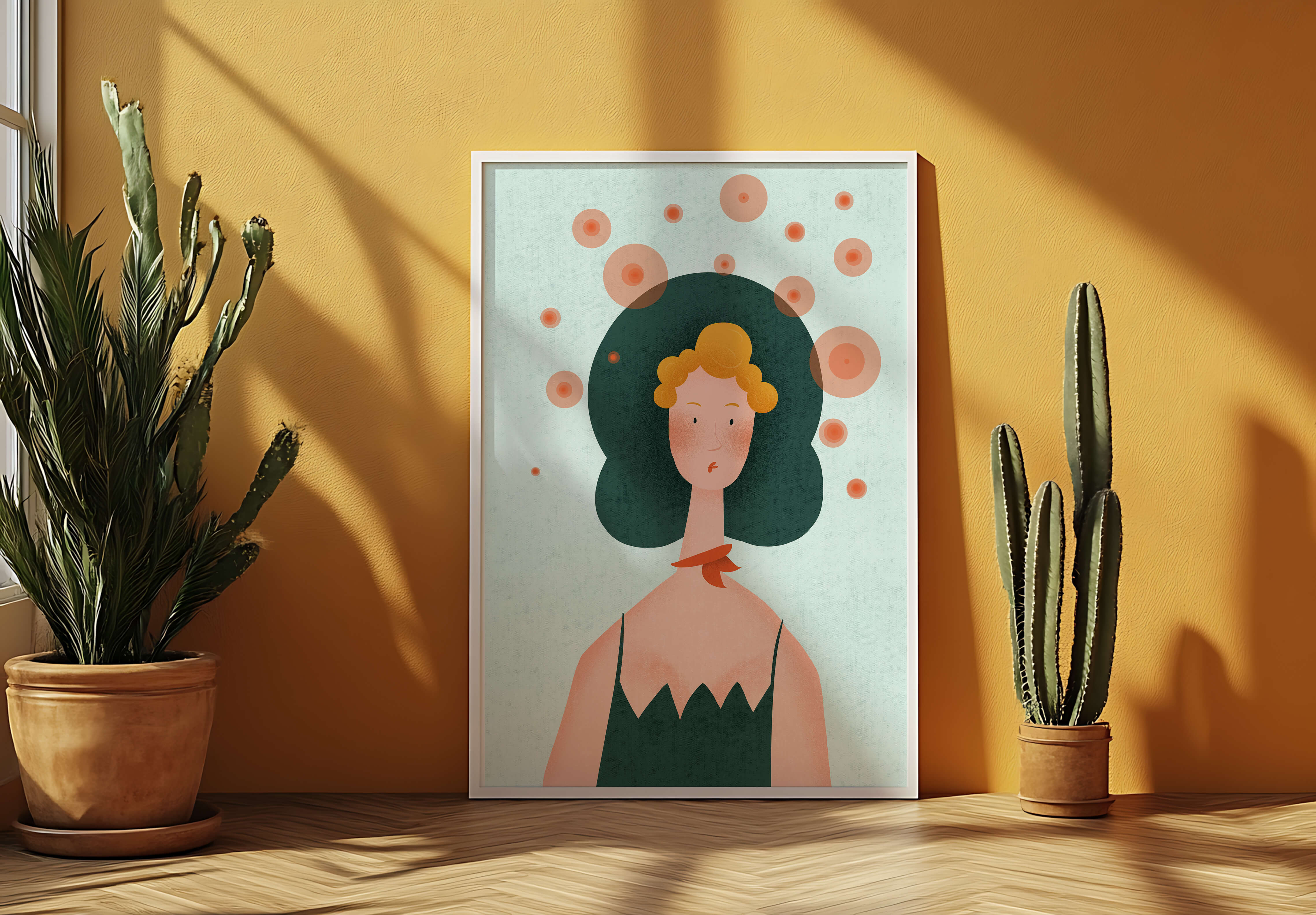 The image presents a creatively styled woman with a modern aesthetic. Her vibrant green hair creates a striking contrast against the lighter background, while a set of varied circular shapes adds a sense of motion and abstraction to the piece.This piece serves as a delightful exploration of portraiture with a modern twist. The interplay of colors and shapes lends the artwork a surreal, yet minimalistic feel, making it a perfect addition to contemporary art collections. With its unique and expressive character, this work captures the imagination and invites viewers into a vibrant world of abstract forms.| Type |