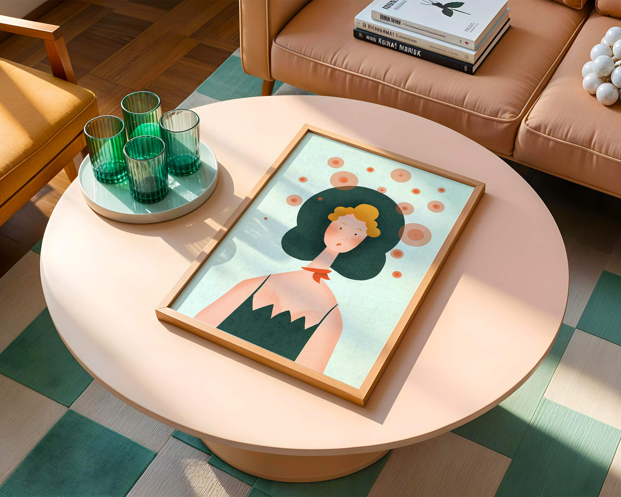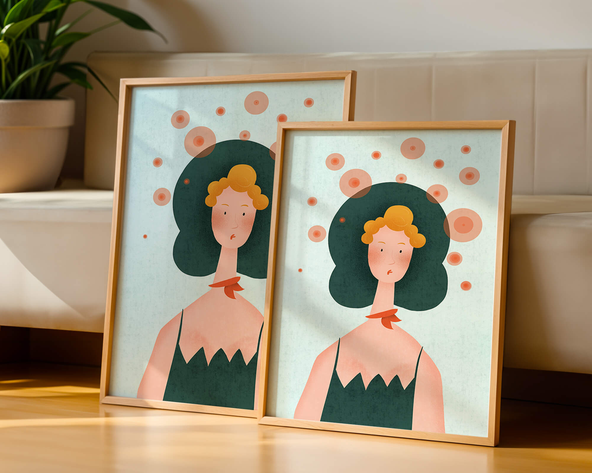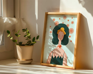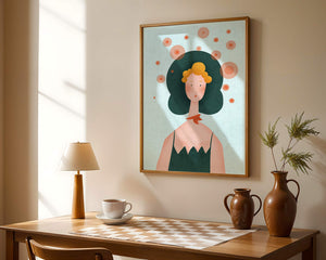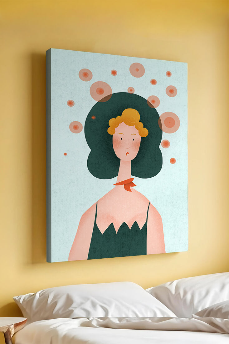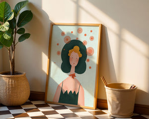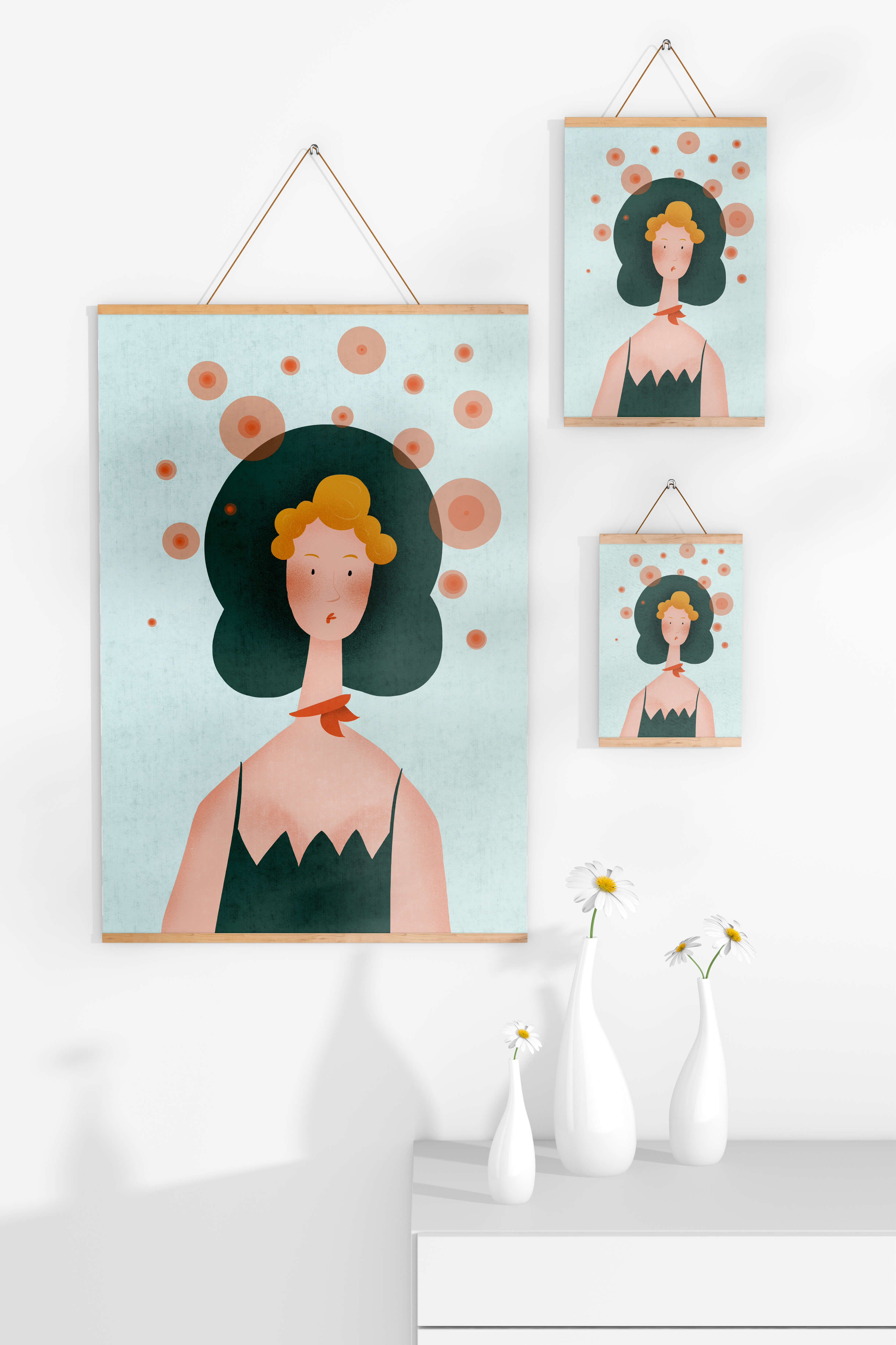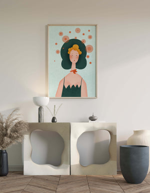 The image presents a creatively styled woman with a modern aesthetic. Her vibrant green hair creates a striking contrast against the lighter background, while a set of varied circular shapes adds a sense of motion and abstraction to the piece.This piece serves as a delightful exploration of portraiture with a modern twist. The interplay of colors and shapes lends the artwork a surreal, yet minimalistic feel, making it a perfect addition to contemporary art collections. With its unique and expressive character, this work captures the imagination and invites viewers into a vibrant world of abstract forms.| Type |