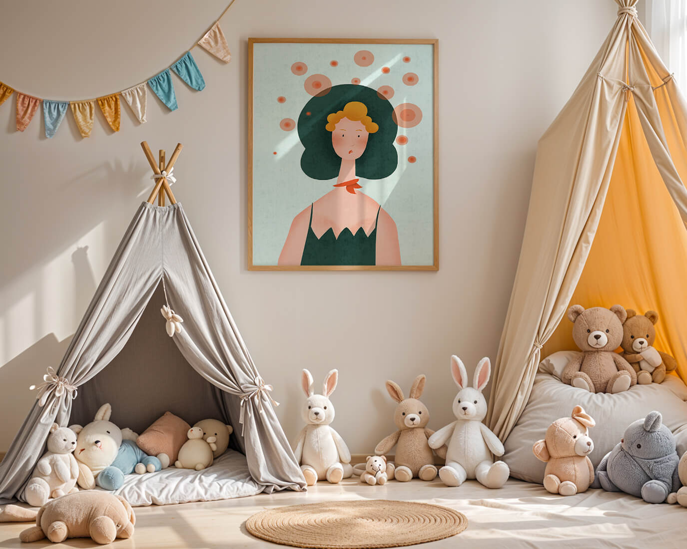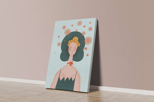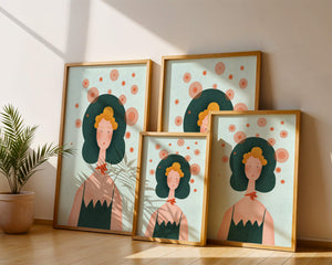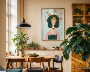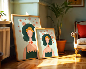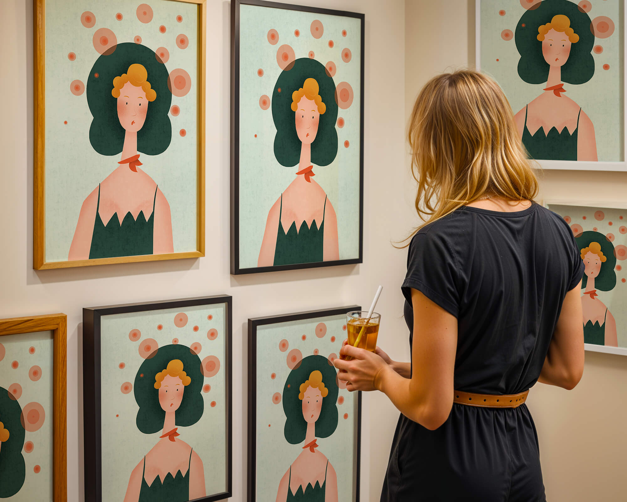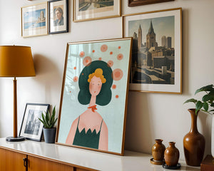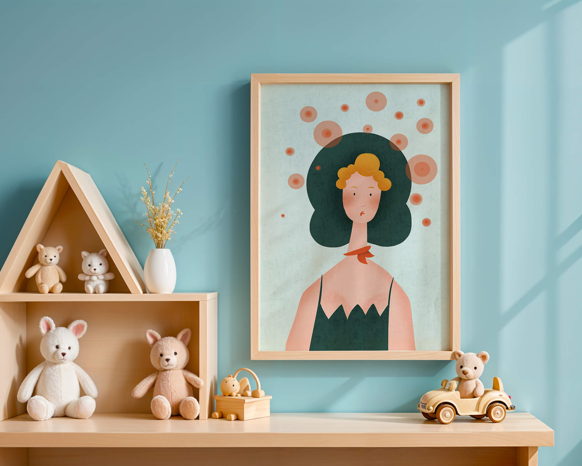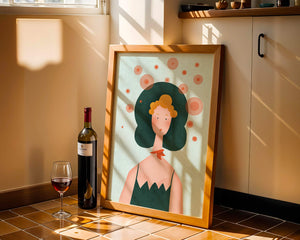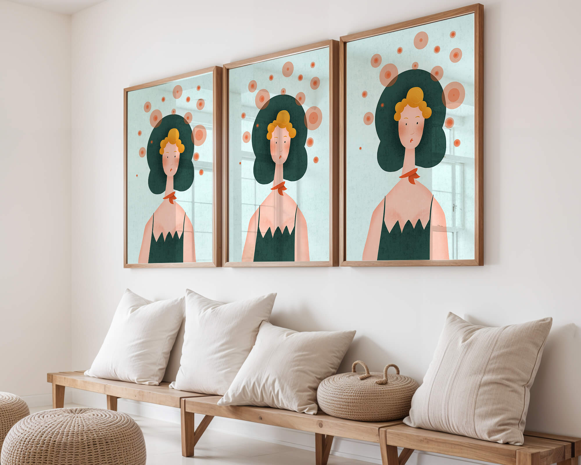 The image presents a creatively styled woman with a modern aesthetic. Her vibrant green hair creates a striking contrast against the lighter background, while a set of varied circular shapes adds a sense of motion and abstraction to the piece.This piece serves as a delightful exploration of portraiture with a modern twist. The interplay of colors and shapes lends the artwork a surreal, yet minimalistic feel, making it a perfect addition to contemporary art collections. With its unique and expressive character, this work captures the imagination and invites viewers into a vibrant world of abstract forms.| Type |