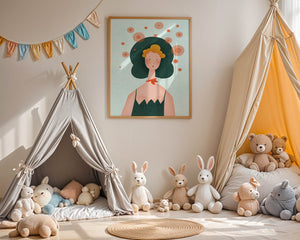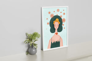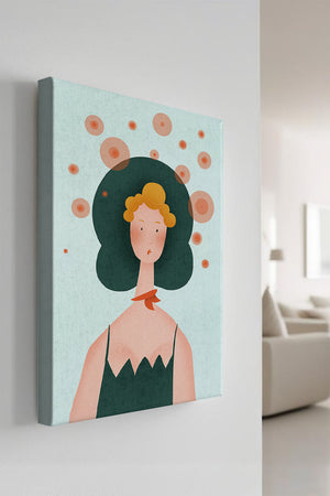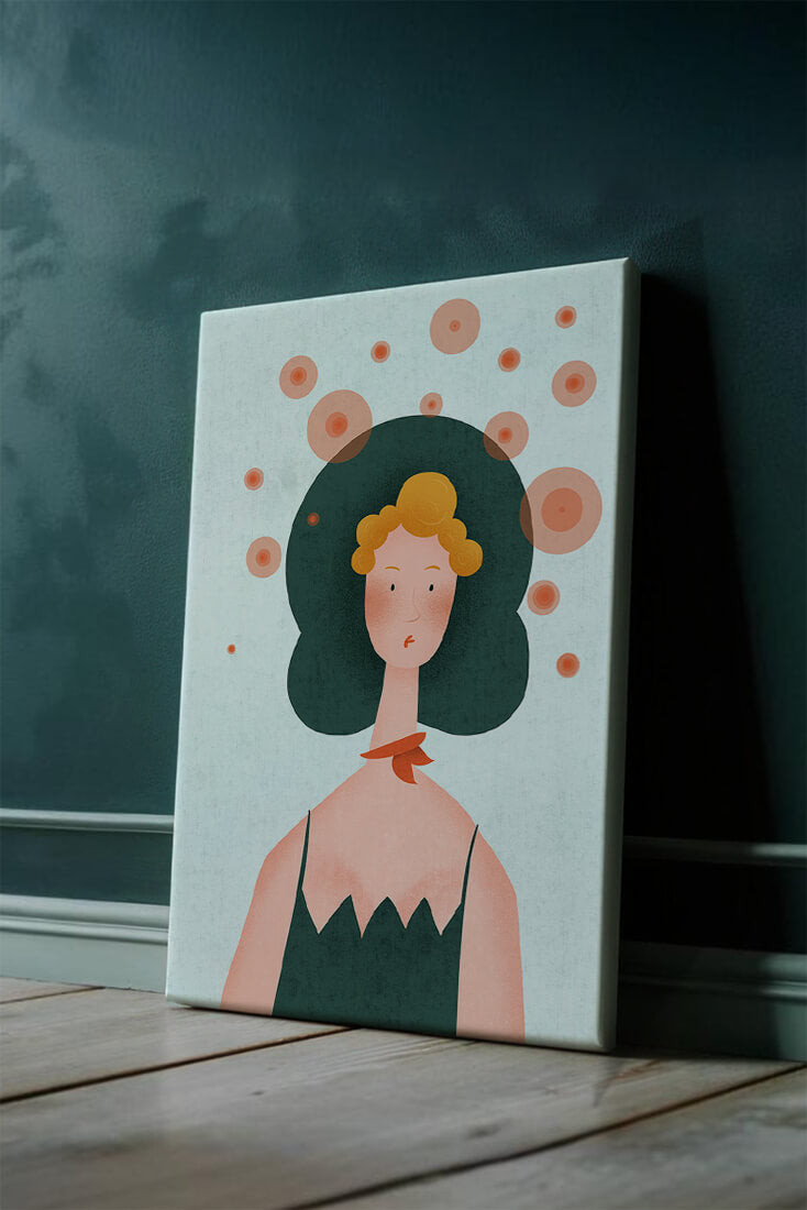 This artwork features a whimsical and abstract portrayal of a woman with green hair surrounded by floating circles.