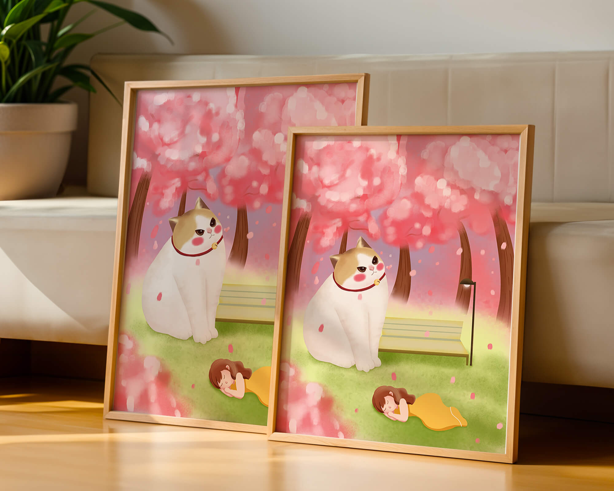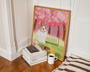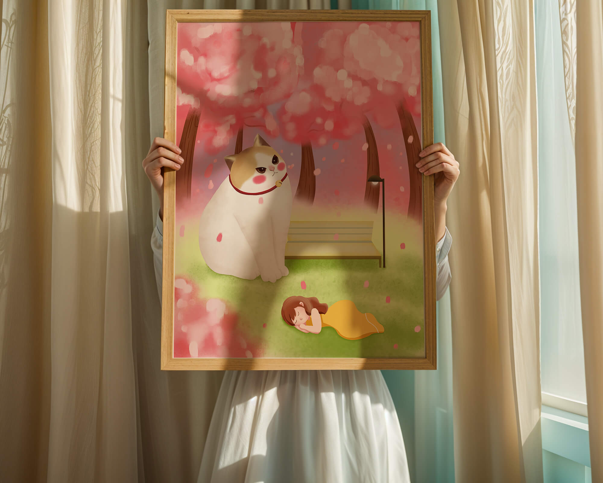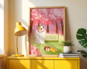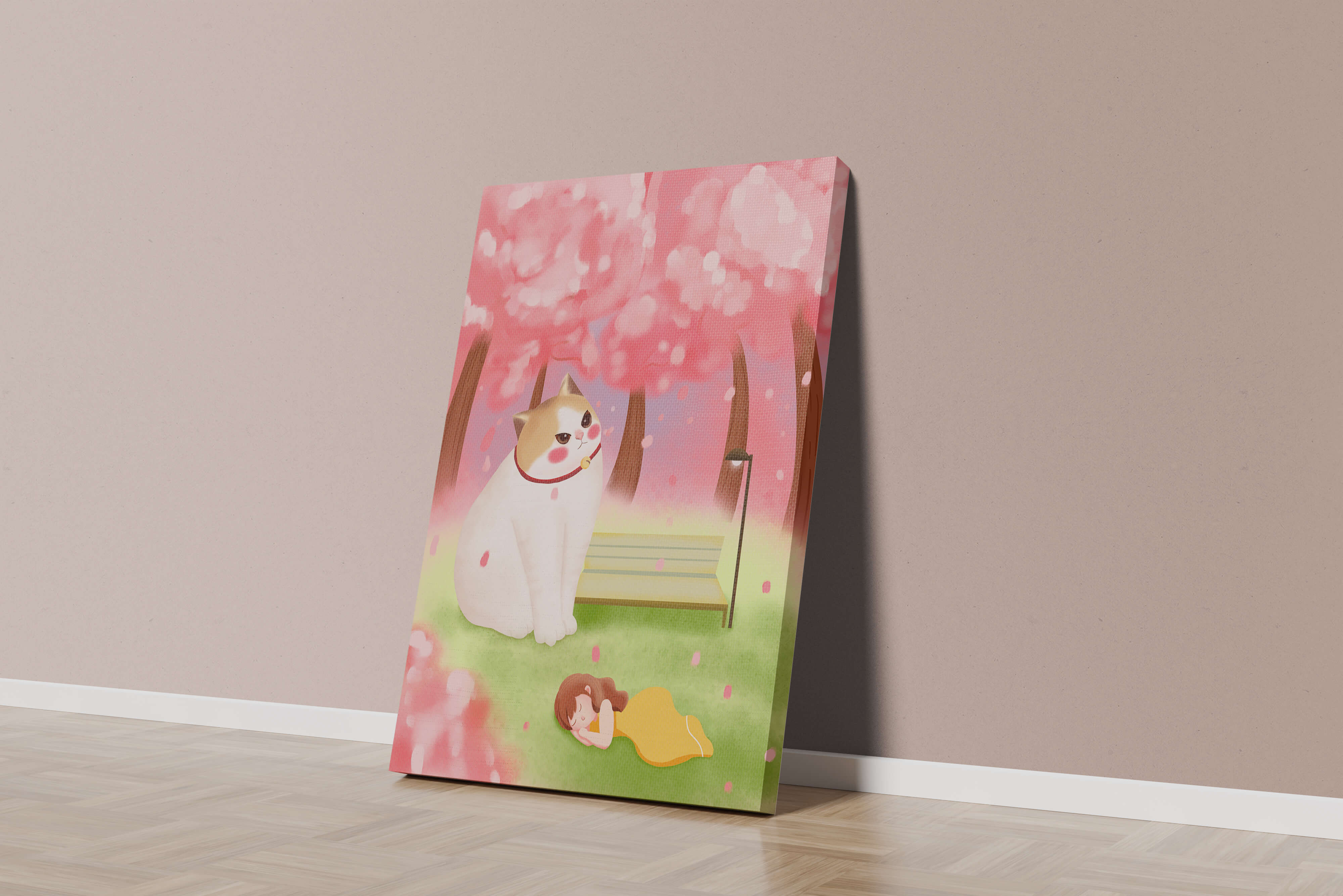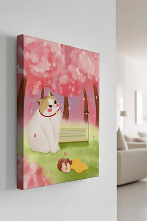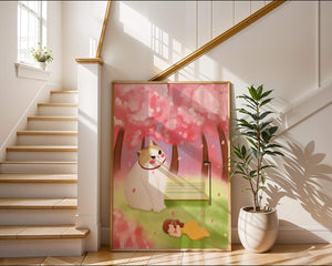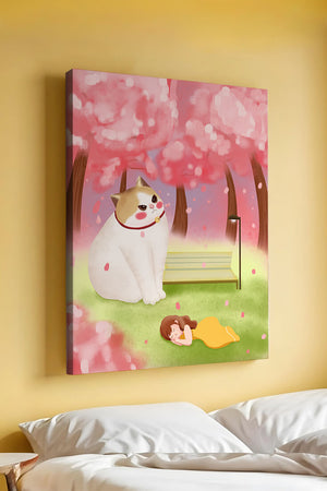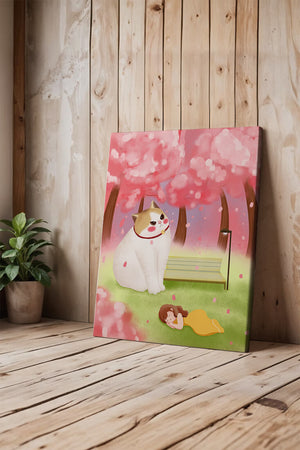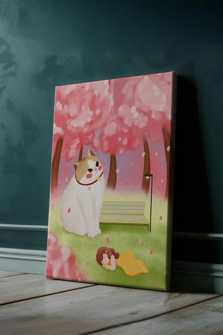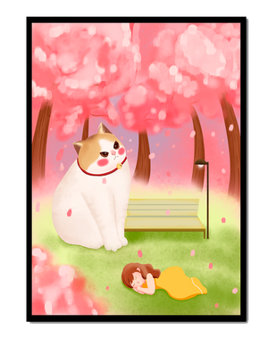 In this idyllic image, a giant cat majestically sits beside a park bench enveloped by a pastel sea of cherry blossoms. The lush pink trees create a fantastical canopy, enhancing the soothing atmosphere. The scene is both whimsical and calming, perfect for evoking a sense of relaxation and wonder.A girl in a flowing yellow dress is peacefully napping on the grass, adding a touch of innocence and tranquility to the narrative. Her presence complements the gentle enormity of the cat, which watches over her with a stoic expression. This artwork beautifully blends elements of fantasy and nature, offering a serene escape into a world where dreams and reality intertwine.| Type |