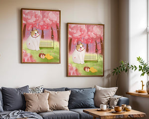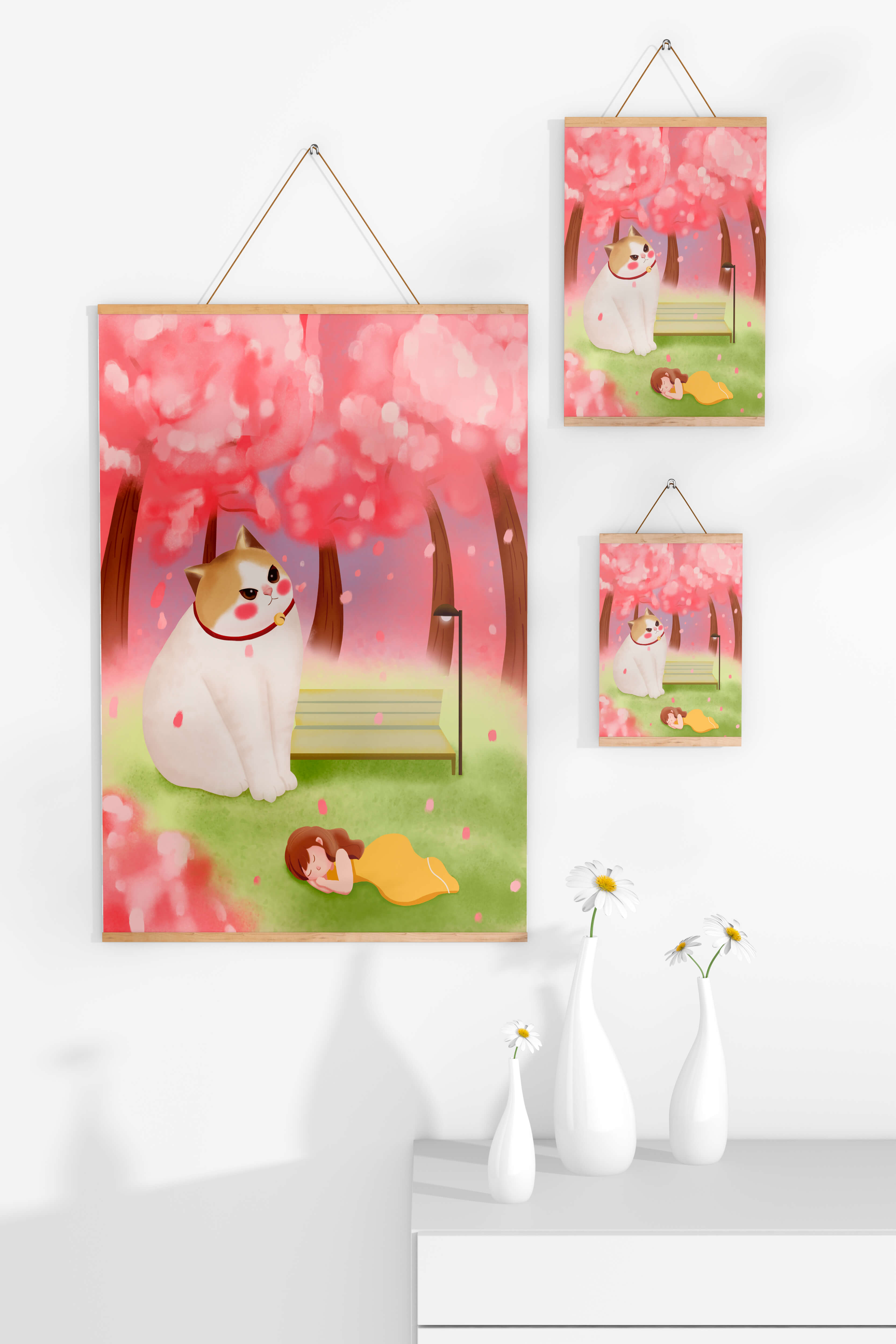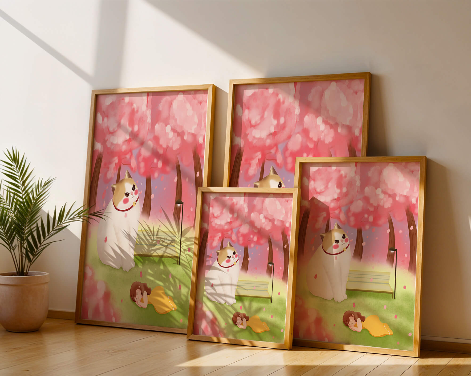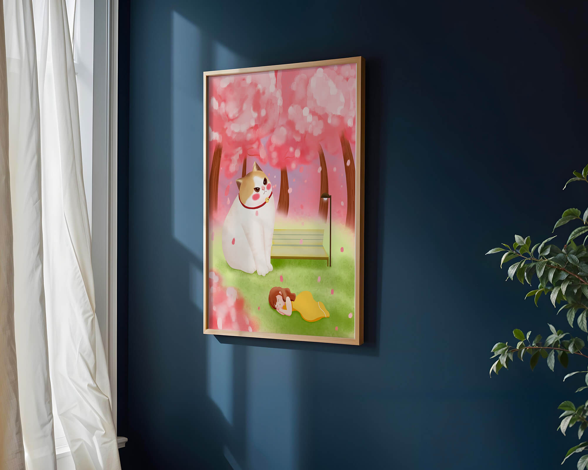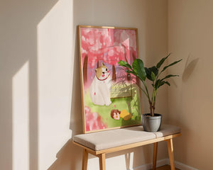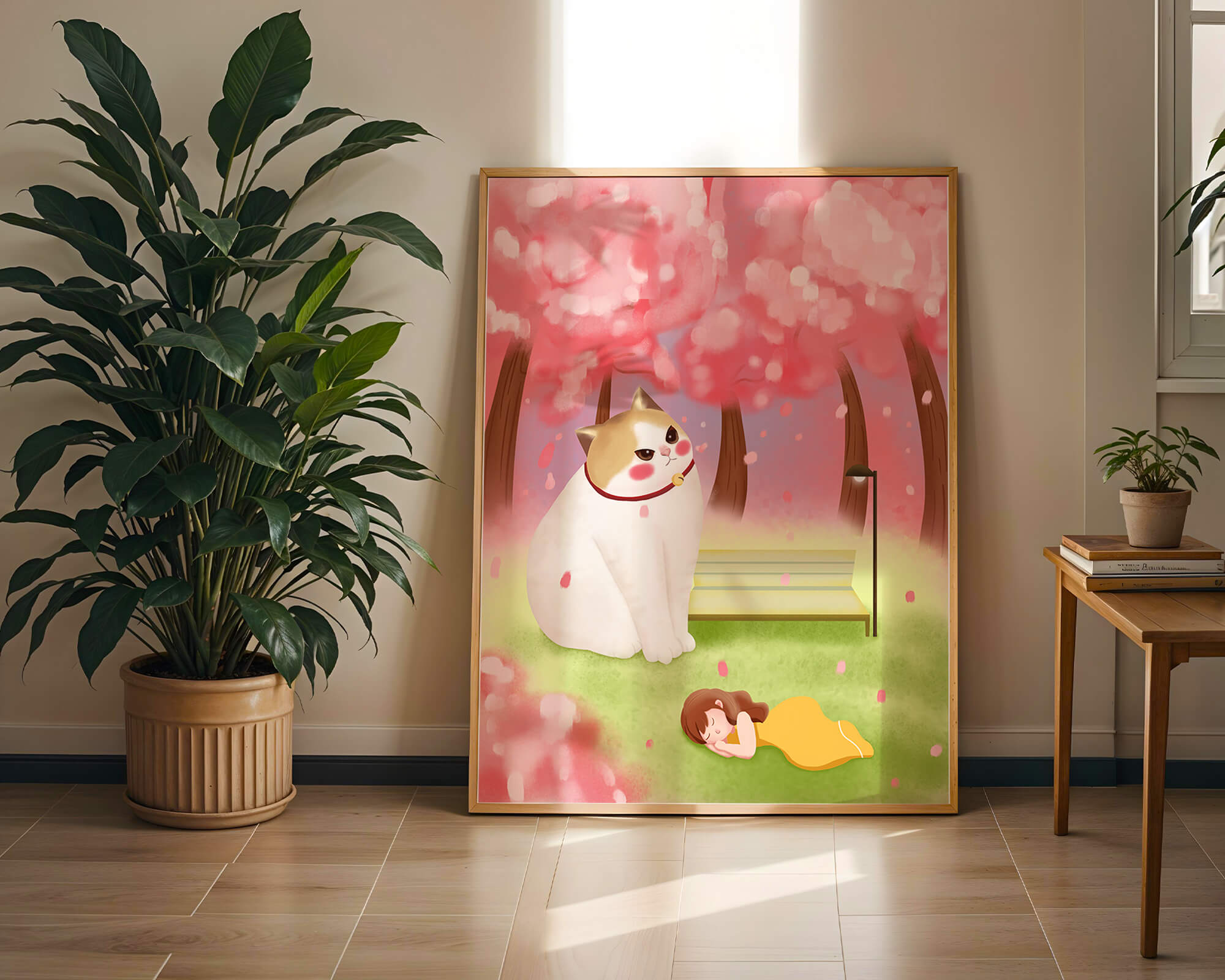 In this idyllic image, a giant cat majestically sits beside a park bench enveloped by a pastel sea of cherry blossoms. The lush pink trees create a fantastical canopy, enhancing the soothing atmosphere. The scene is both whimsical and calming, perfect for evoking a sense of relaxation and wonder.A girl in a flowing yellow dress is peacefully napping on the grass, adding a touch of innocence and tranquility to the narrative. Her presence complements the gentle enormity of the cat, which watches over her with a stoic expression. This artwork beautifully blends elements of fantasy and nature, offering a serene escape into a world where dreams and reality intertwine.| Type |