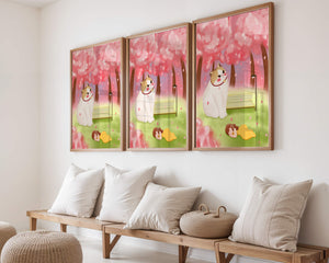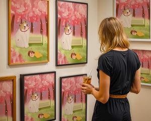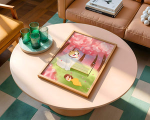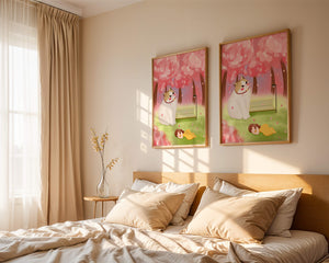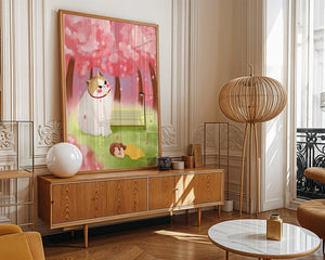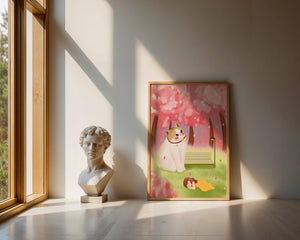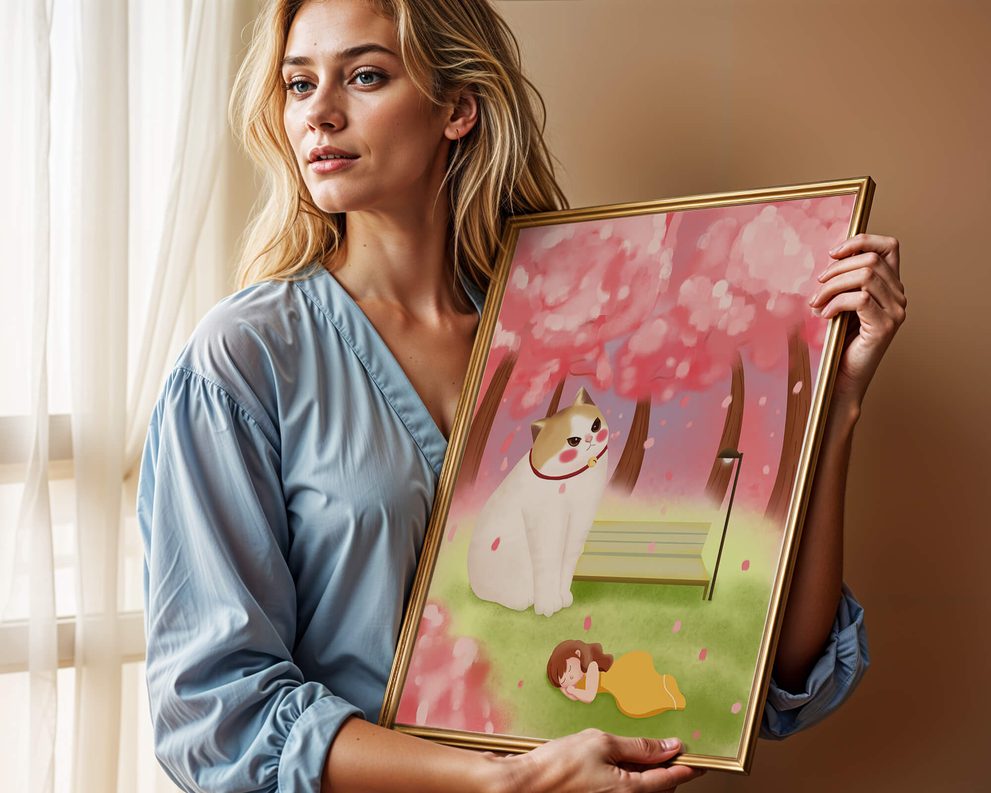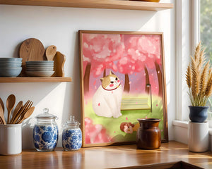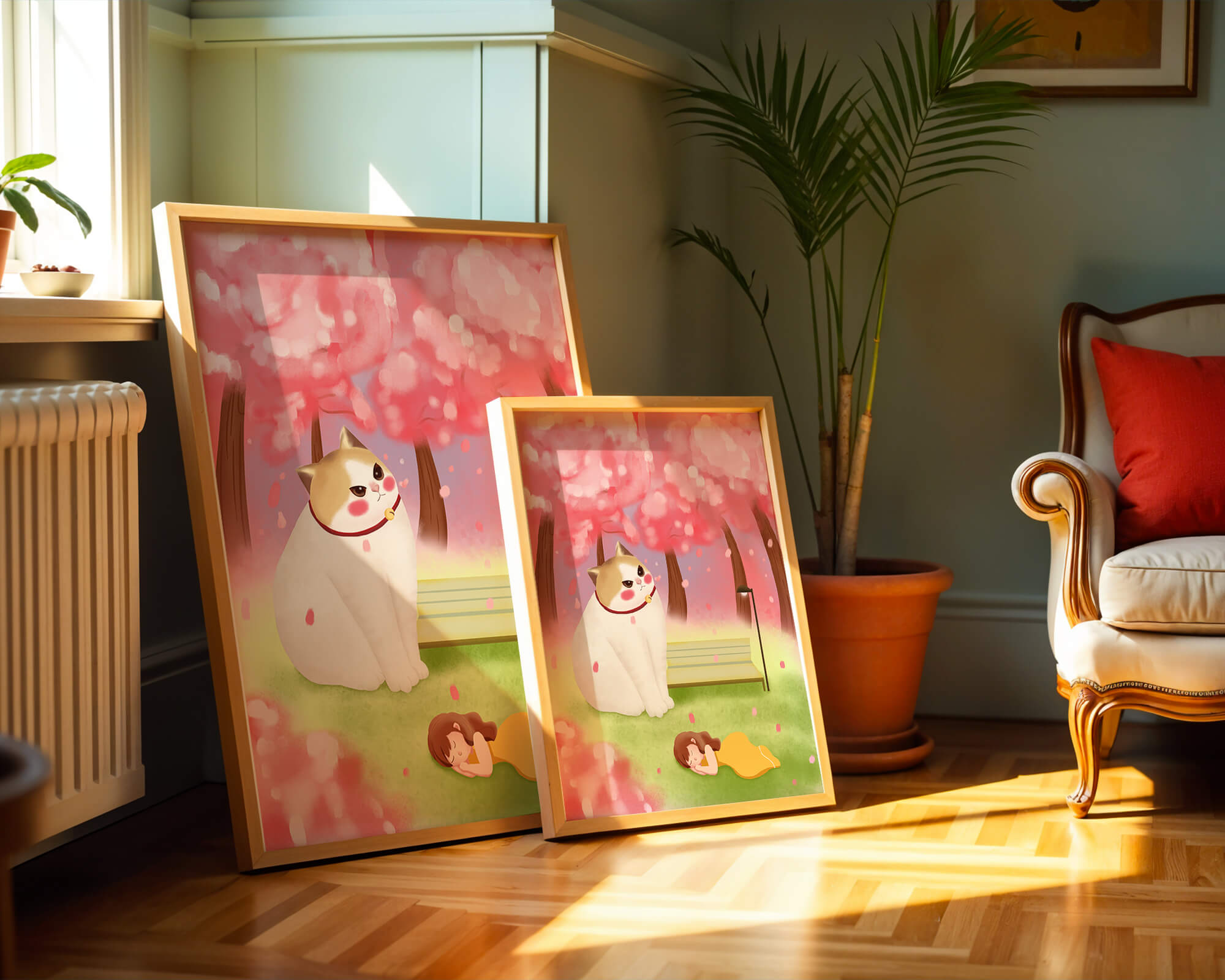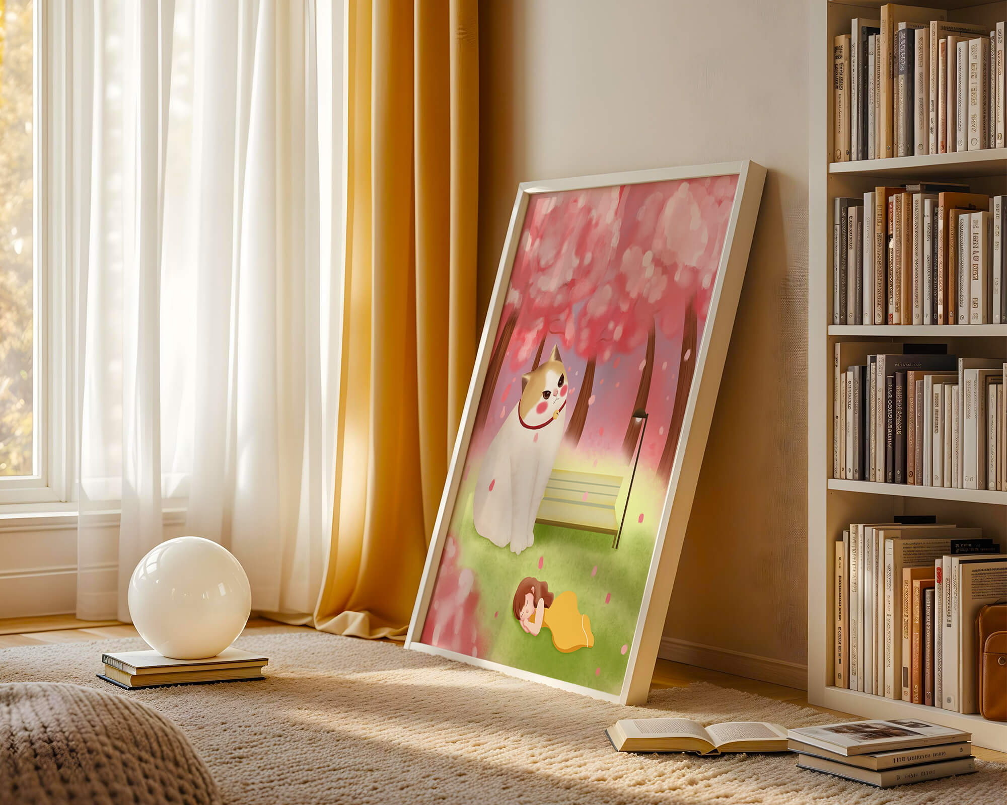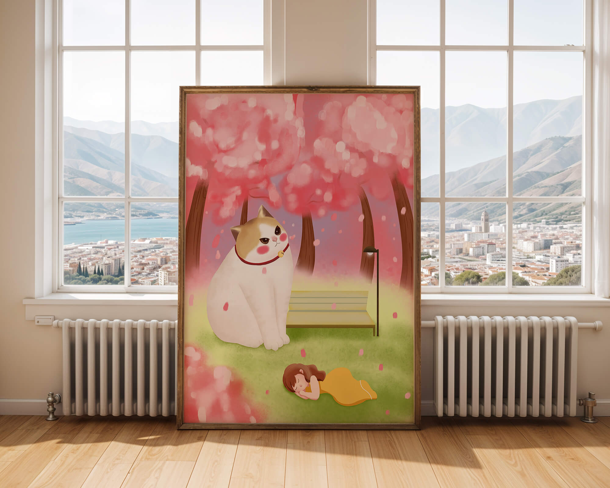 In this idyllic image, a giant cat majestically sits beside a park bench enveloped by a pastel sea of cherry blossoms. The lush pink trees create a fantastical canopy, enhancing the soothing atmosphere. The scene is both whimsical and calming, perfect for evoking a sense of relaxation and wonder.A girl in a flowing yellow dress is peacefully napping on the grass, adding a touch of innocence and tranquility to the narrative. Her presence complements the gentle enormity of the cat, which watches over her with a stoic expression. This artwork beautifully blends elements of fantasy and nature, offering a serene escape into a world where dreams and reality intertwine.| Type |