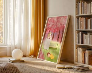 A charming and dreamy illustration captures a surreal park setting.
