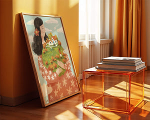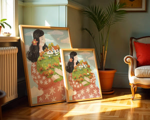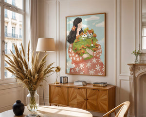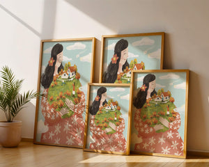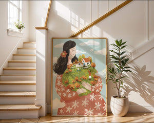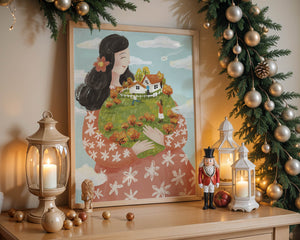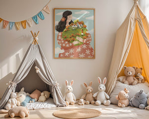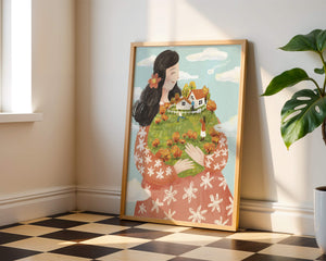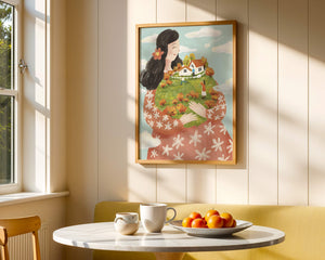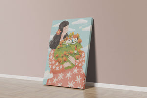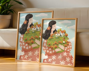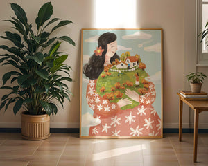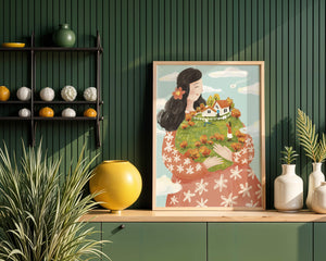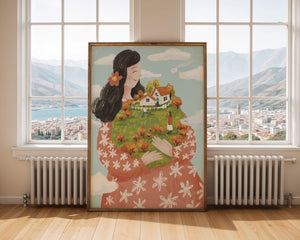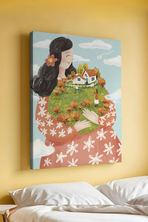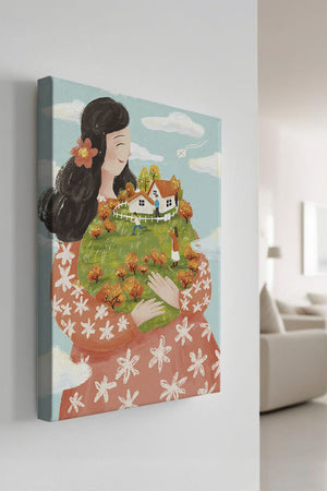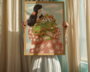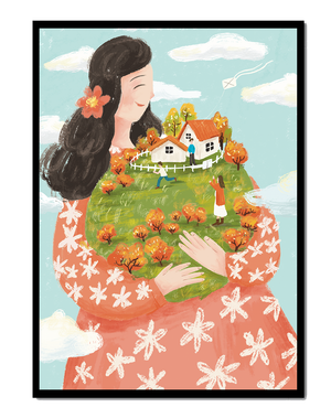 This captivating artwork showcases a fusion of nature and imagination. The focus is on a woman holding a lush landscape, symbolizing care and nurturing. The vibrant colors and intricate details create a dreamy atmosphere, inviting viewers into a world of fantasy and warmth.The scene captures a sense of nostalgia and peacefulness with its lush greenery and lively inhabitants. This artwork emphasizes the beauty of family life and the simple joys of being surrounded by nature. Its an enchanting piece that brings a smile to anyone who views it, offering a glimpse into a harmonious and playful world.| Type |