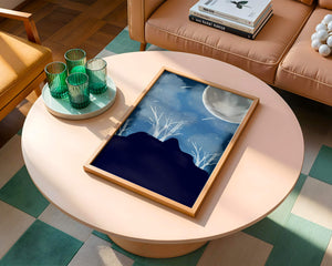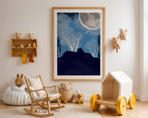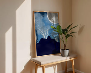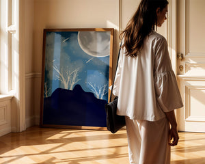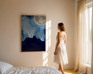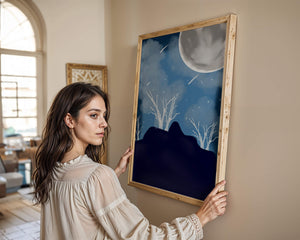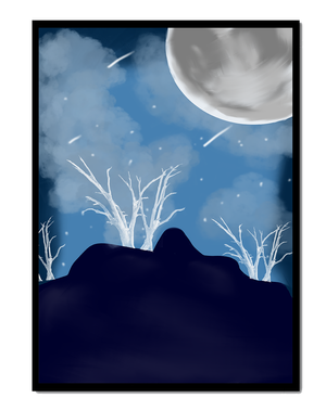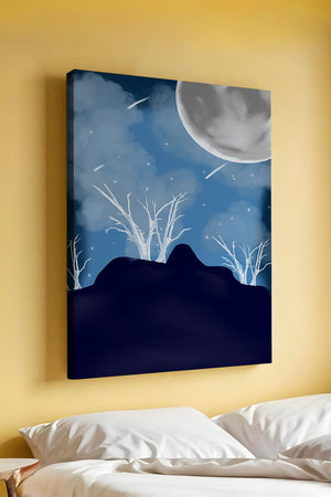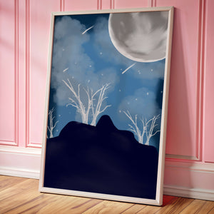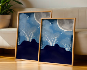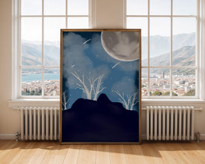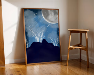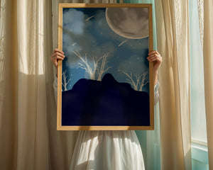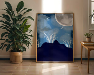 In this peaceful night setting, the full moon serves as the central focus, illuminating the surrounding environment with its calming light. The barren trees create a contrast with their delicate branches reaching towards the sky, symbolizing endurance through winters chill. The simplicity of this night landscape offers a sense of tranquility and reflection, making it a perfect piece for those who appreciate the quiet beauty of nocturnal nature. The minimalistic style enhances the overall atmosphere, drawing the viewer into a world of calm and contemplation.