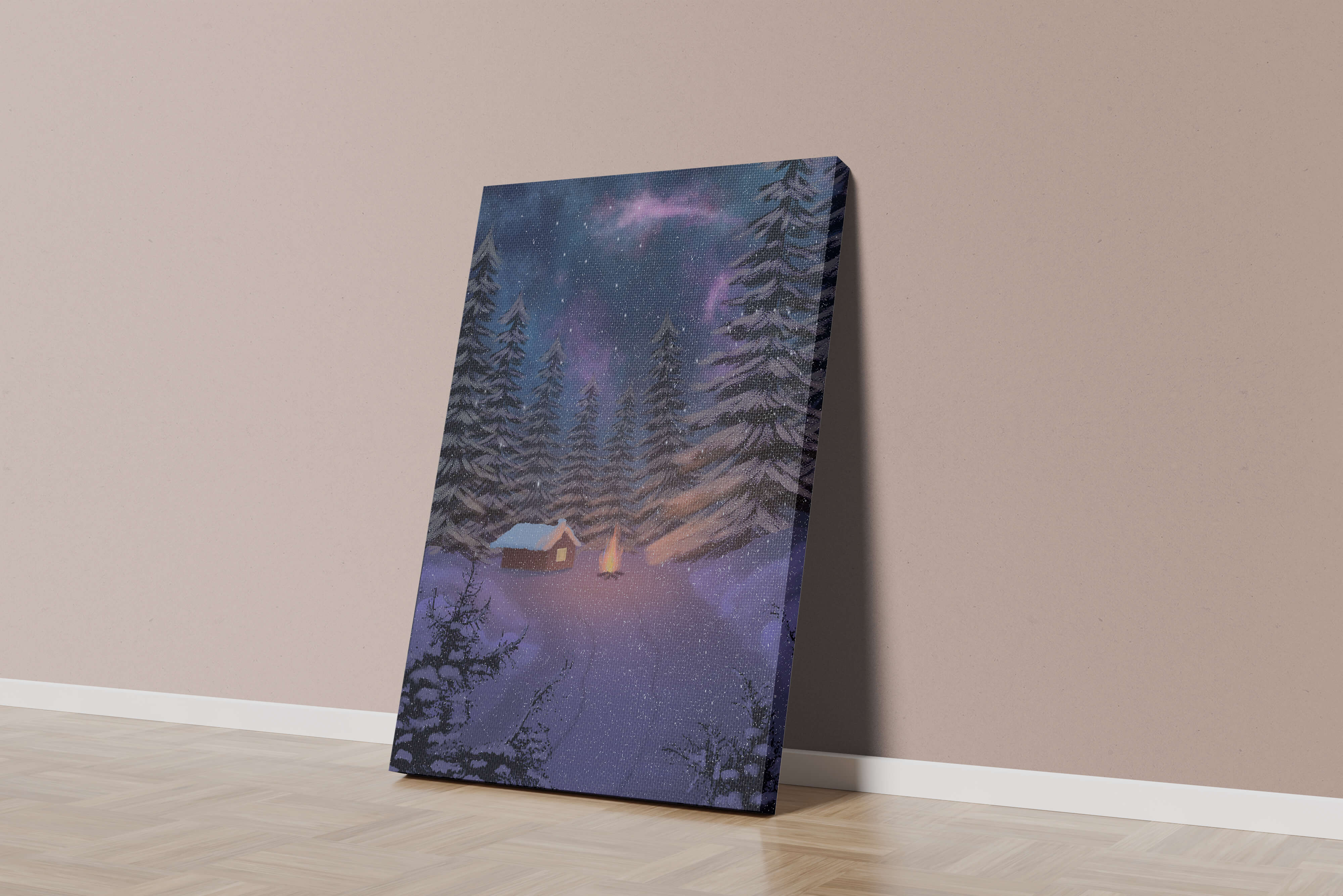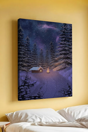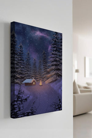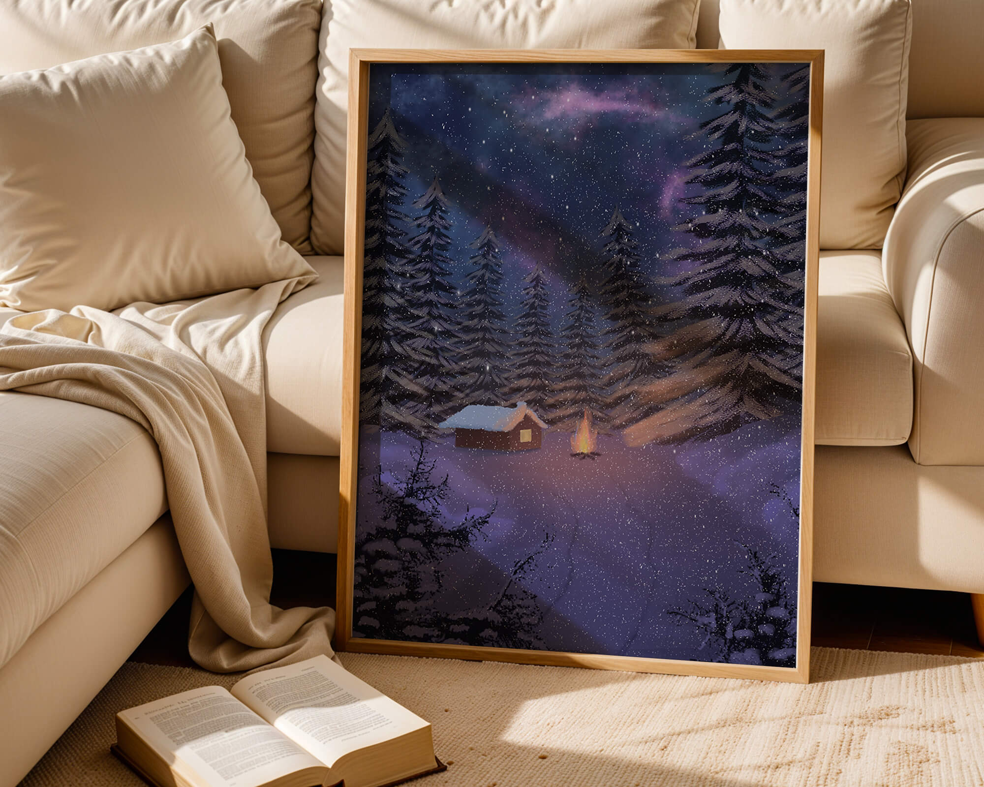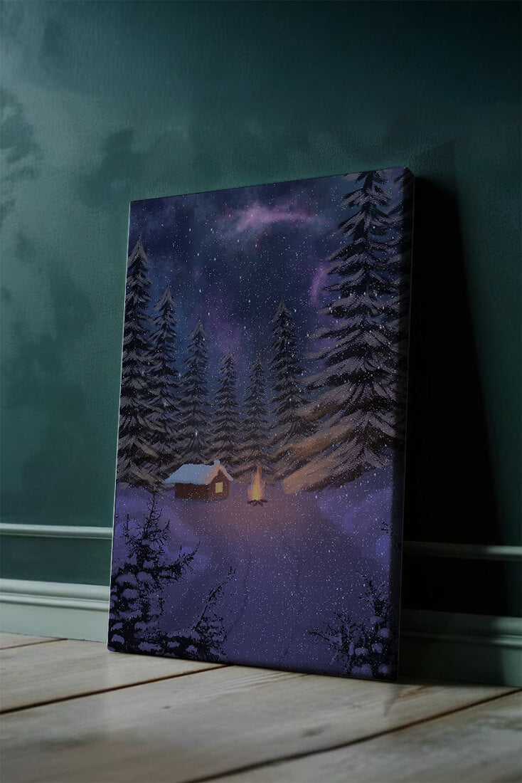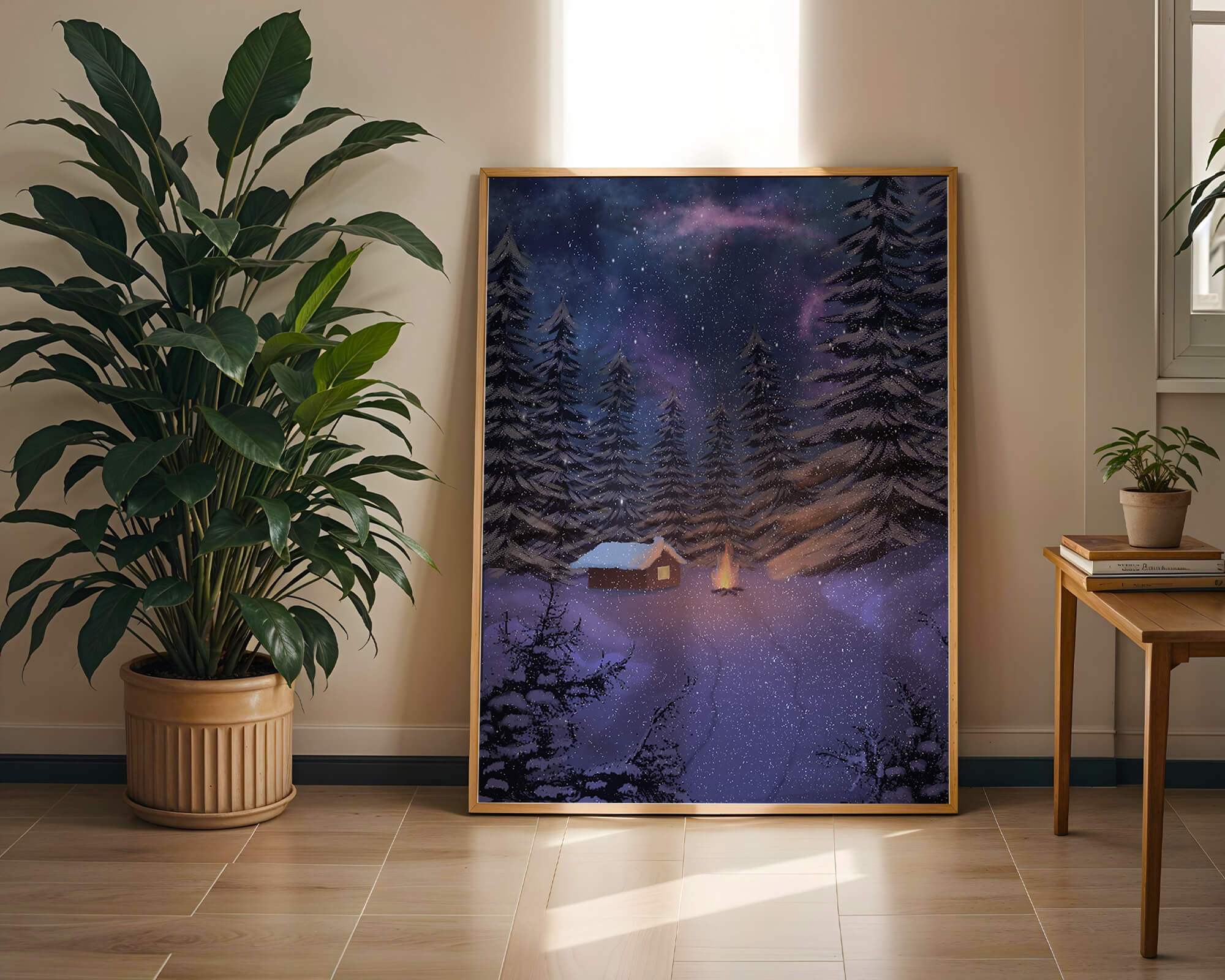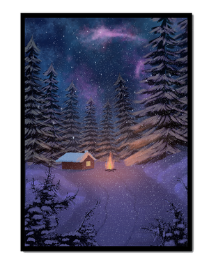The image depicts a delightful winter night, where snow gently falls onto a forest blanketed in white. At the heart of the scene stands a quaint cabin, its window glowing softly, shedding light into the quiet night. The surrounding forest, with its tall, snow-draped pines, creates a canopy that seems to cradle this solitary dwelling.In front of the cabin, a small campfire flickers warmly, casting a soft glow on the carpet of snow. The sky above is a deep, rich blue, sprinkled with stars that peer through softly with a hint of aurora, adding to the majesty of the scene. The overall atmosphere is one of peace and solitude, a perfect winter escape amidst natures grandeur.| Type |