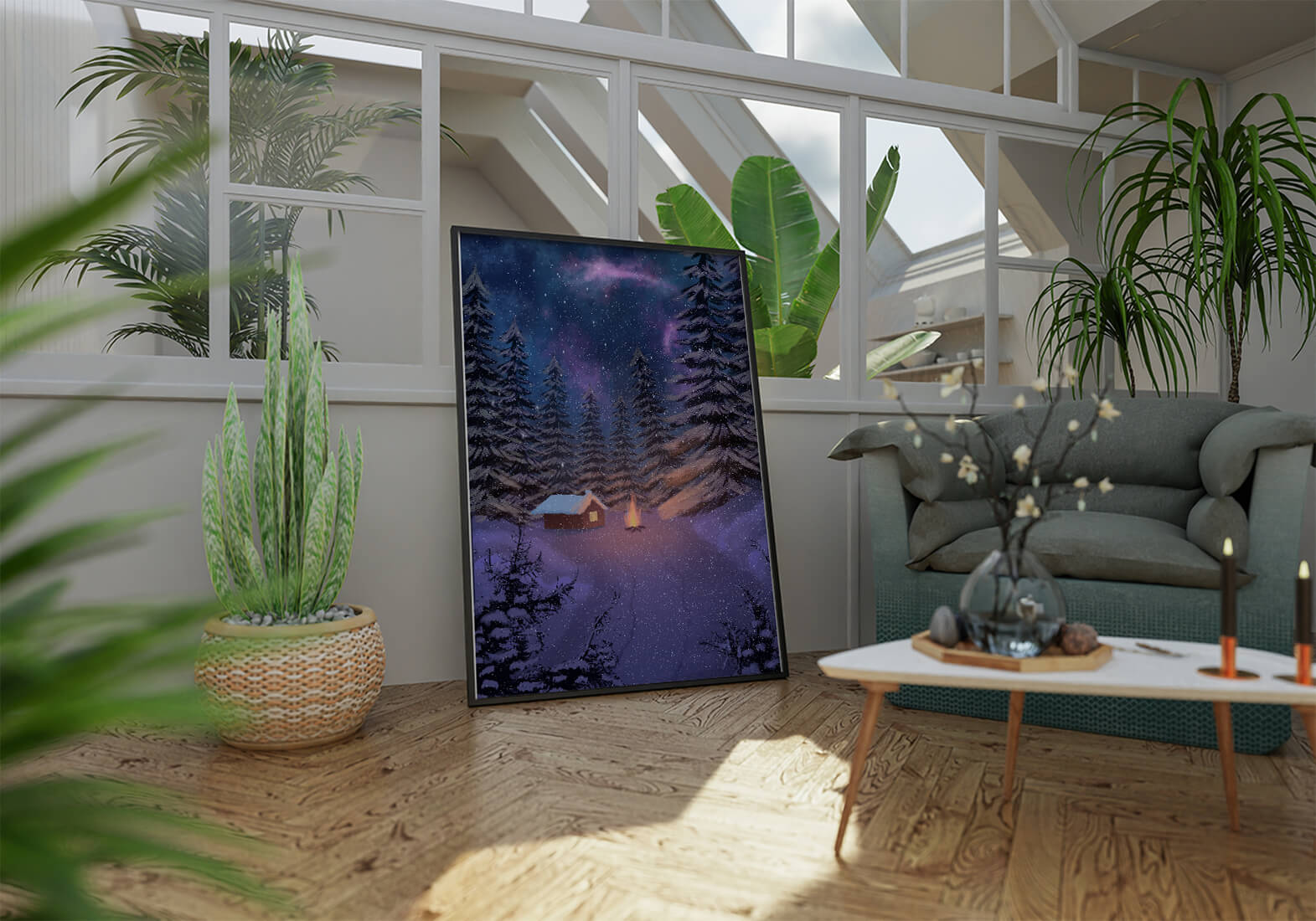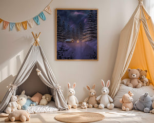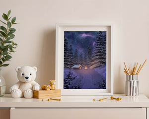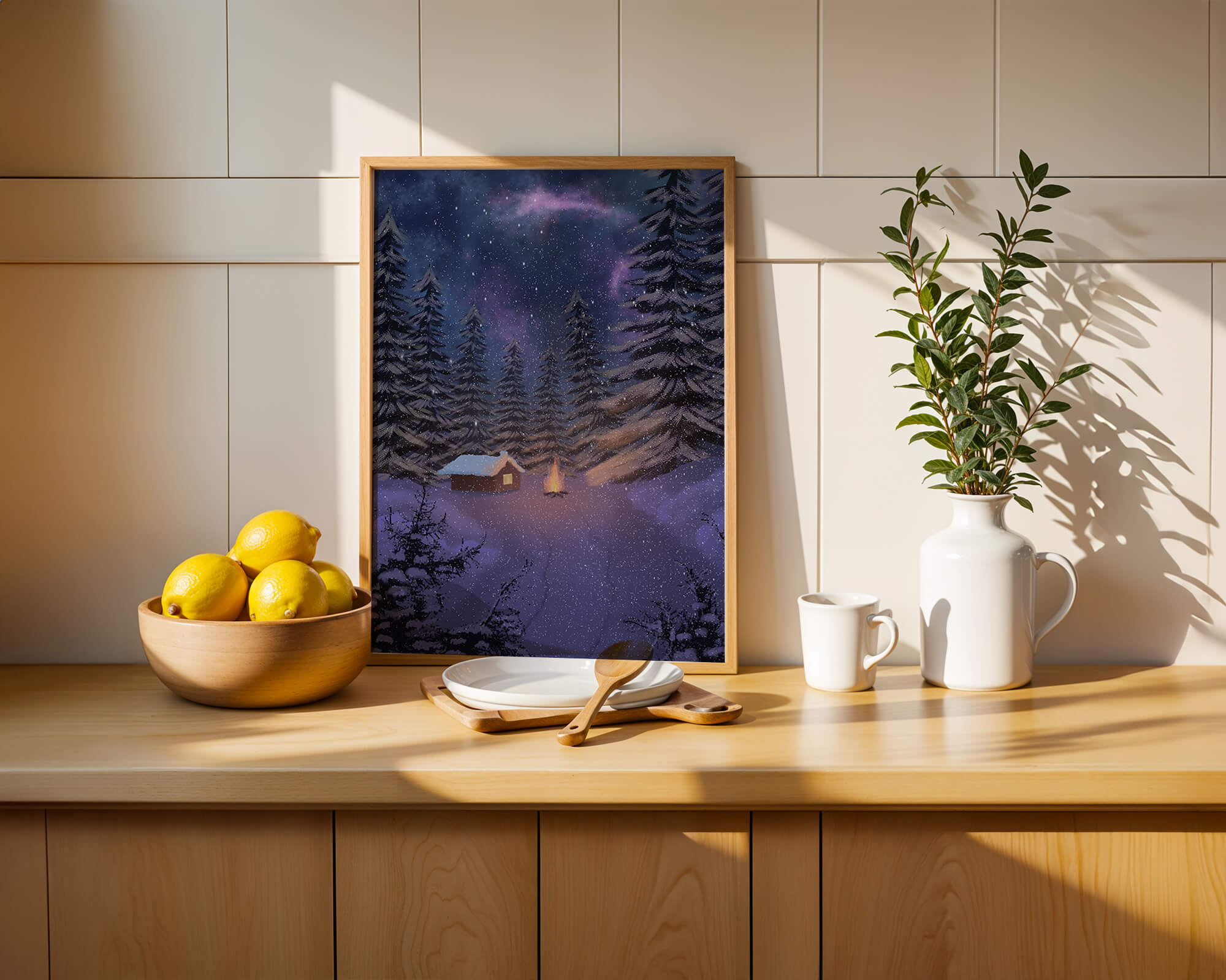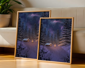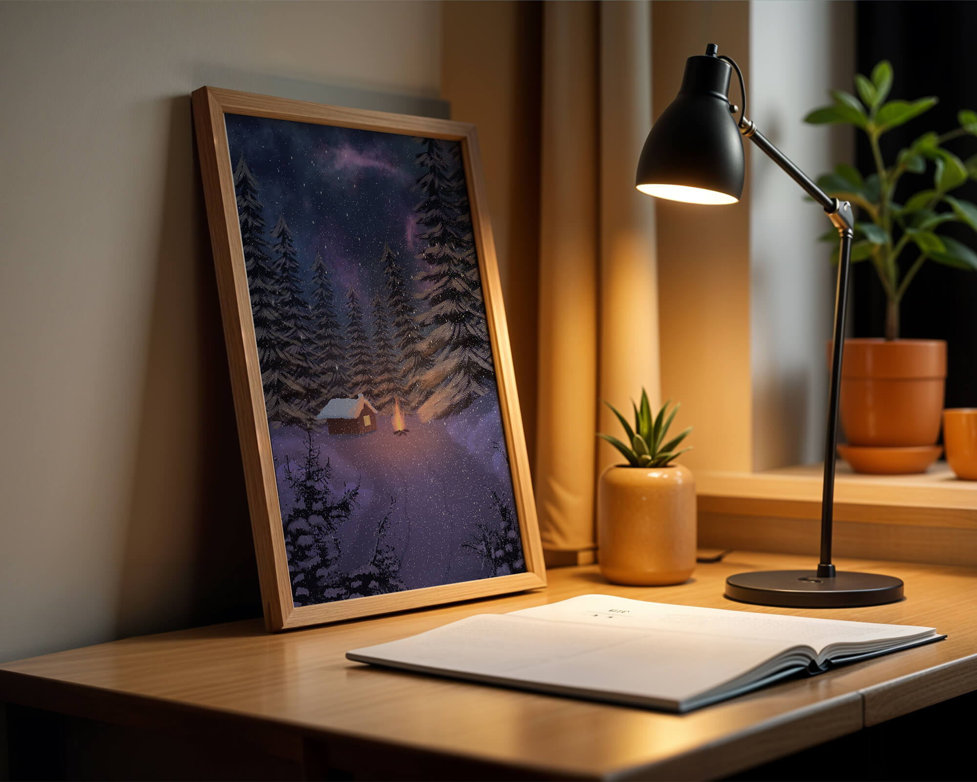 The image depicts a delightful winter night, where snow gently falls onto a forest blanketed in white. At the heart of the scene stands a quaint cabin, its window glowing softly, shedding light into the quiet night. The surrounding forest, with its tall, snow-draped pines, creates a canopy that seems to cradle this solitary dwelling.In front of the cabin, a small campfire flickers warmly, casting a soft glow on the carpet of snow. The sky above is a deep, rich blue, sprinkled with stars that peer through softly with a hint of aurora, adding to the majesty of the scene. The overall atmosphere is one of peace and solitude, a perfect winter escape amidst natures grandeur.| Type |