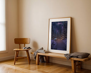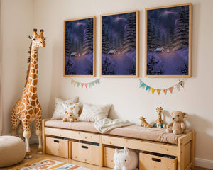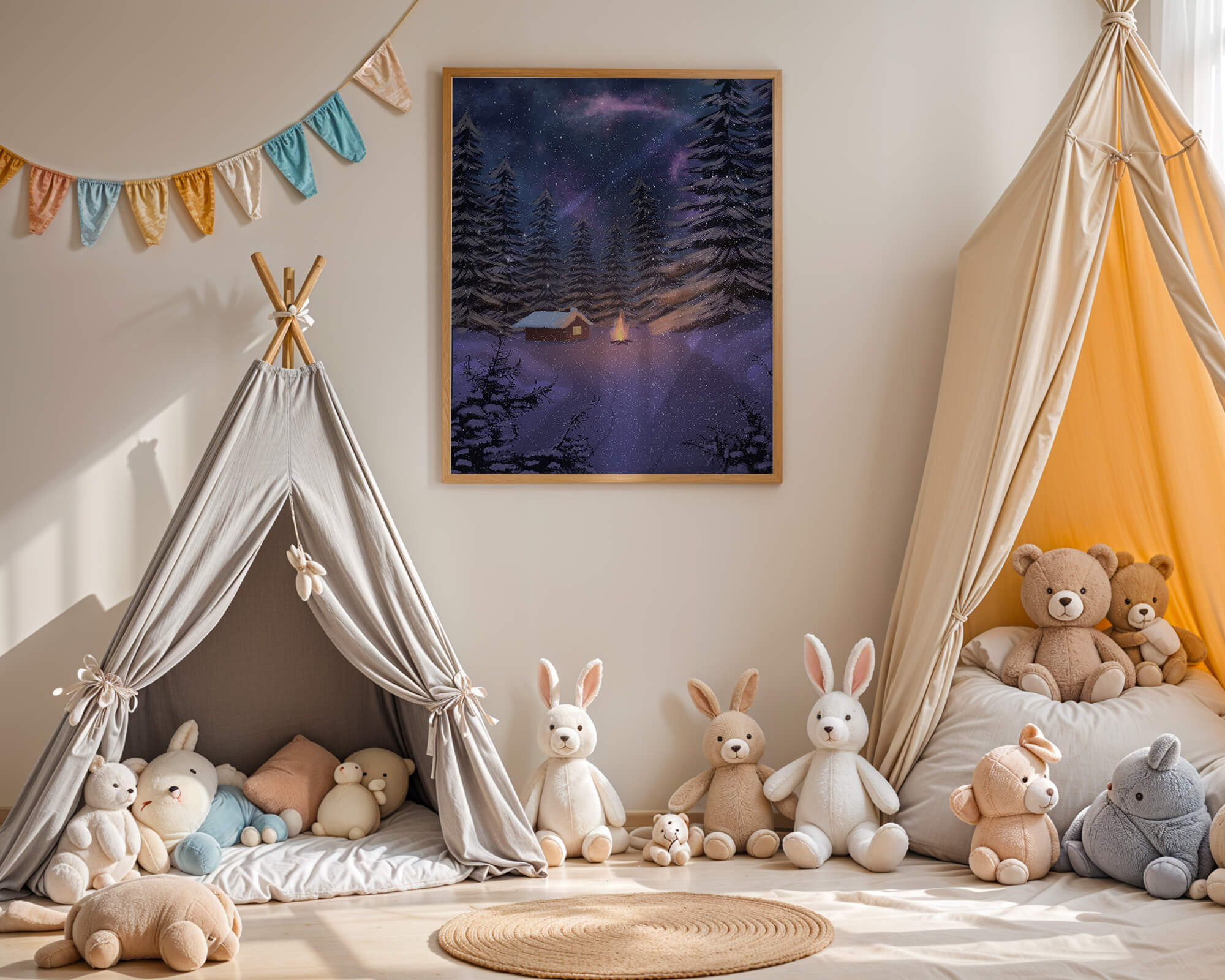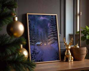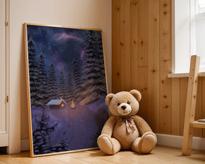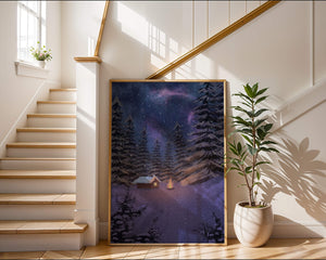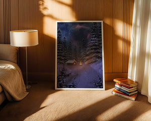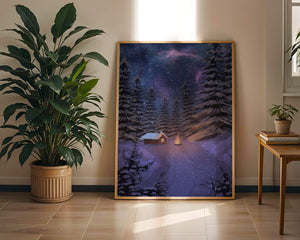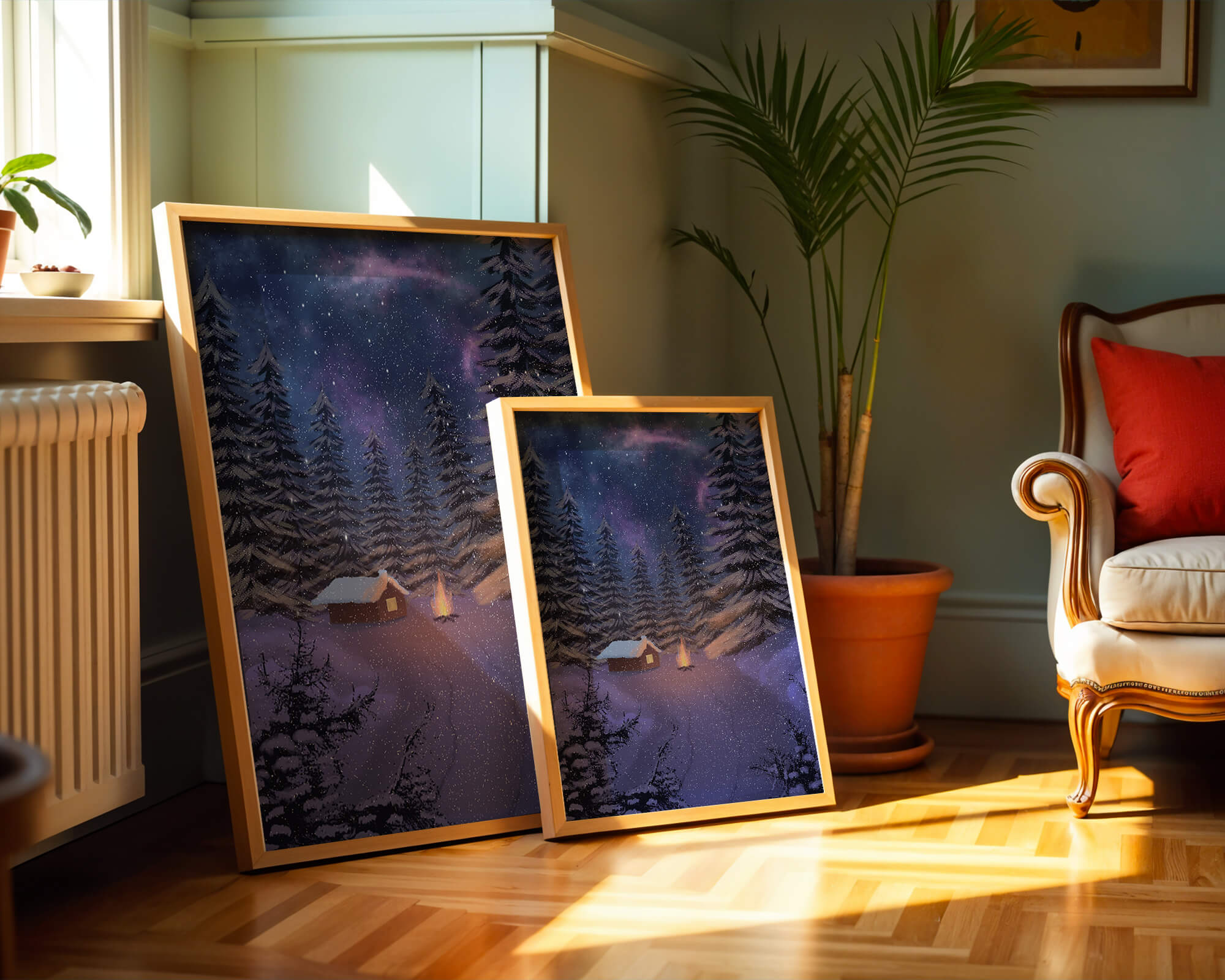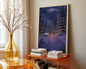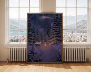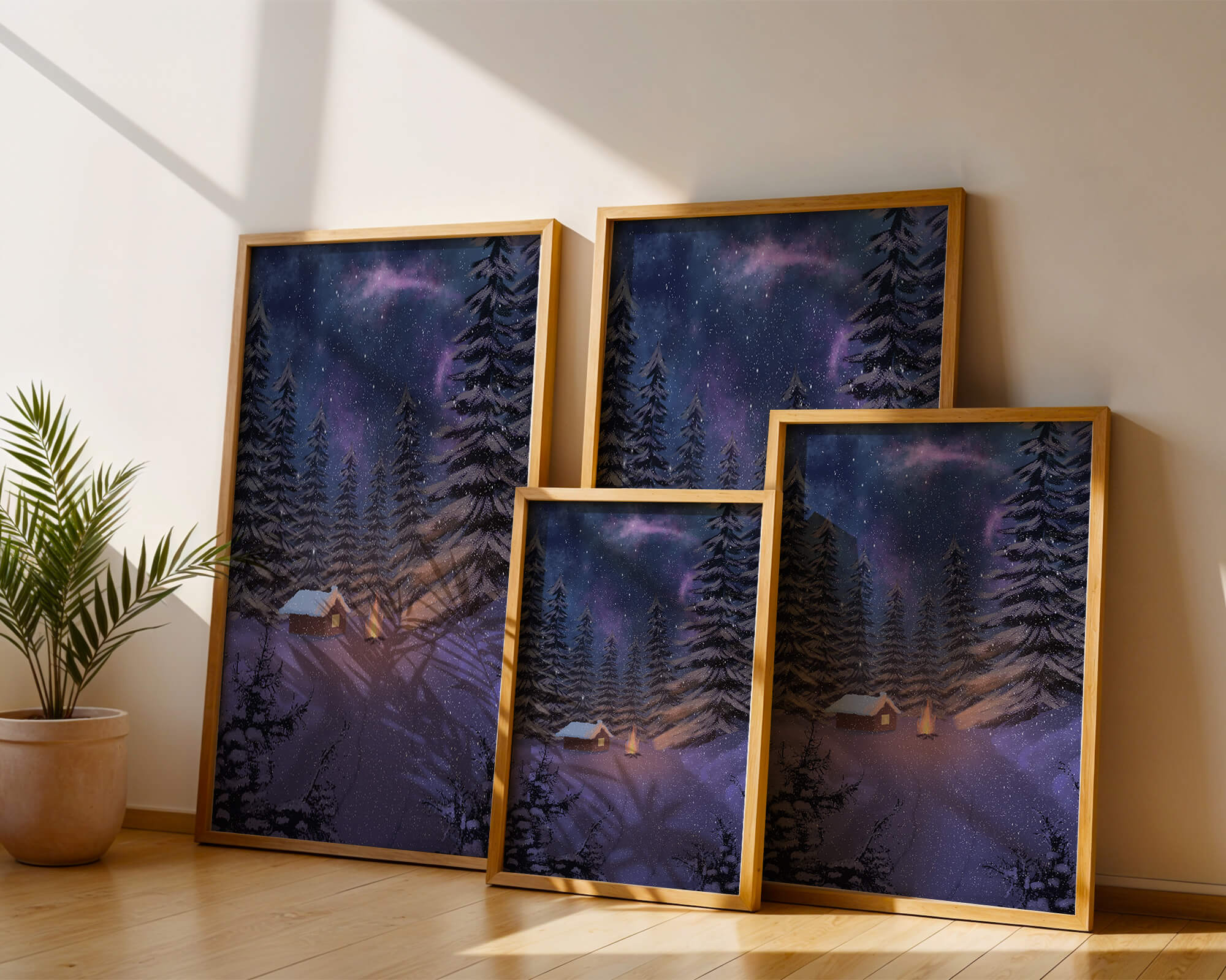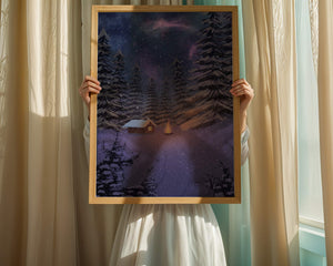 A serene winter night scene captures the essence of tranquility in a snow-covered forest. A small, cozy cabin glows warmly amidst towering pine trees, offering a sense of comfort and refuge from the cold.