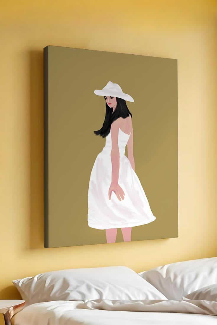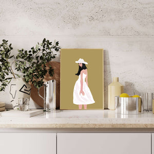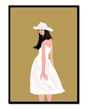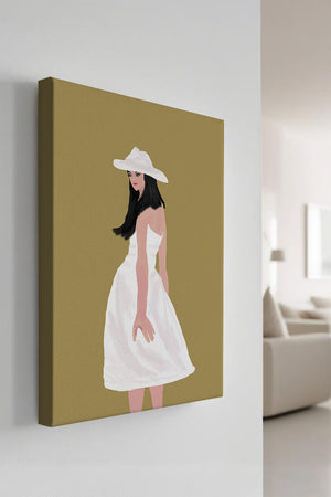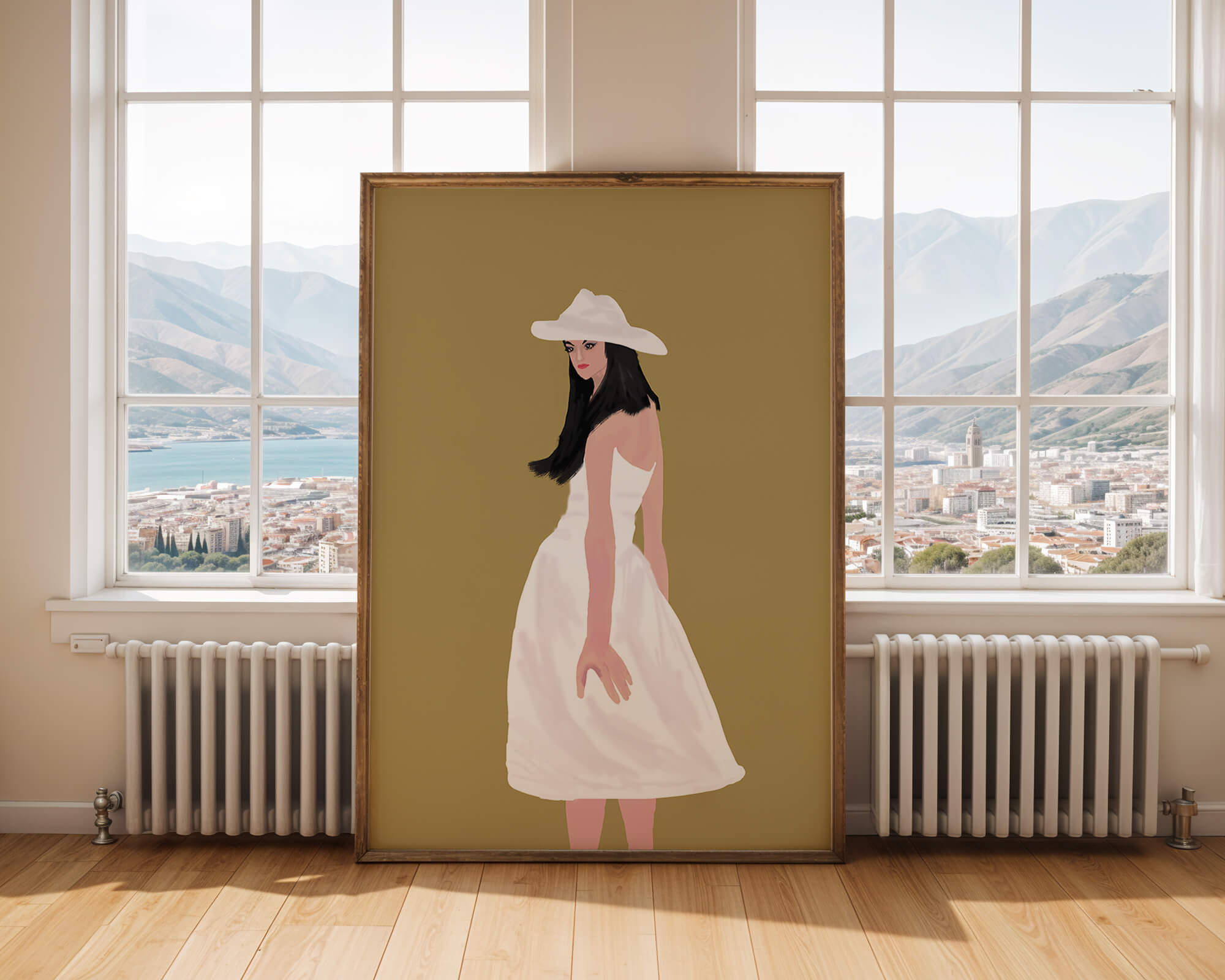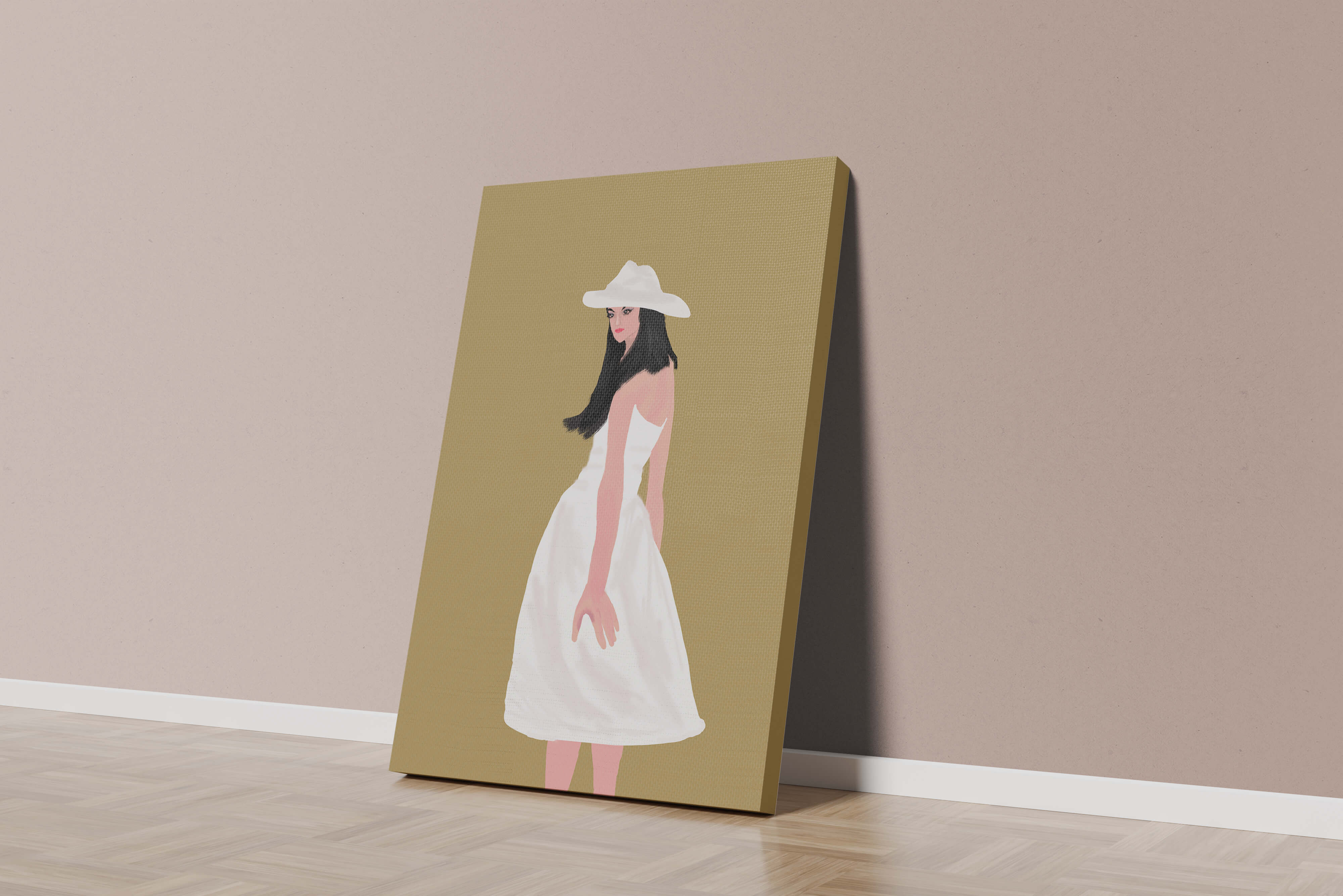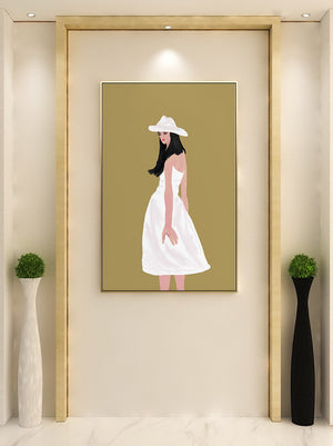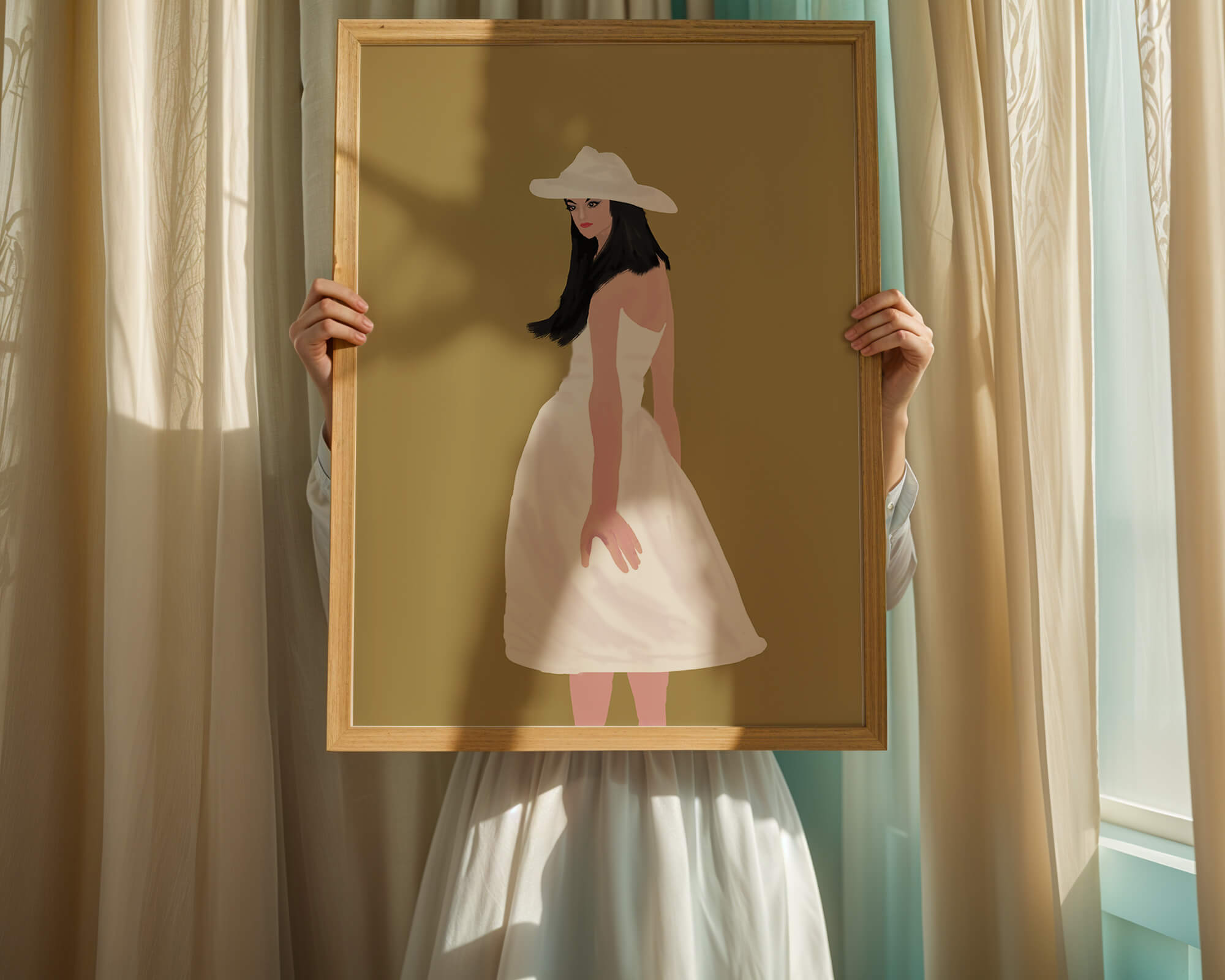 The image artistically illustrates a woman wearing a sophisticated white dress paired with a wide-brimmed hat, exuding elegance and poise. The gold background creates a stunning contrast, further highlighting the womans refined presence.This composition combines elements of modern art with traditional portrait style. The minimalist attire and the bold choice of background work together to emphasize the subjects grace and allure. Ideal for settings that seek to inspire a sense of sophistication and contemporary fashion.| Type |
