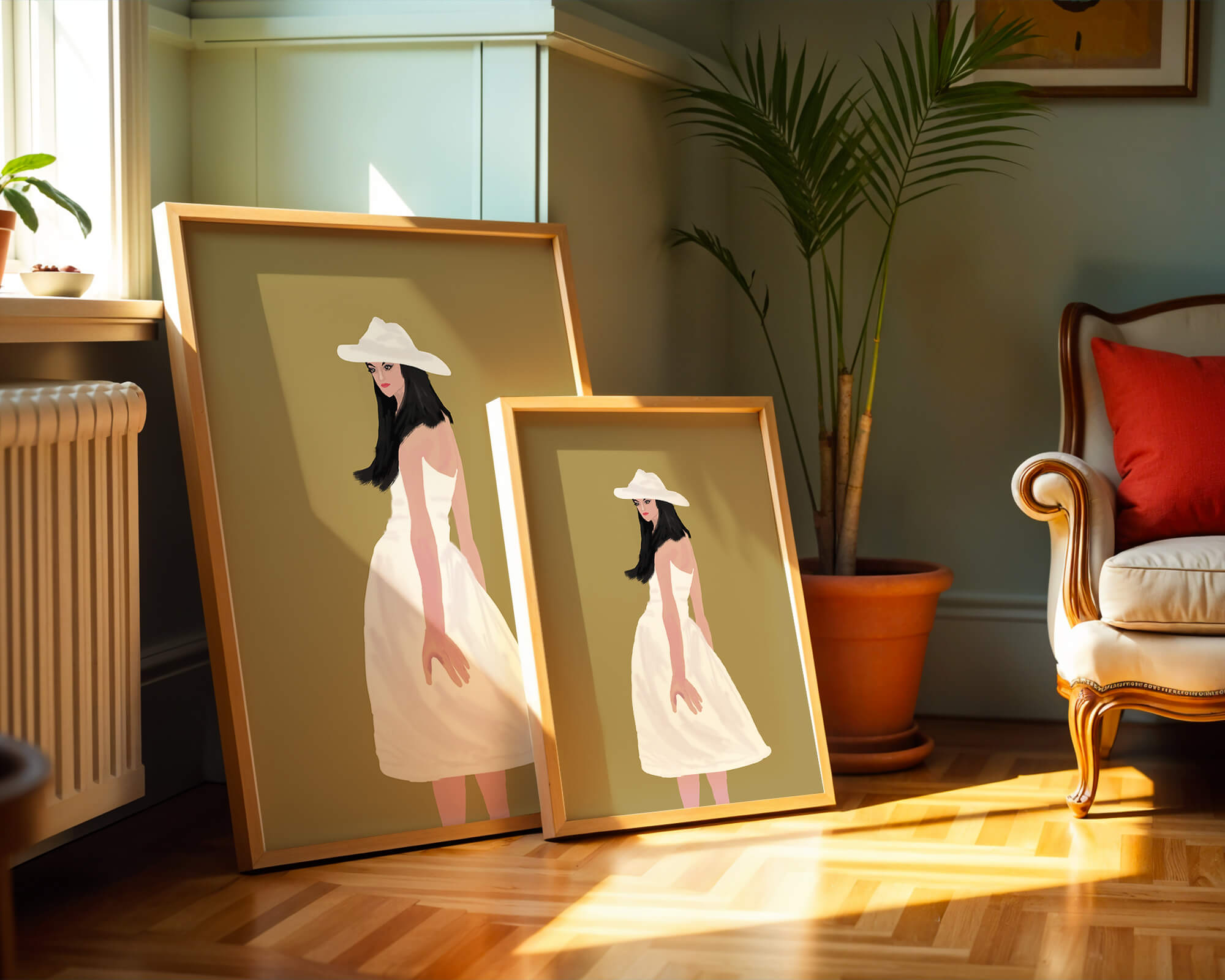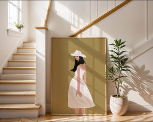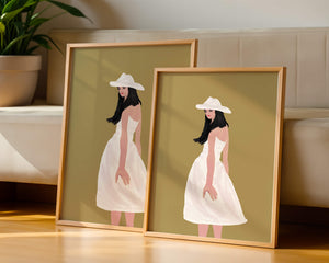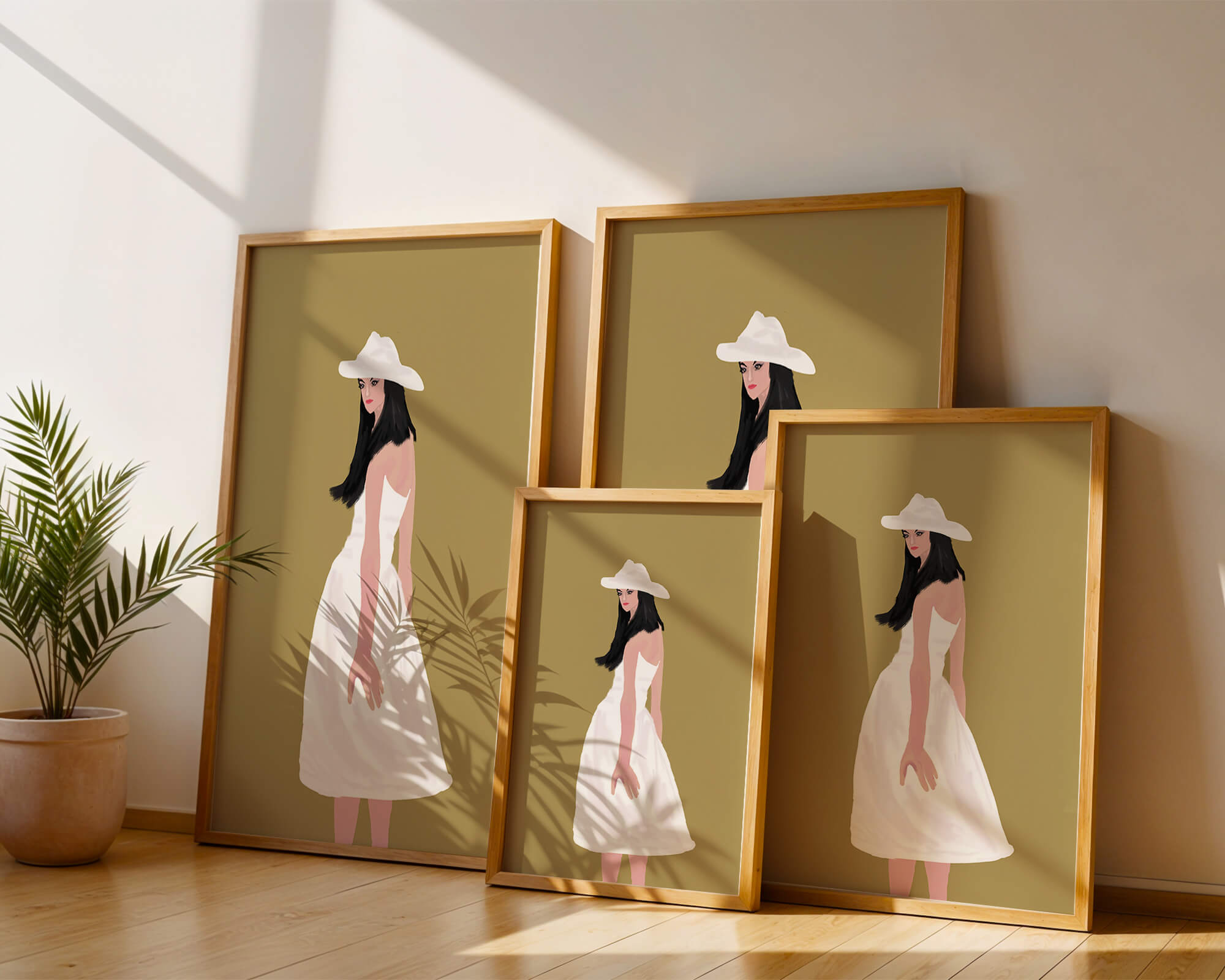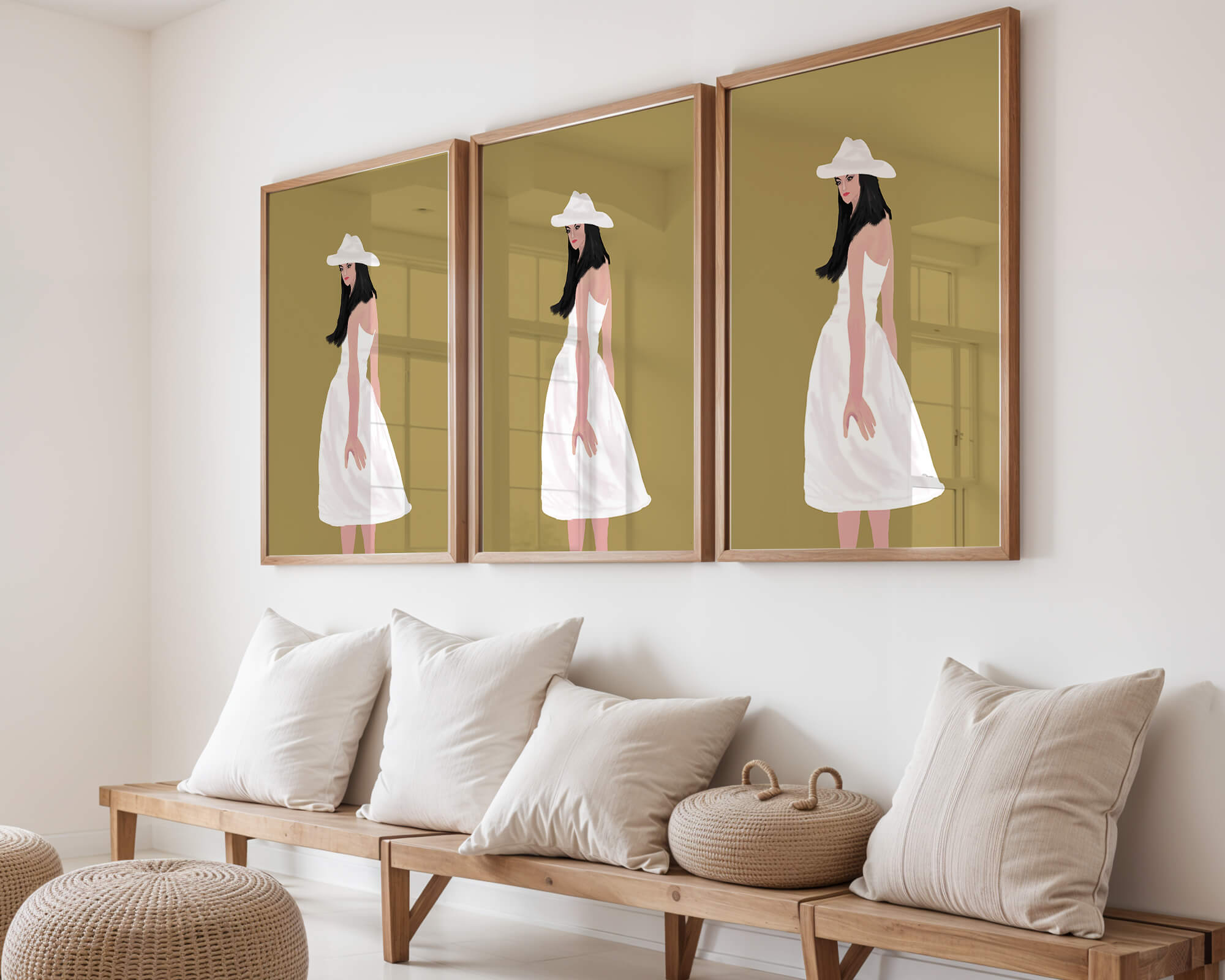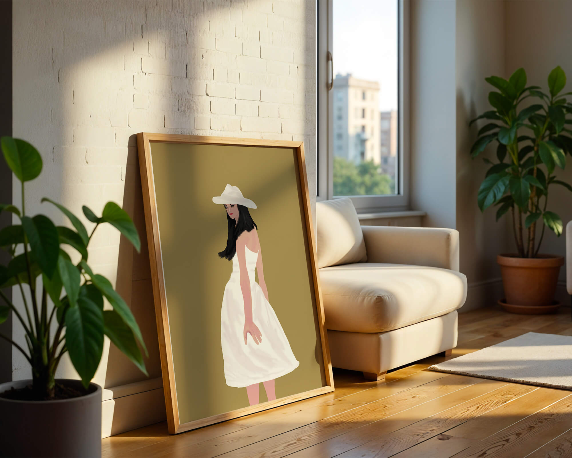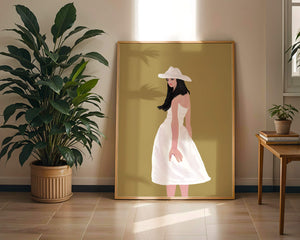 The image artistically illustrates a woman wearing a sophisticated white dress paired with a wide-brimmed hat, exuding elegance and poise. The gold background creates a stunning contrast, further highlighting the womans refined presence.This composition combines elements of modern art with traditional portrait style. The minimalist attire and the bold choice of background work together to emphasize the subjects grace and allure. Ideal for settings that seek to inspire a sense of sophistication and contemporary fashion.| Type |