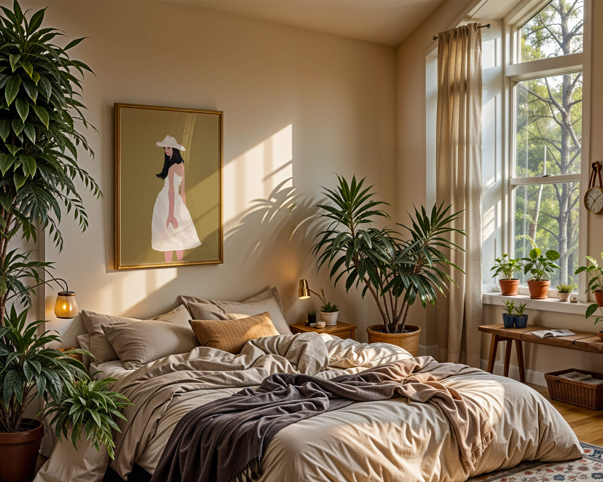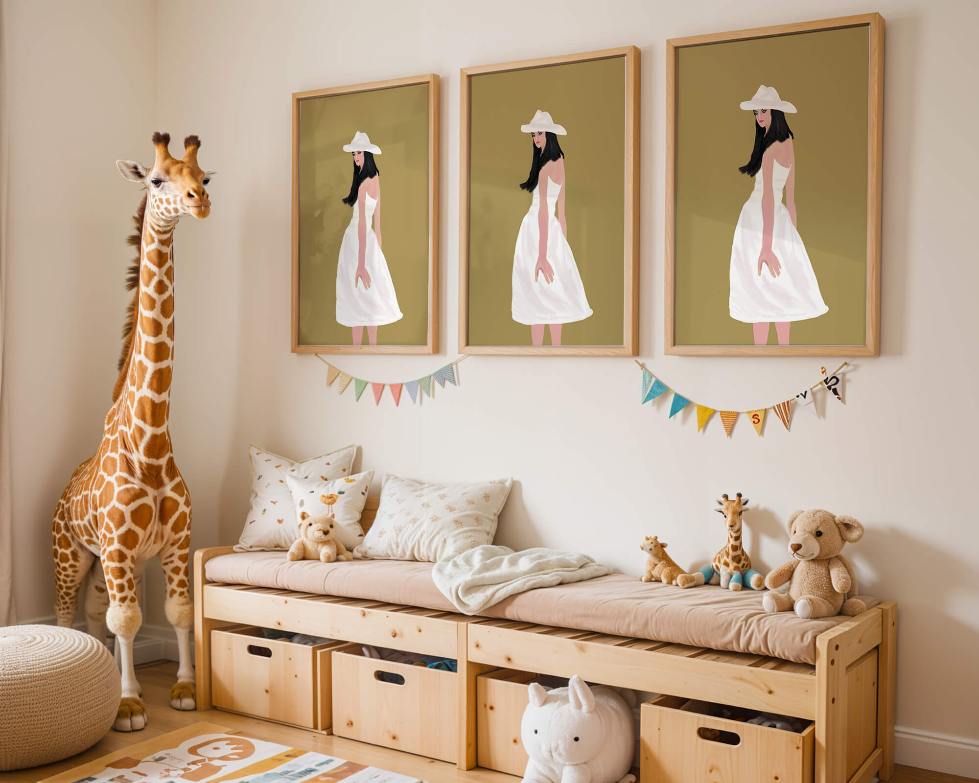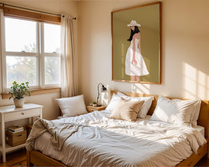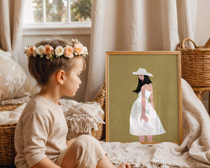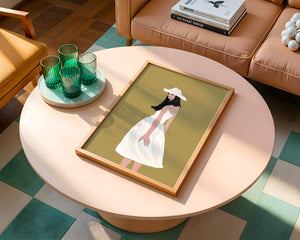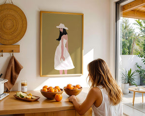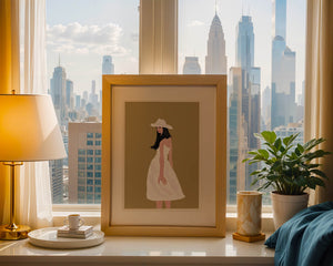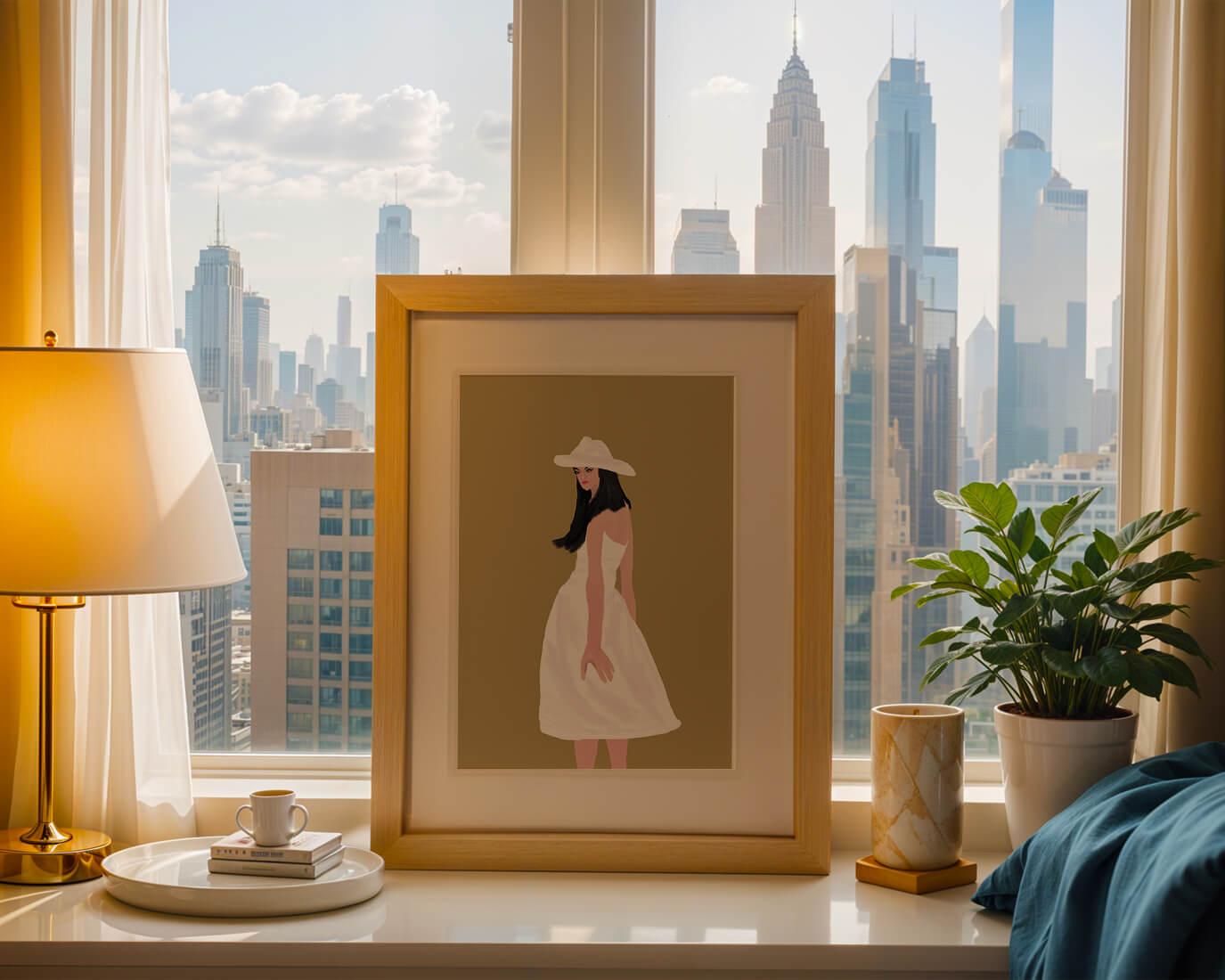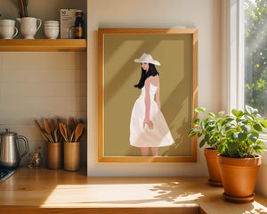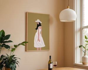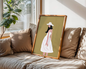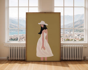 The image artistically illustrates a woman wearing a sophisticated white dress paired with a wide-brimmed hat, exuding elegance and poise. The gold background creates a stunning contrast, further highlighting the womans refined presence.This composition combines elements of modern art with traditional portrait style. The minimalist attire and the bold choice of background work together to emphasize the subjects grace and allure. Ideal for settings that seek to inspire a sense of sophistication and contemporary fashion.| Type |