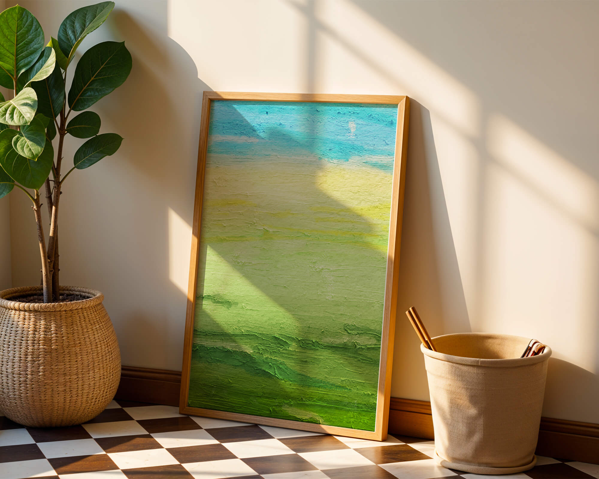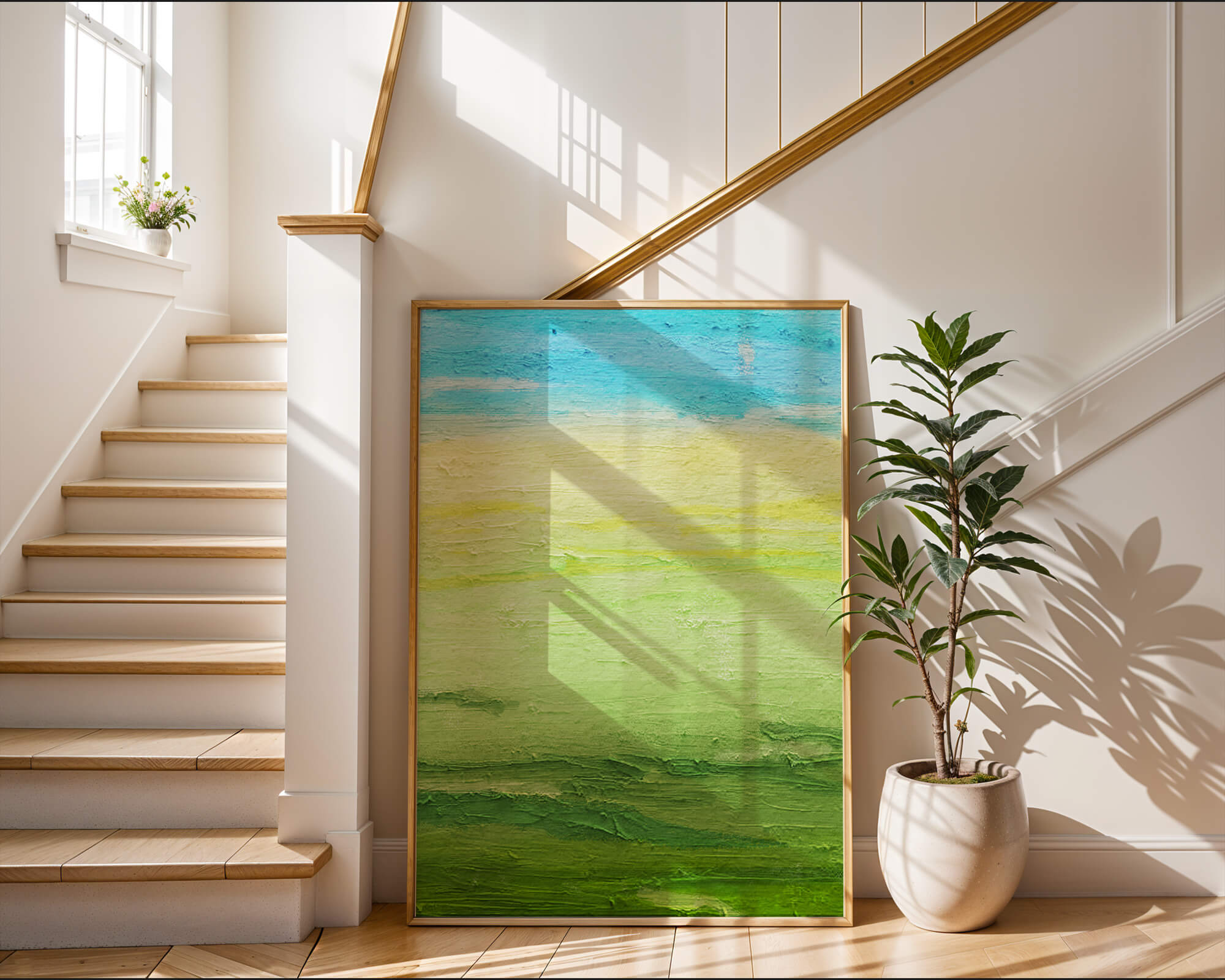 The image features an abstract landscape with a soothing blend of blues, yellows, and greens. The sky is depicted in shades of blue, transitioning into earthy green fields below, representing a peaceful natural setting. The texture in the painting adds depth and interest, evoking a sense of calm and tranquility.The understated simplicity and minimalistic design make it a perfect choice for those looking to add a touch of elegance and serenity to their space. The harmonious palette and gentle transitions invite contemplation and relaxation, creating a peaceful ambiance wherever it is displayed.