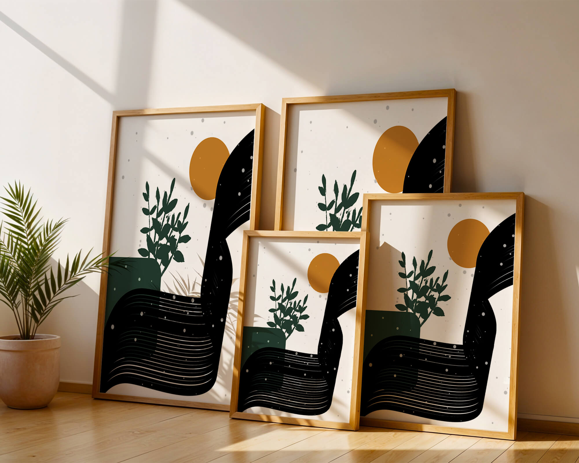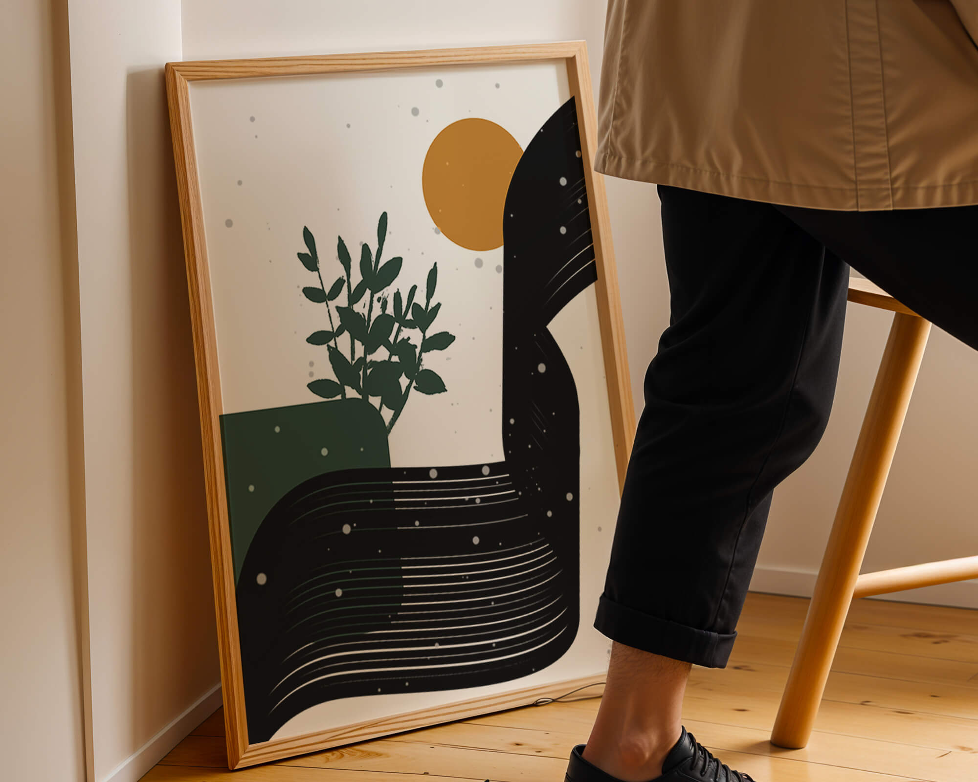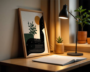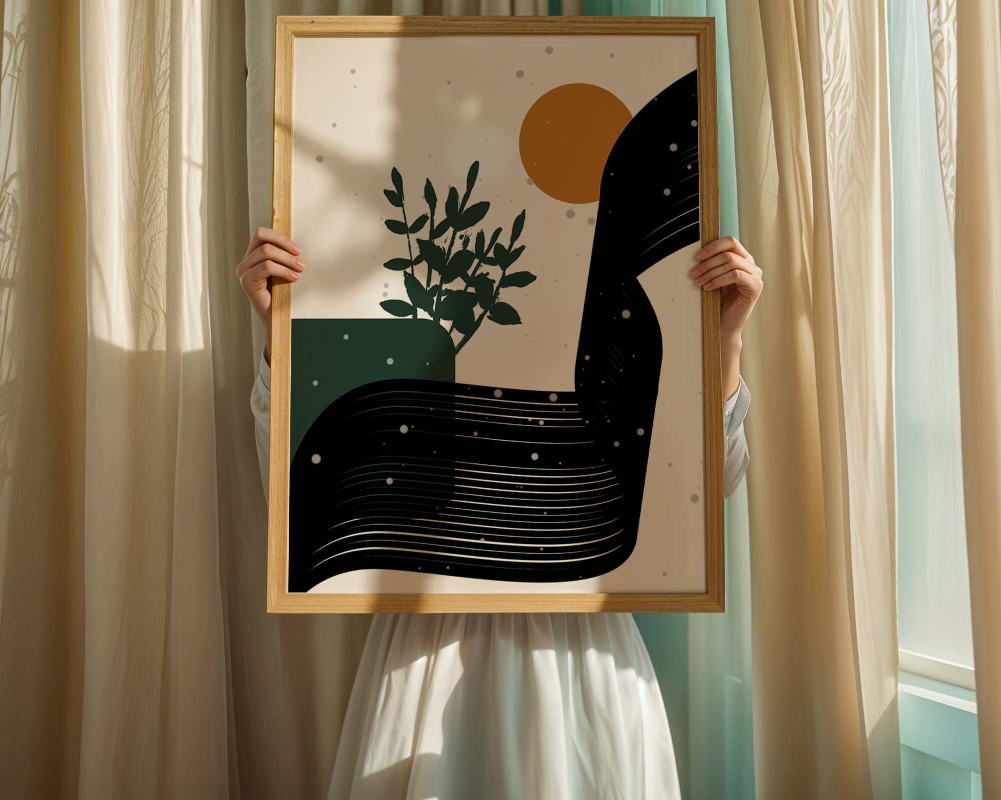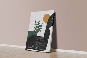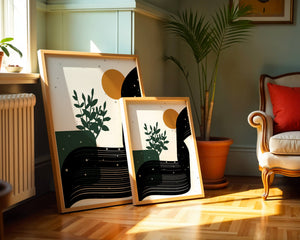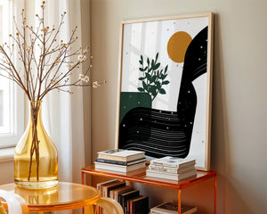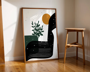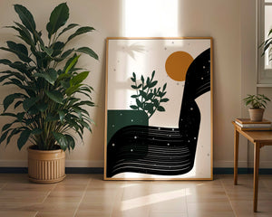 This abstract artwork presents a harmonious blend of natural and geometric elements. A dark green plant silhouette stands prominently against a minimalist backdrop, accompanied by a bold, curved black shape and a warm orange circle reminiscent of the sun.