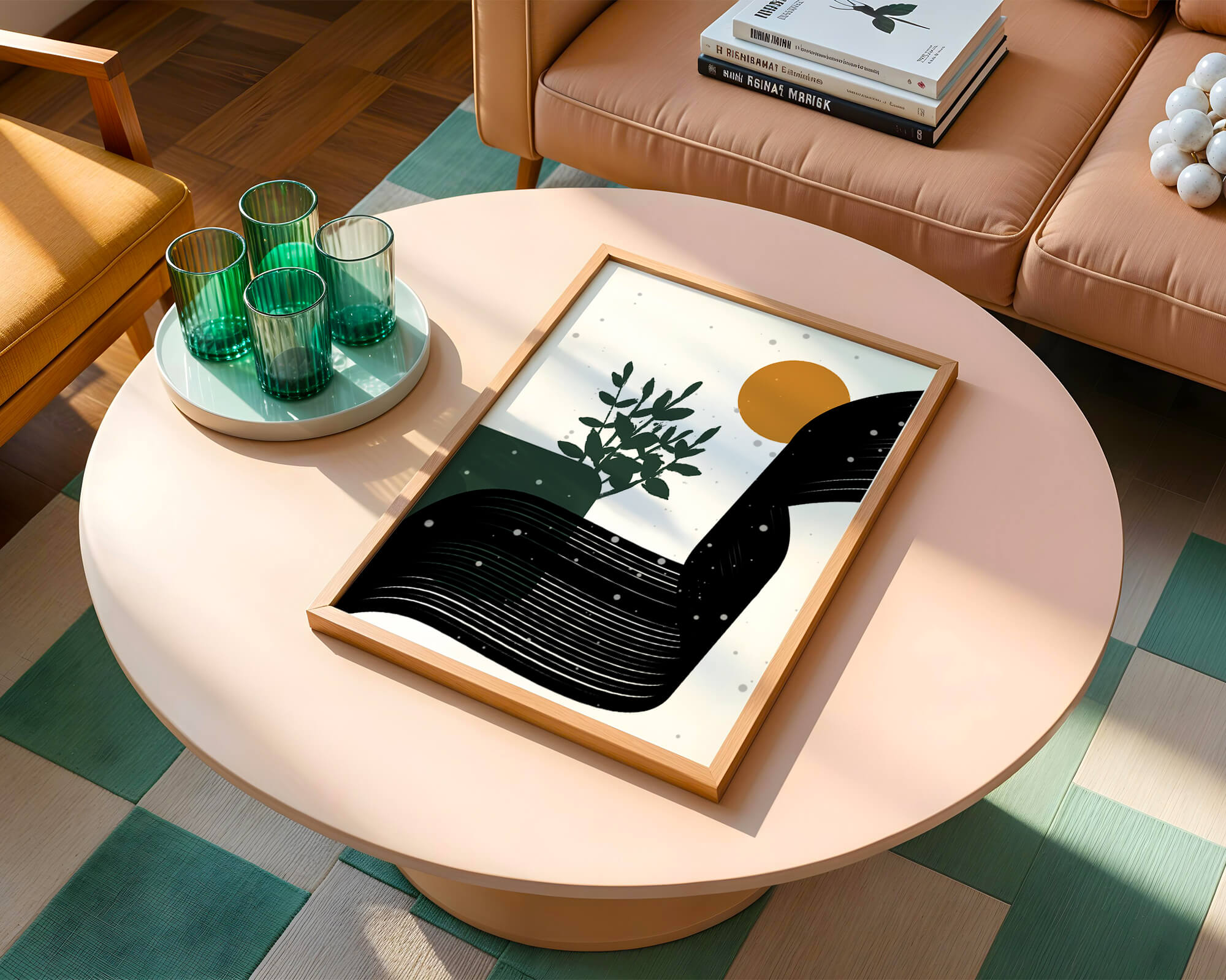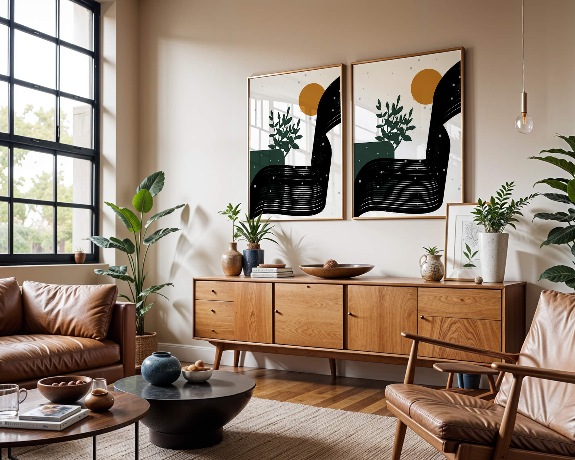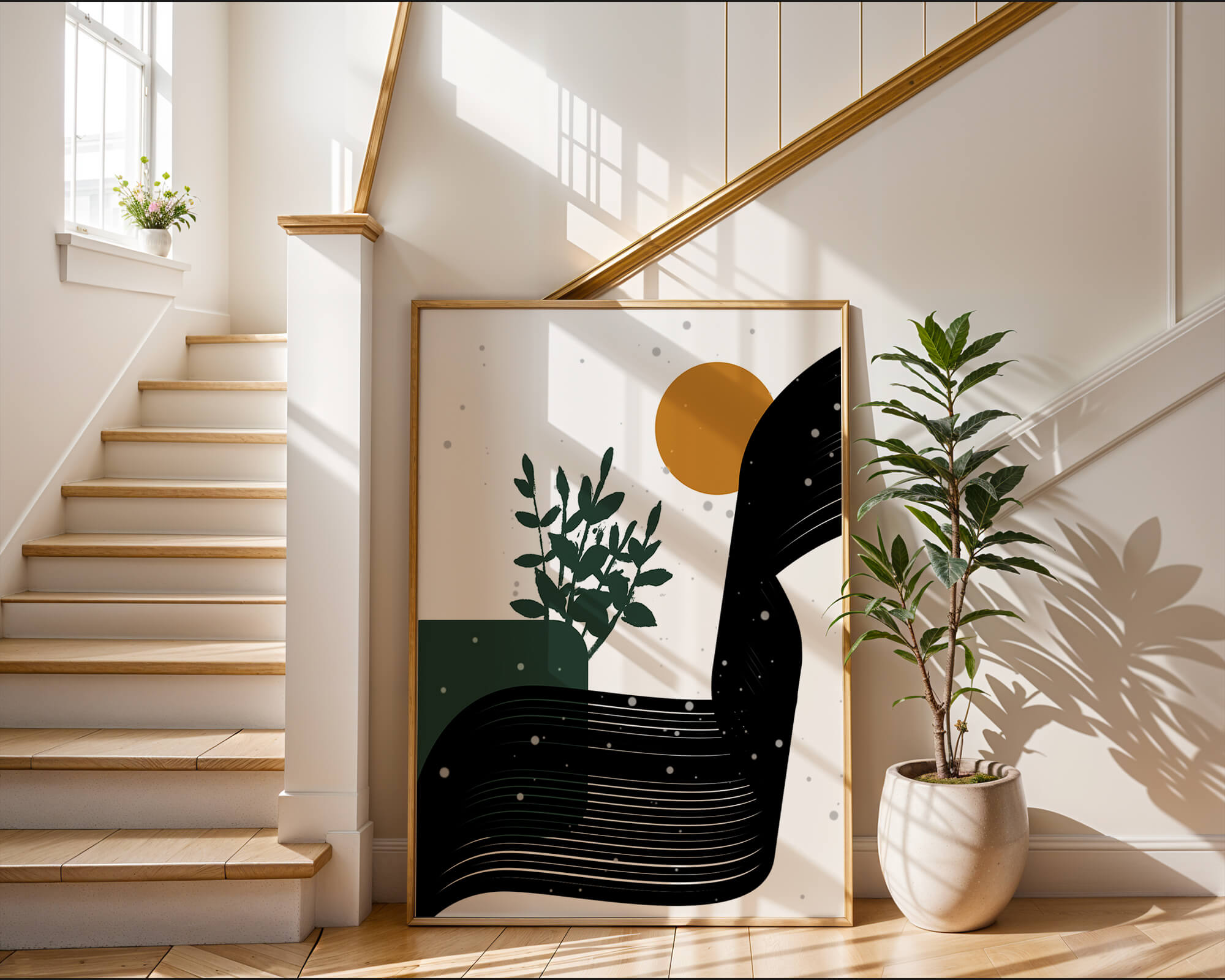 This abstract artwork presents a harmonious blend of natural and geometric elements. A dark green plant silhouette stands prominently against a minimalist backdrop, accompanied by a bold, curved black shape and a warm orange circle reminiscent of the sun.
