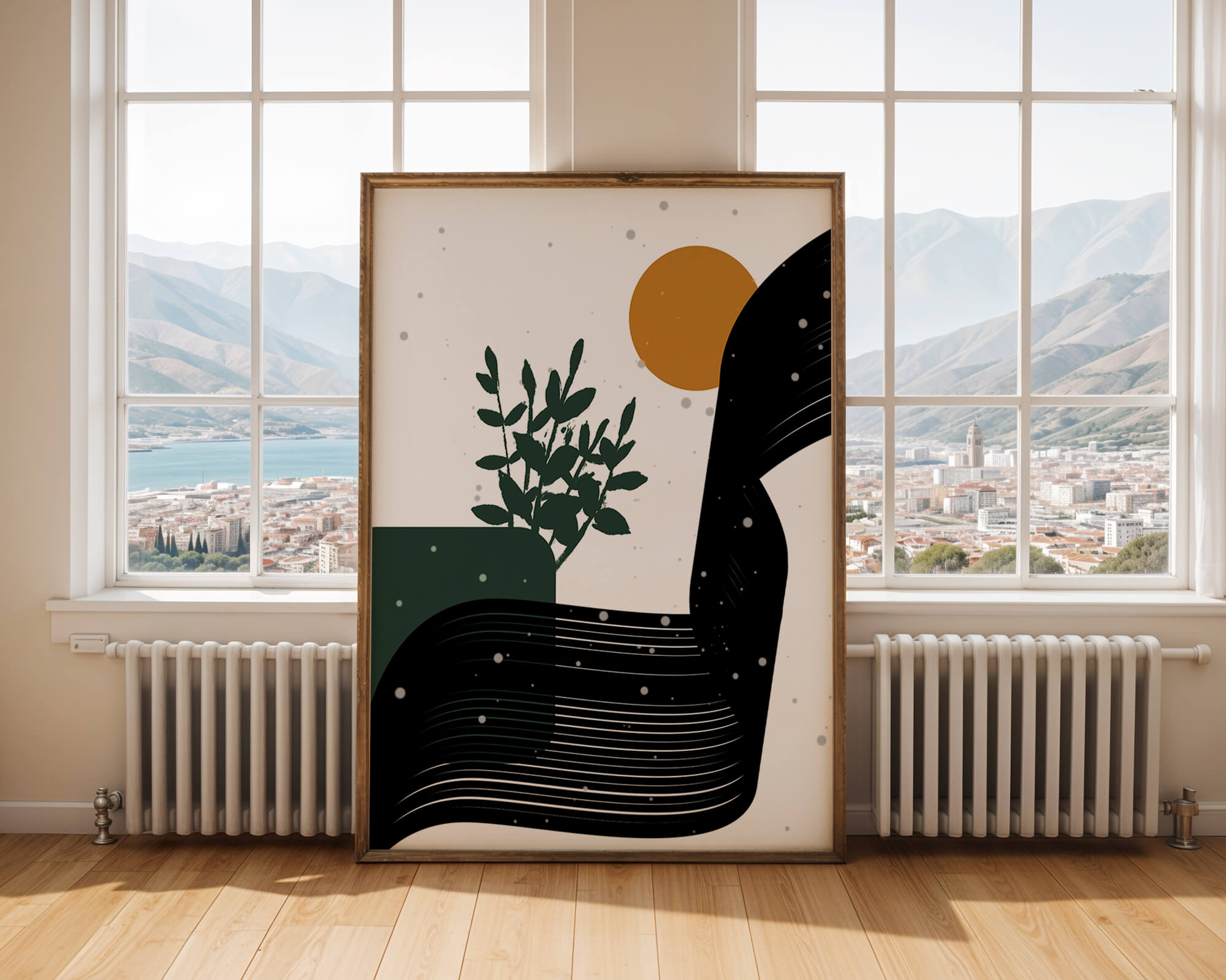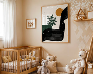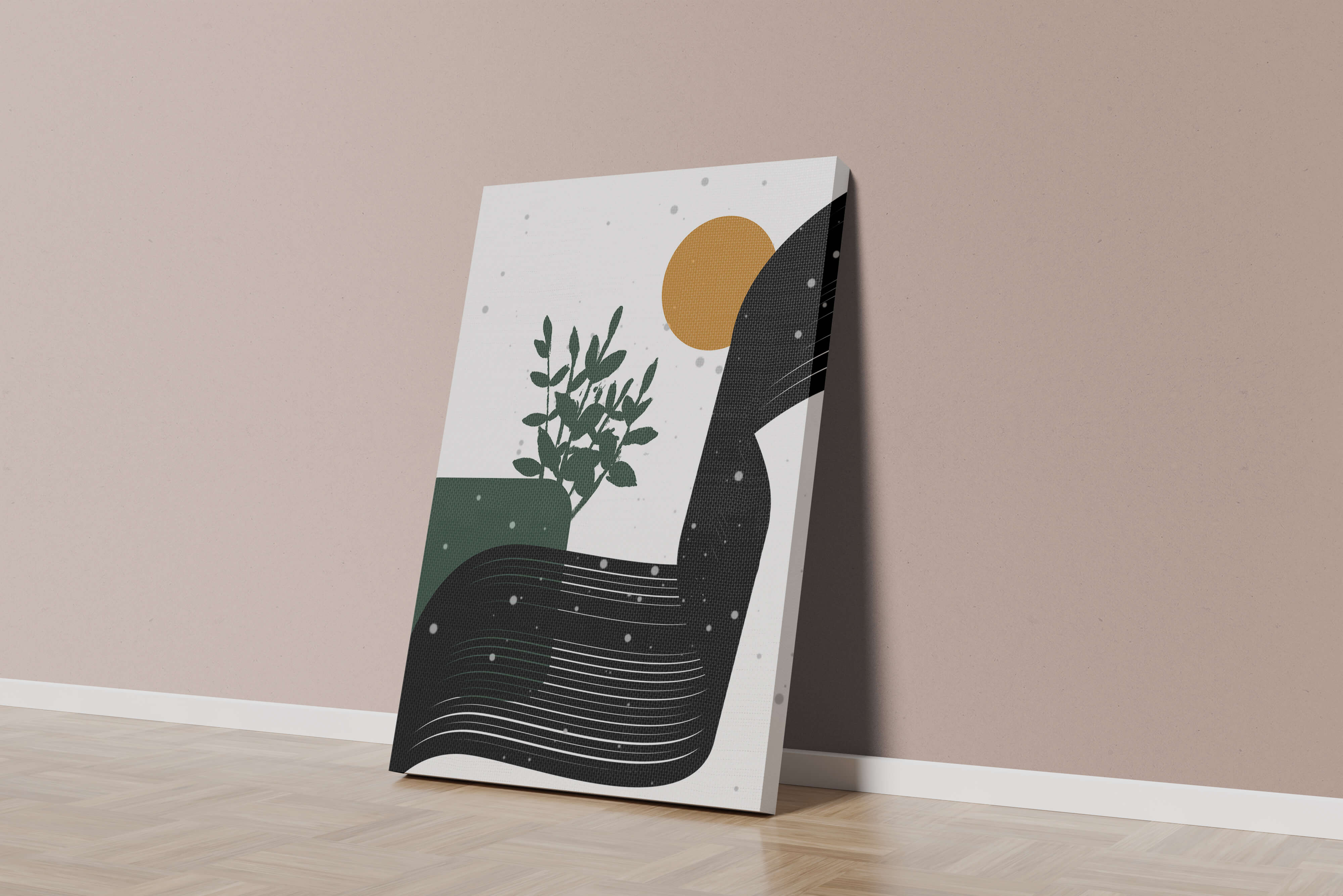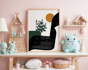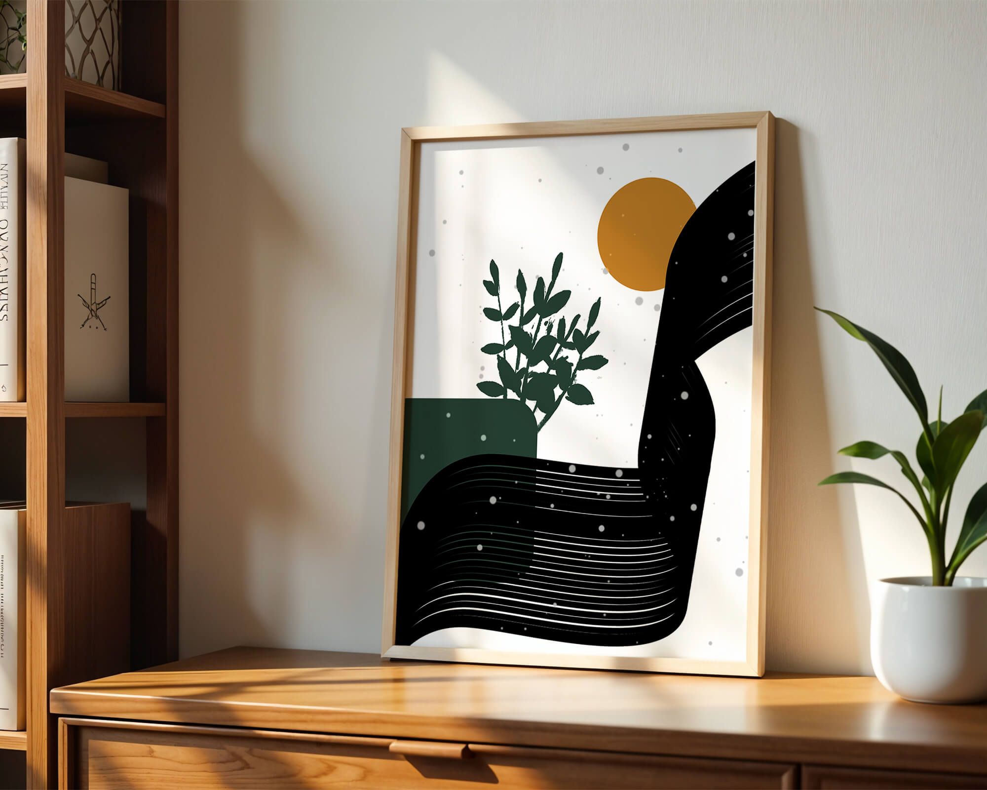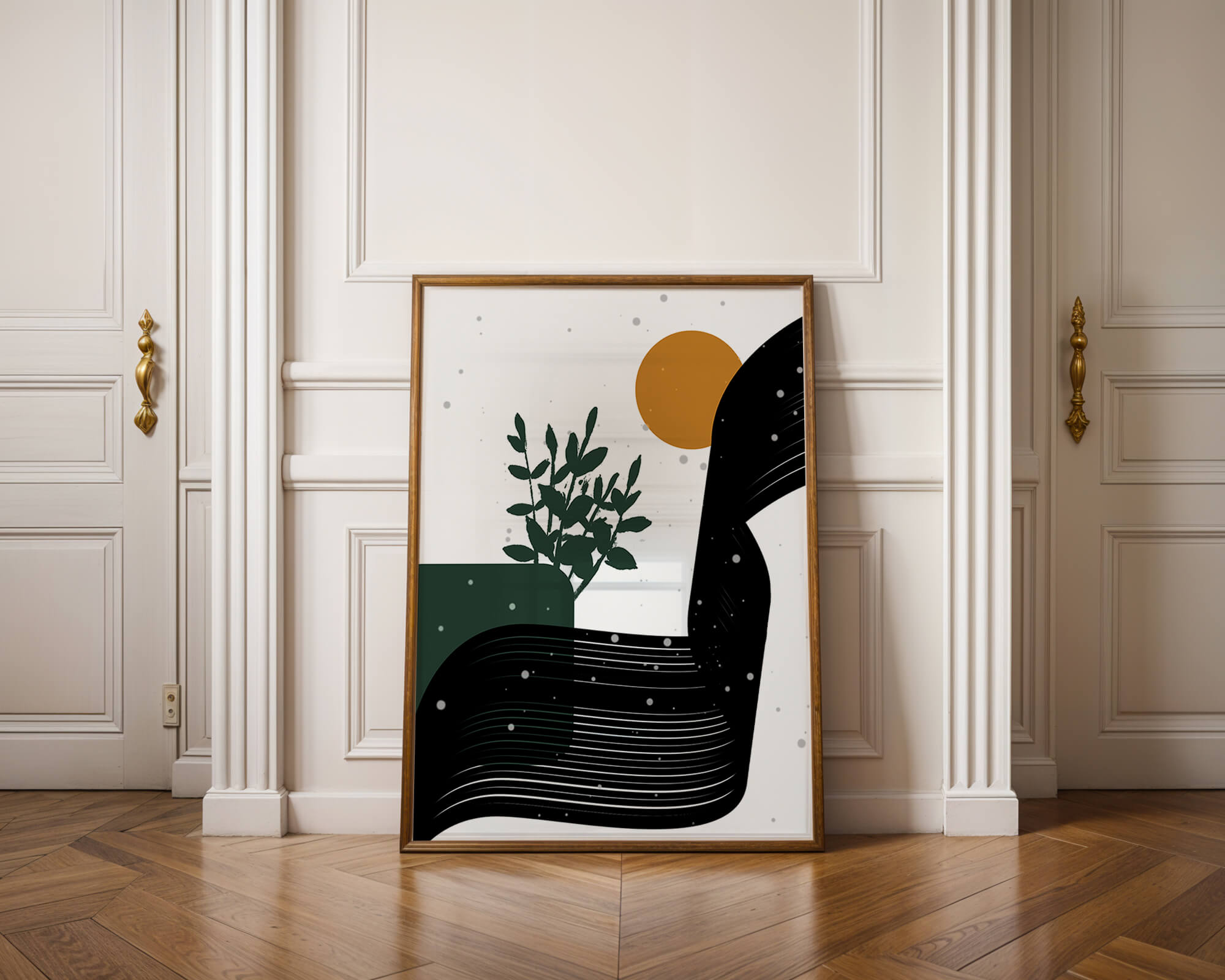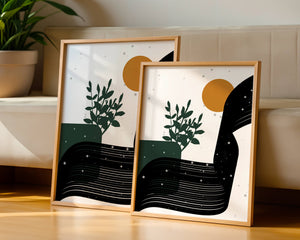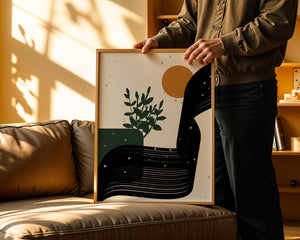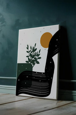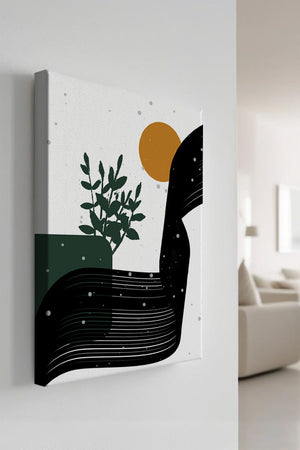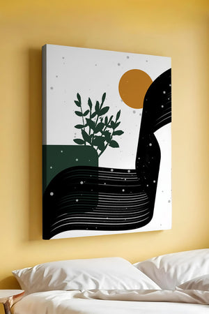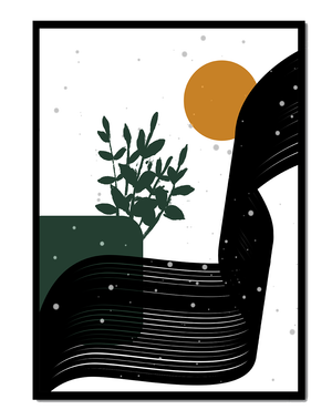 In this piece, the simplicity of form and color comes together to create an elegant design that plays with the contrast between organic and geometric shapes. The dark green plant silhouette anchors the composition, adding a touch of nature to the abstract scene. Meanwhile, the flowing black lines introduce a dynamic movement across the image, drawing the eye along its curves.The warm orange circle suggests a sun, bringing warmth to the otherwise restrained color palette. The snow-like dots scattered throughout add a whimsical touch, enhancing the connection between nature and abstraction. This versatile artwork is perfect for modern interiors, offering a sophisticated accent to spaces like living rooms, bedrooms, or offices.