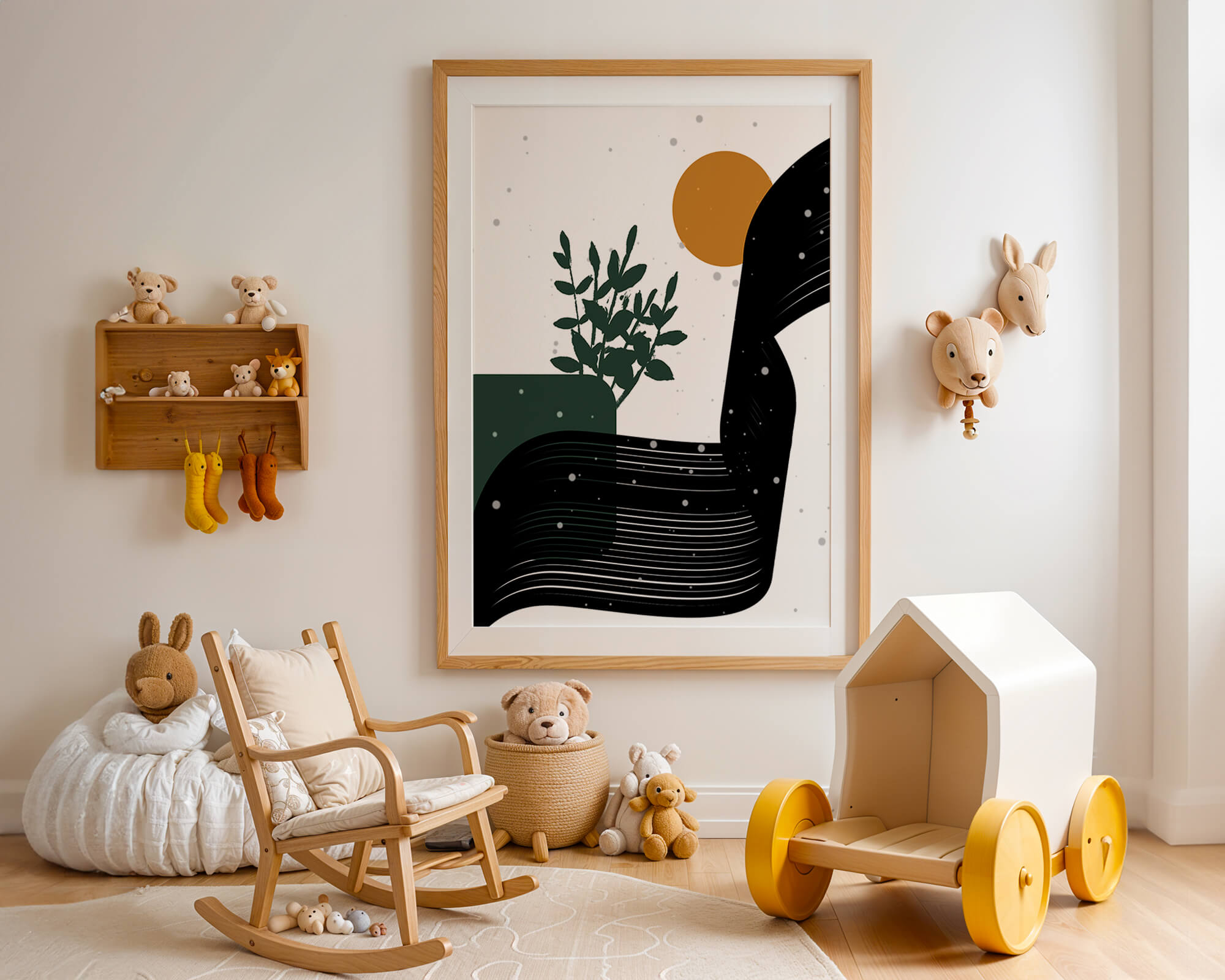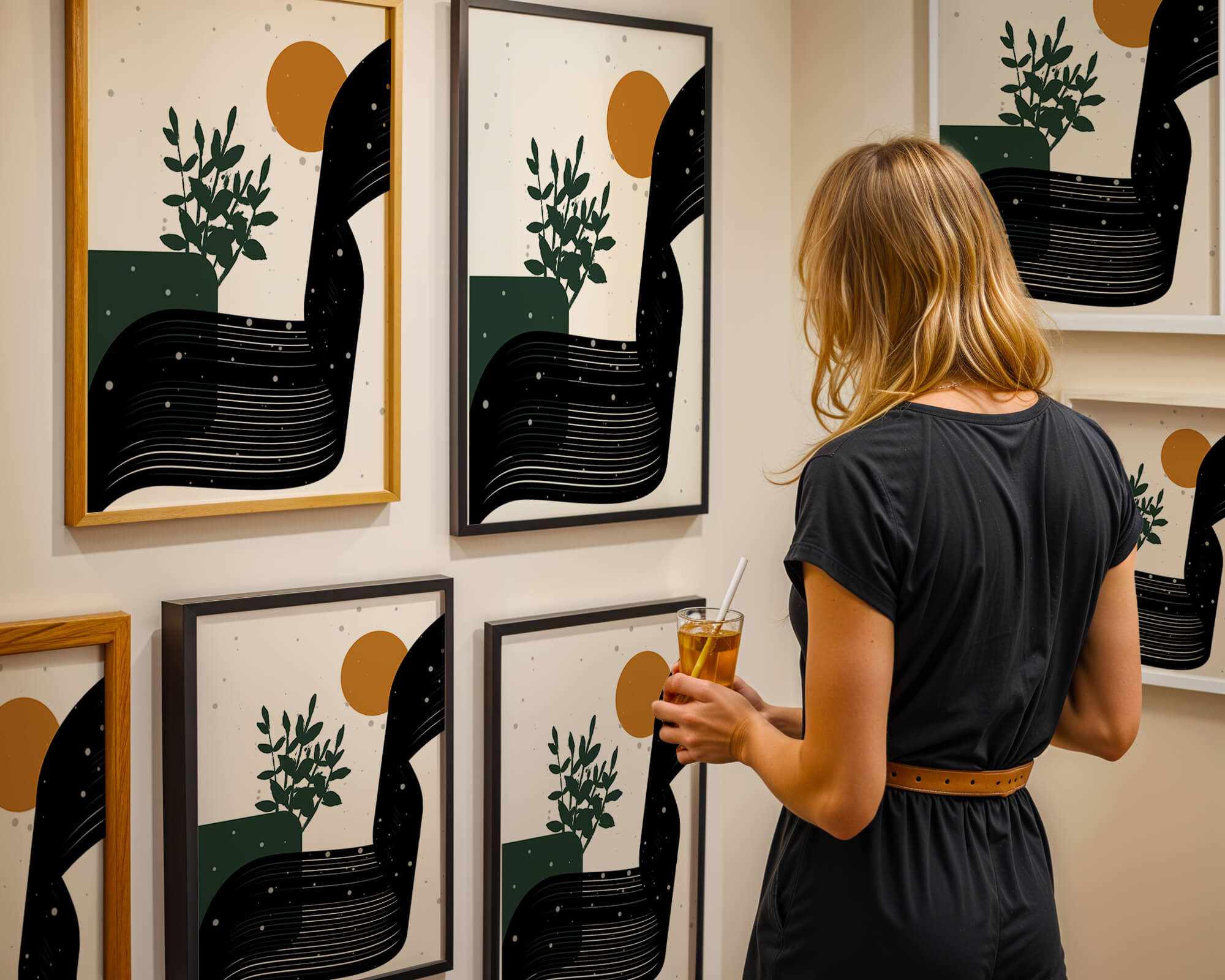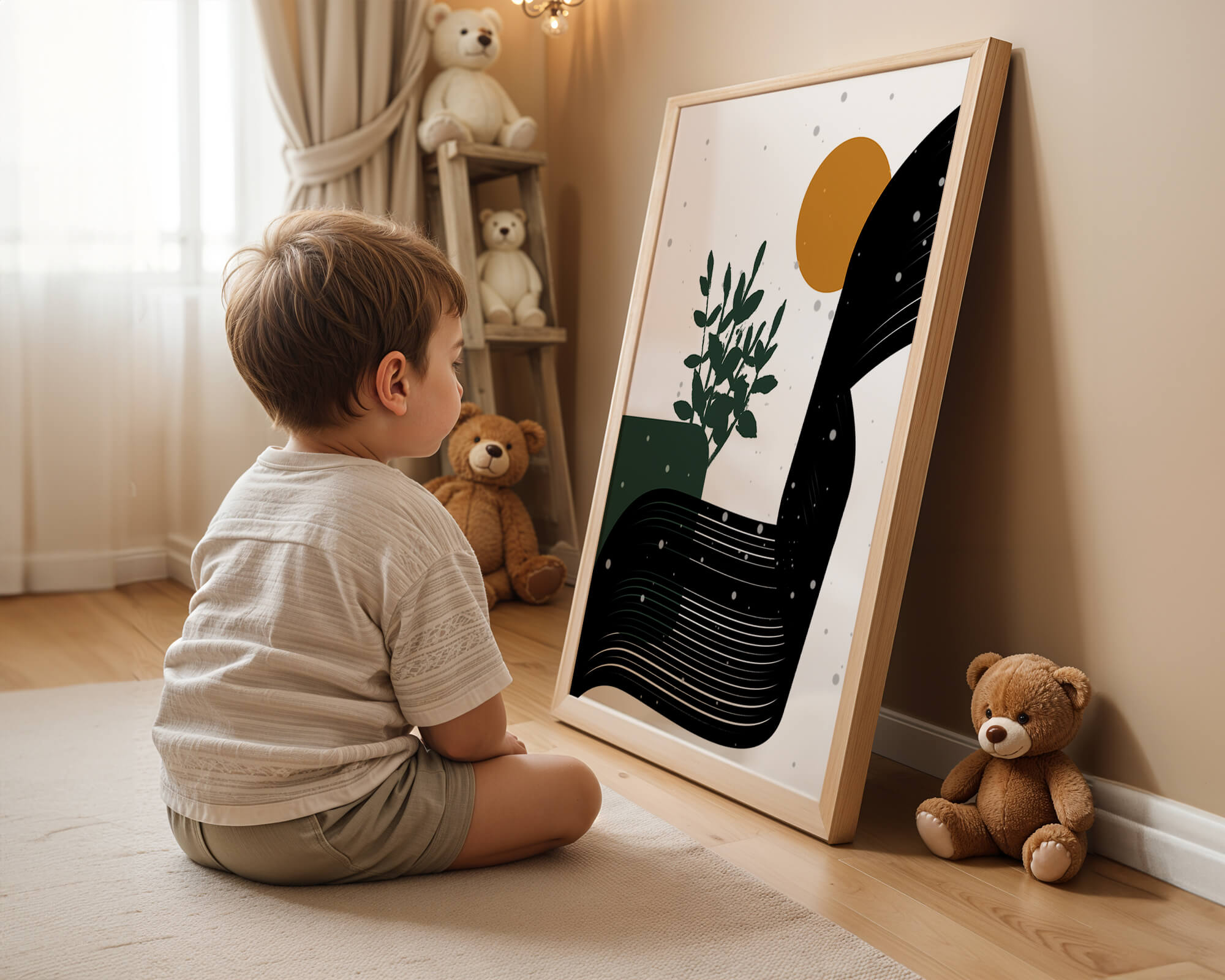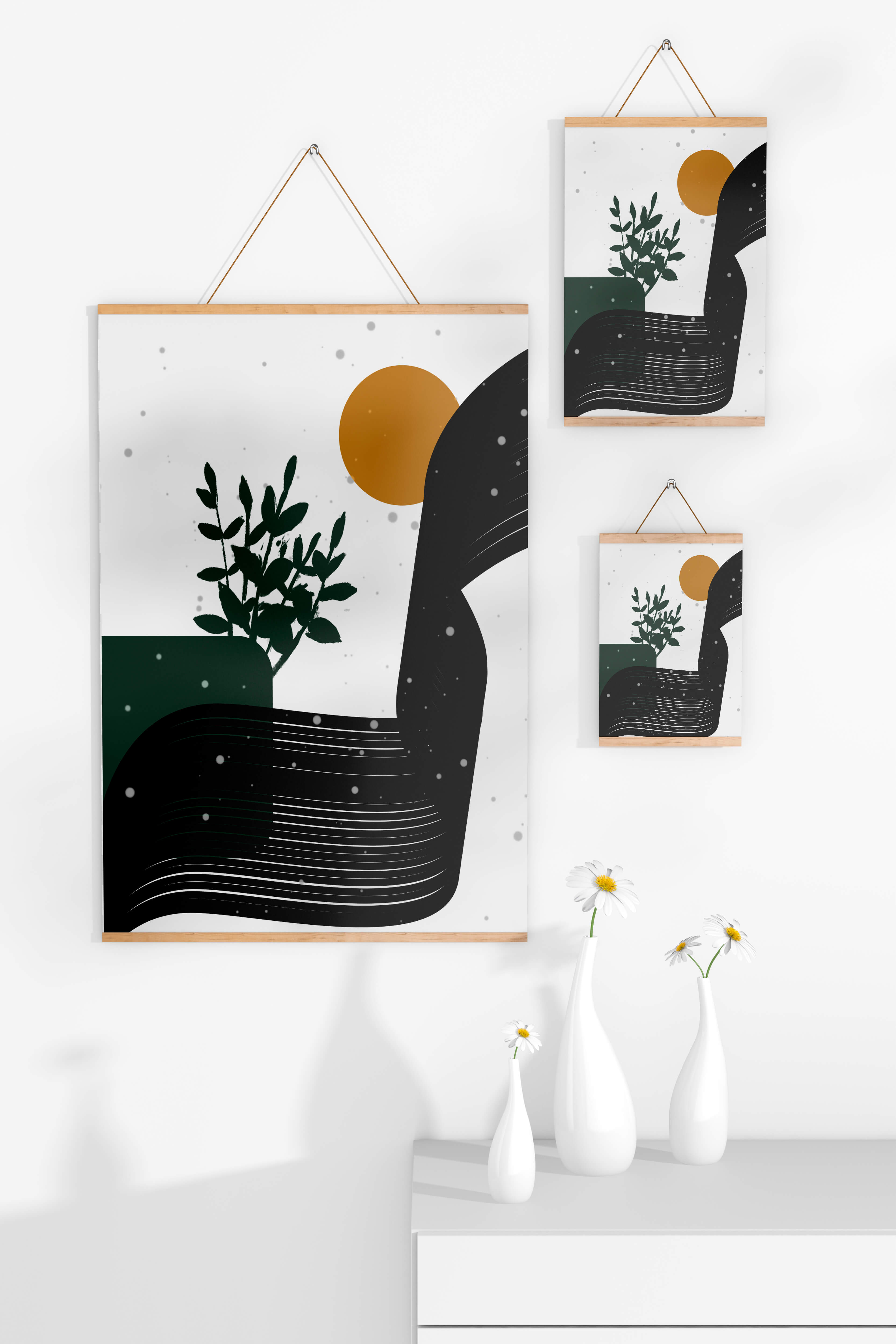 In this piece, the simplicity of form and color comes together to create an elegant design that plays with the contrast between organic and geometric shapes. The dark green plant silhouette anchors the composition, adding a touch of nature to the abstract scene. Meanwhile, the flowing black lines introduce a dynamic movement across the image, drawing the eye along its curves.The warm orange circle suggests a sun, bringing warmth to the otherwise restrained color palette. The snow-like dots scattered throughout add a whimsical touch, enhancing the connection between nature and abstraction. This versatile artwork is perfect for modern interiors, offering a sophisticated accent to spaces like living rooms, bedrooms, or offices.