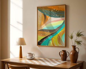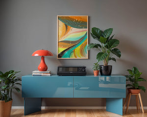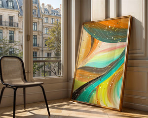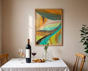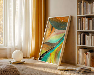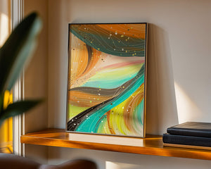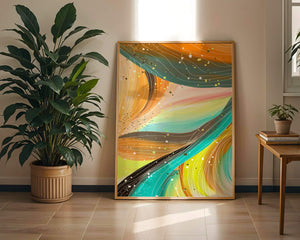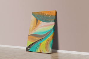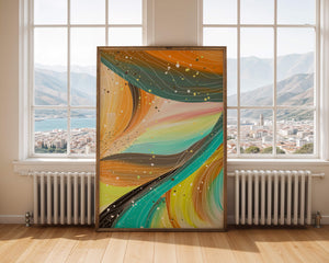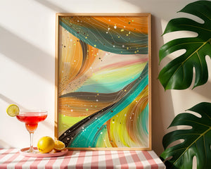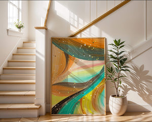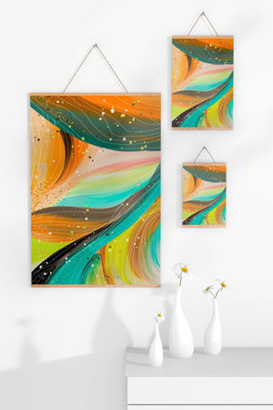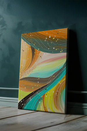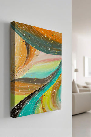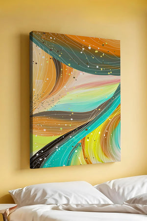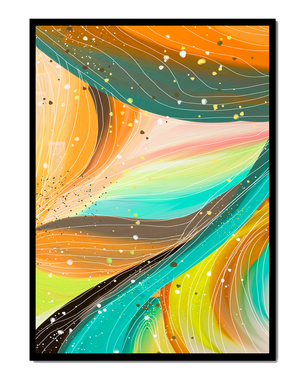 The vibrant image captures a swirling array of colors and dynamic lines, presenting an abstract composition that would invigorate any space. Bright hues of orange and teal weave together in a flowing pattern that speaks to movement and energy.