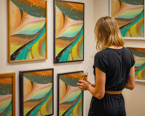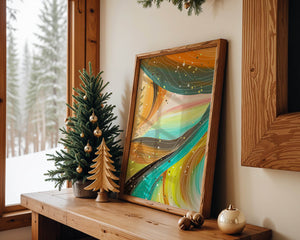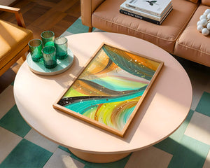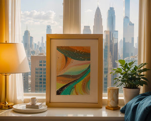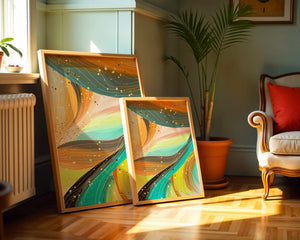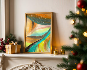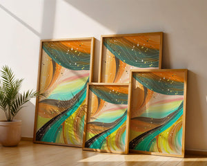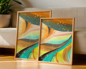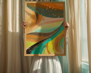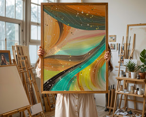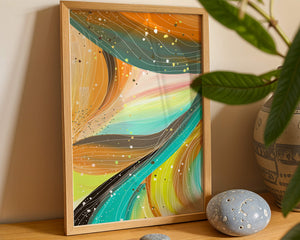 This artwork is a testament to the beauty of abstract expression. The bold strokes of orange and teal create an intricate dance, reminiscent of natural patterns found in flowing water or swirling winds. The incorporation of white and golden specks adds a touch of sparkle and depth, giving the piece a sense of texture and layering. Perfect for modern decor settings, this piece can serve as a focal point in living rooms, bedrooms, or creative spaces. Its aesthetic appeal lies in its ability to blend with various color schemes while providing a pop of vibrant energy that is both calming and invigorating. An excellent choice for those looking to add a touch of contemporary art to their home.| Type |