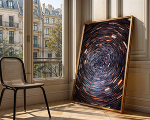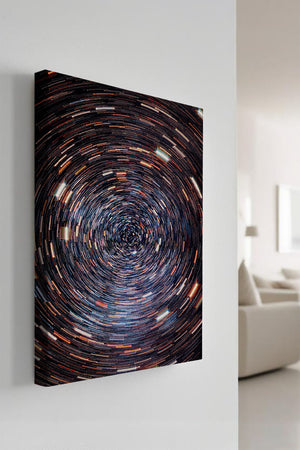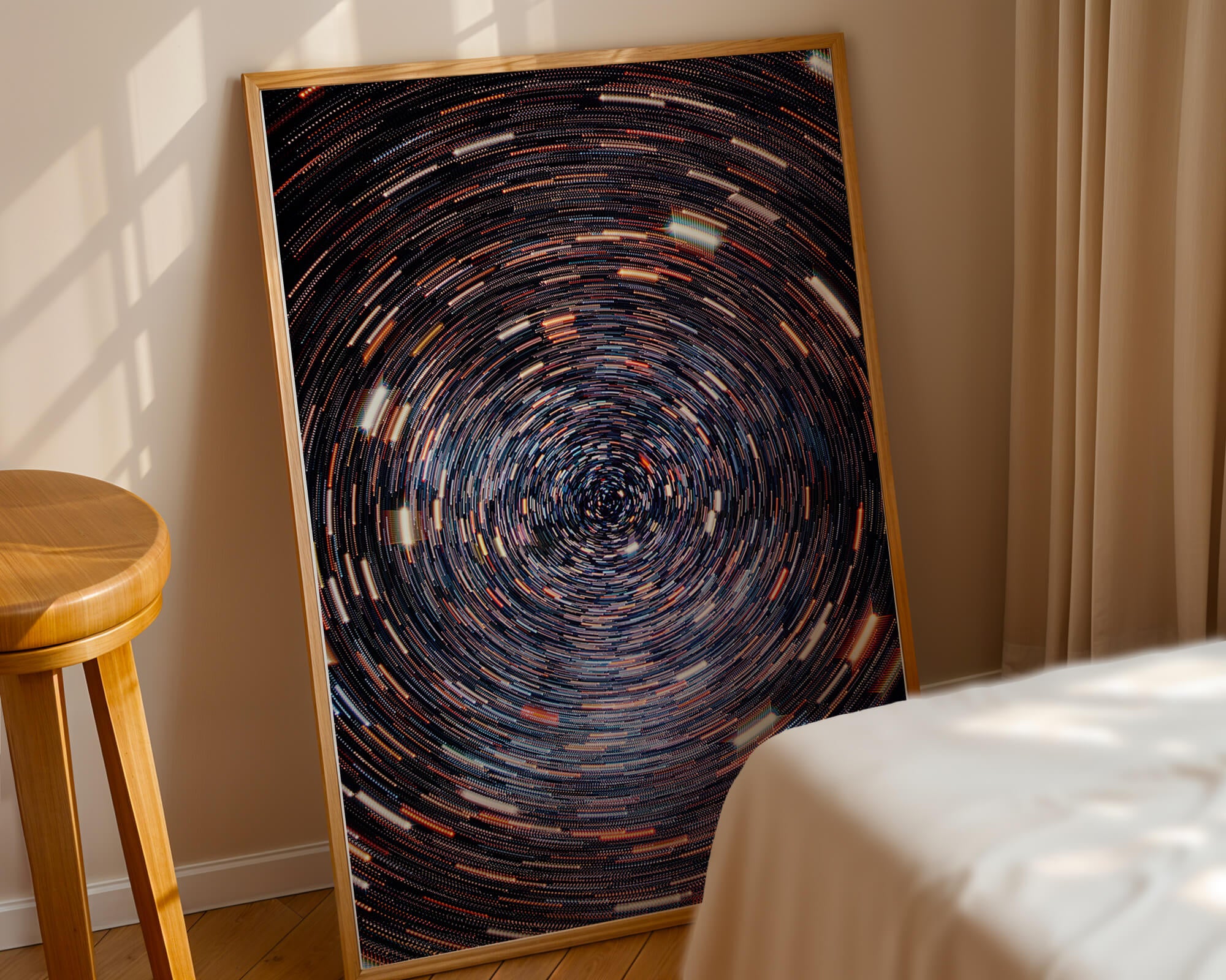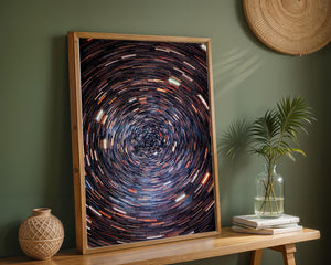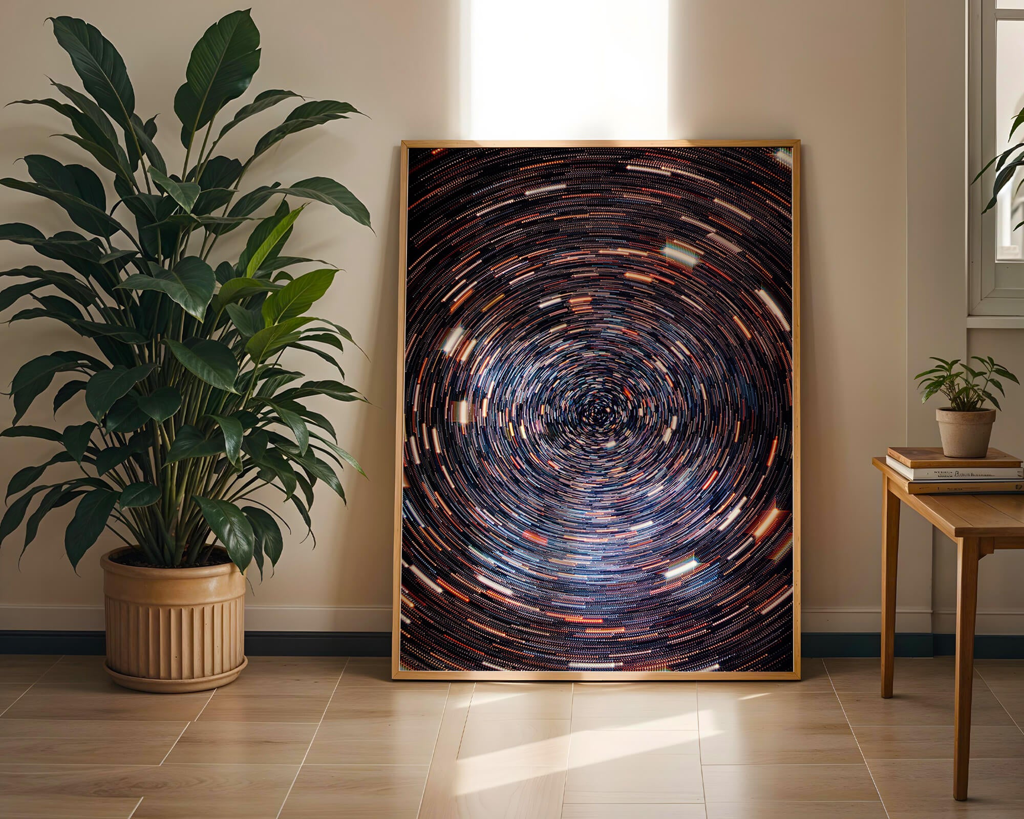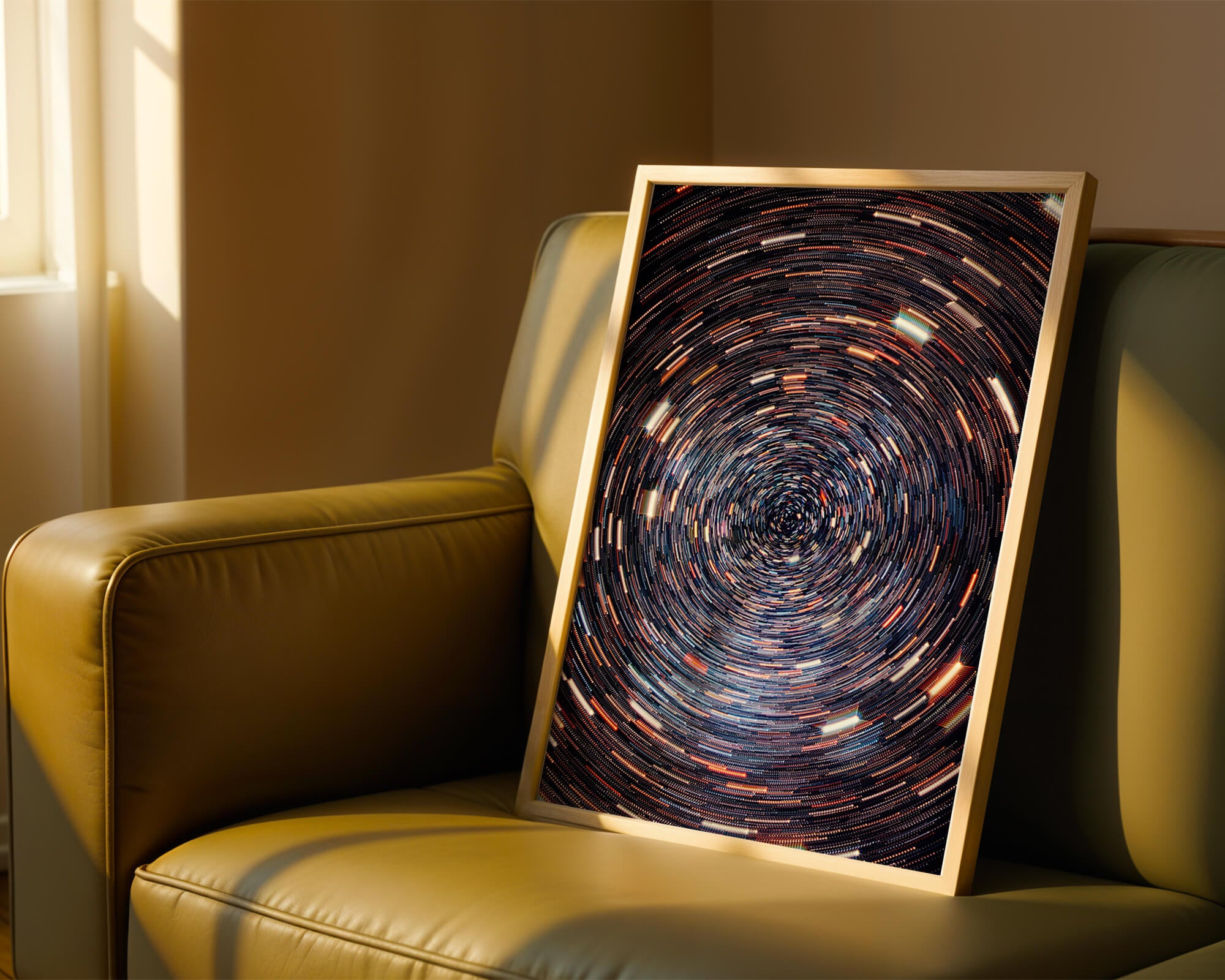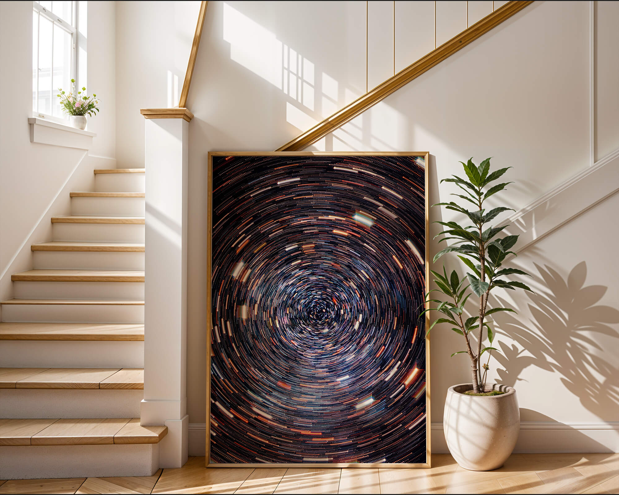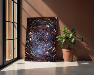 This artwork, with its harmonious blend of colors and dynamic motion, is a striking representation of modern abstract photography. The intricate details and fluid motion invite viewers to get lost in its depths, offering a new perspective with each glance. Ideal for those who appreciate abstract themes and the captivating play of light.