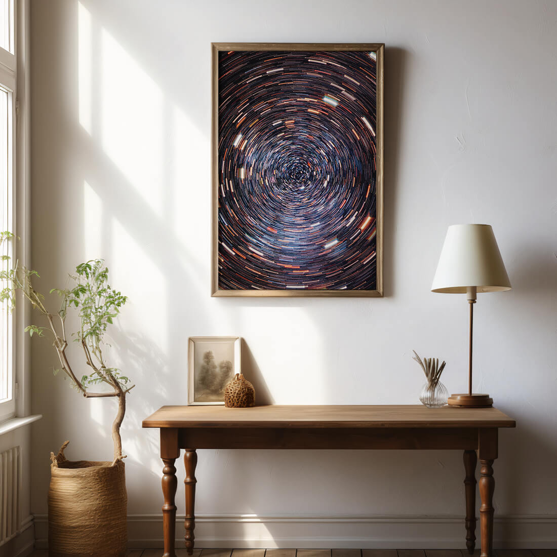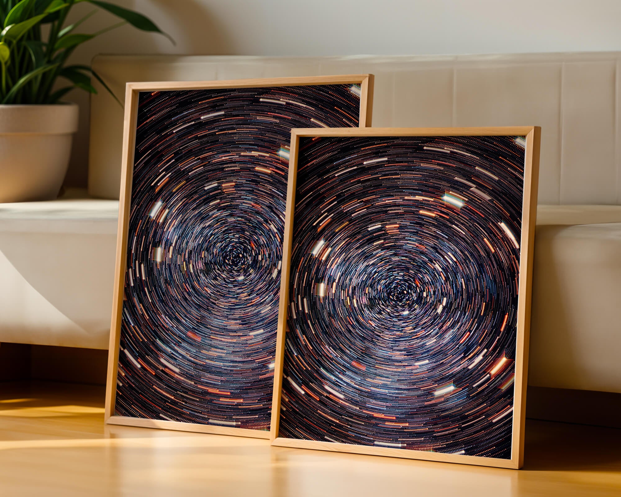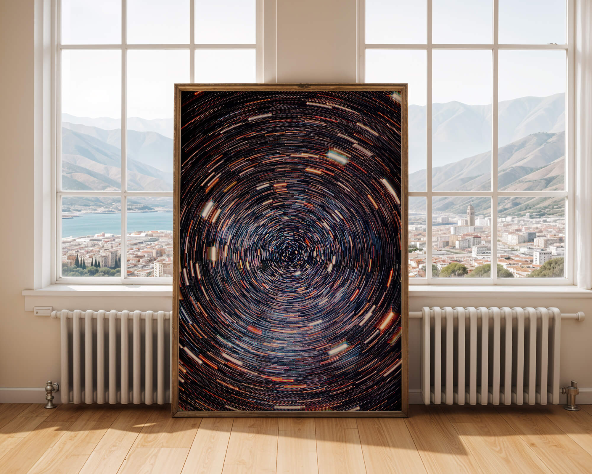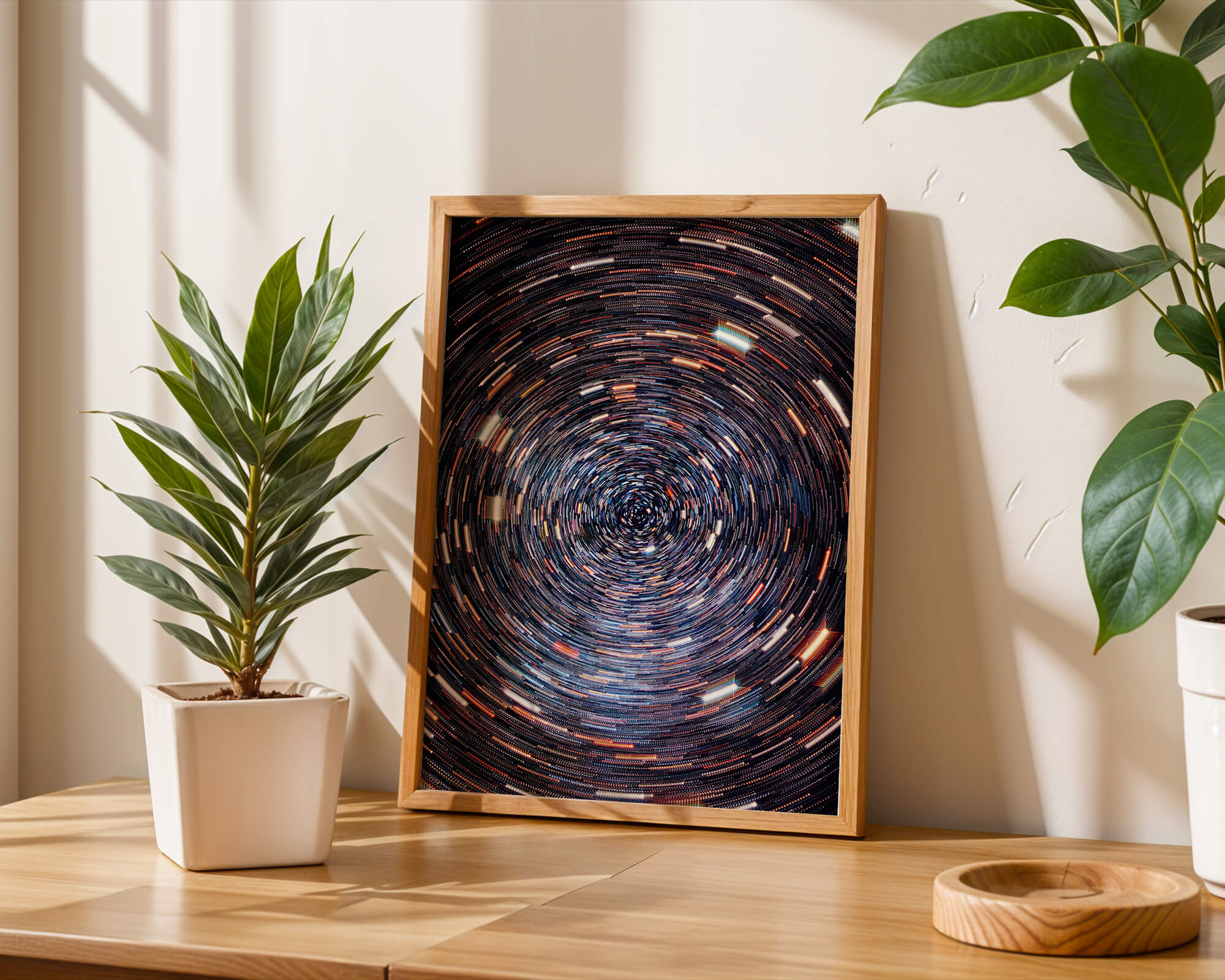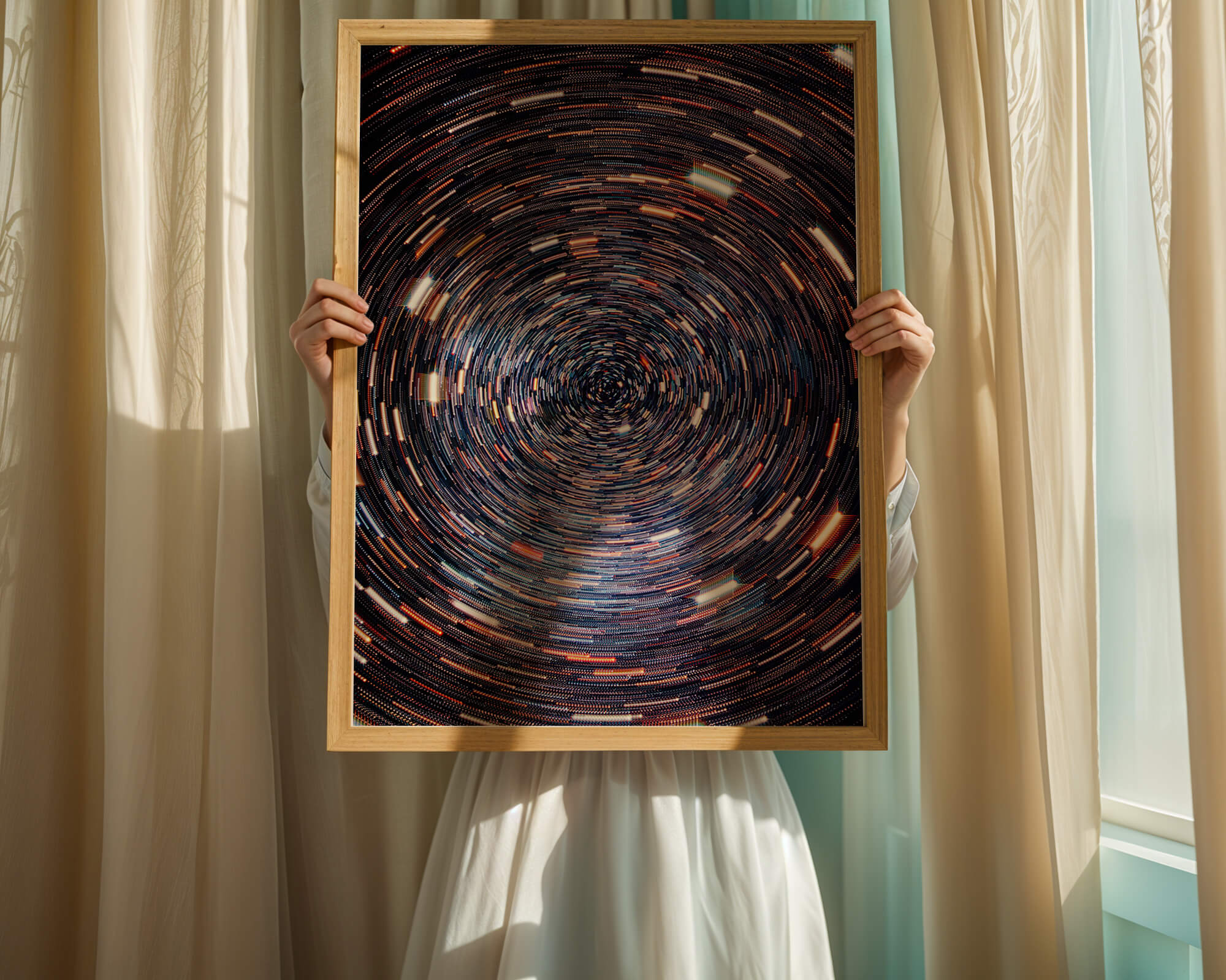 This artwork, with its harmonious blend of colors and dynamic motion, is a striking representation of modern abstract photography. The intricate details and fluid motion invite viewers to get lost in its depths, offering a new perspective with each glance. Ideal for those who appreciate abstract themes and the captivating play of light.
