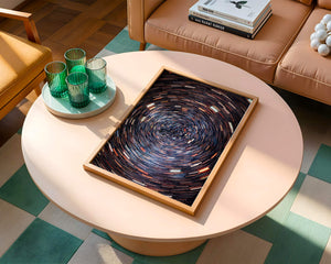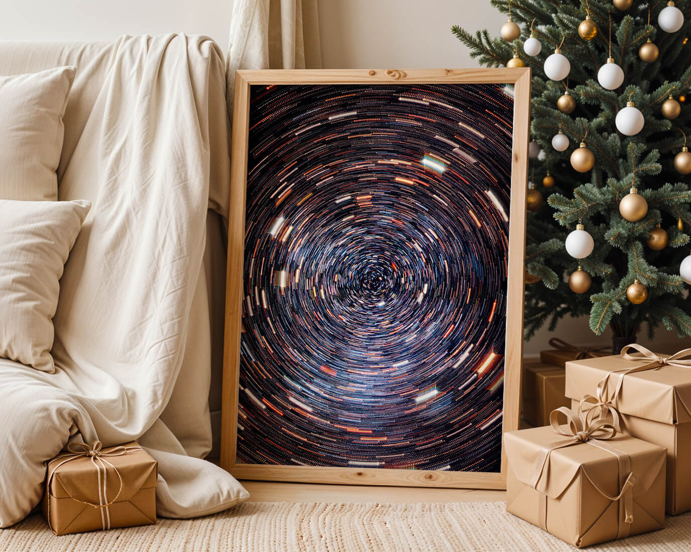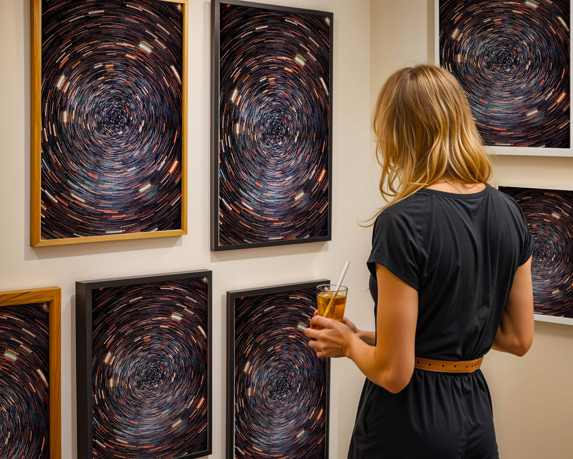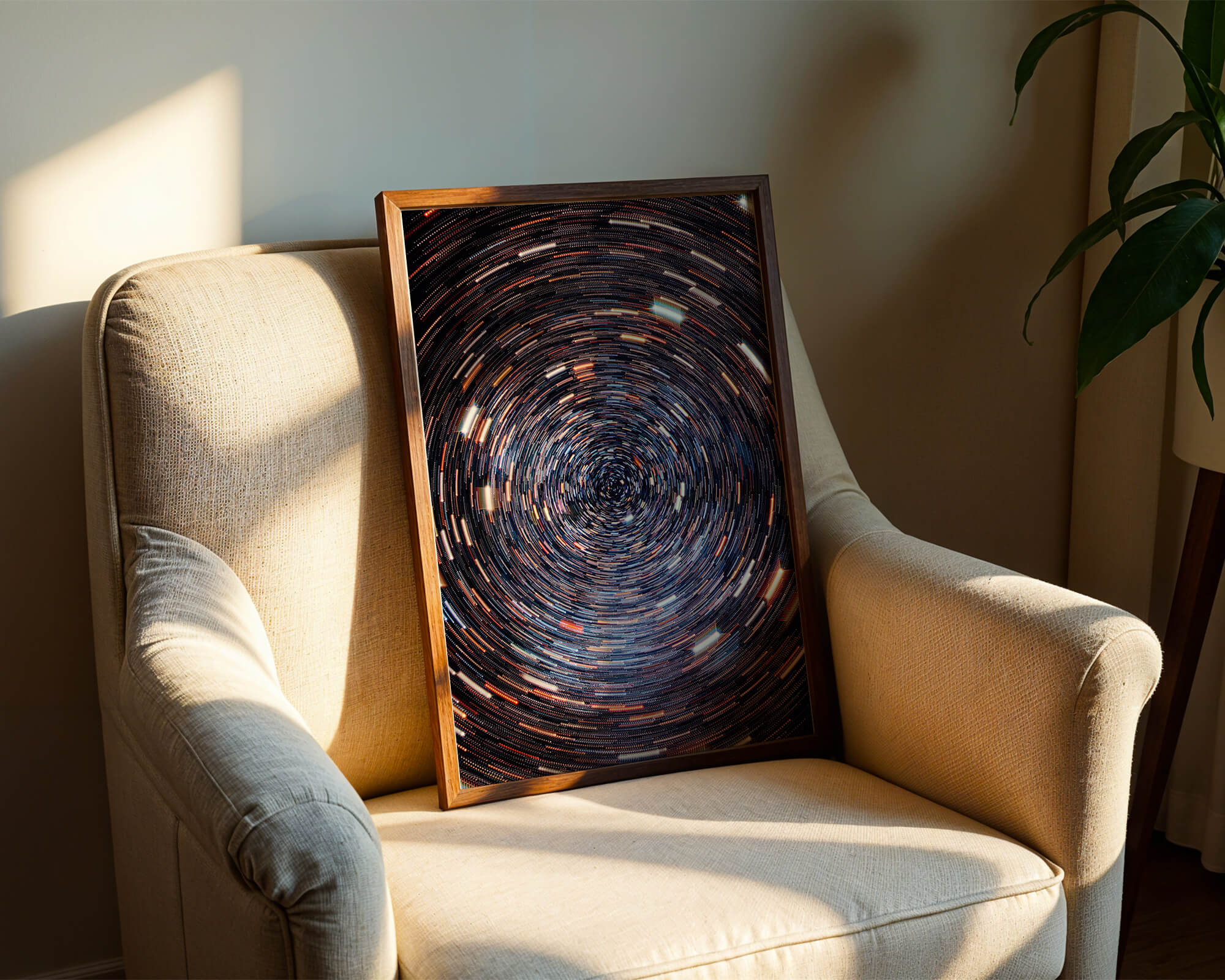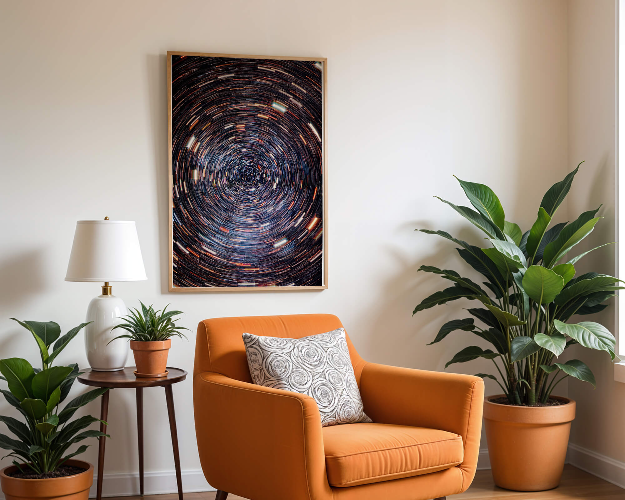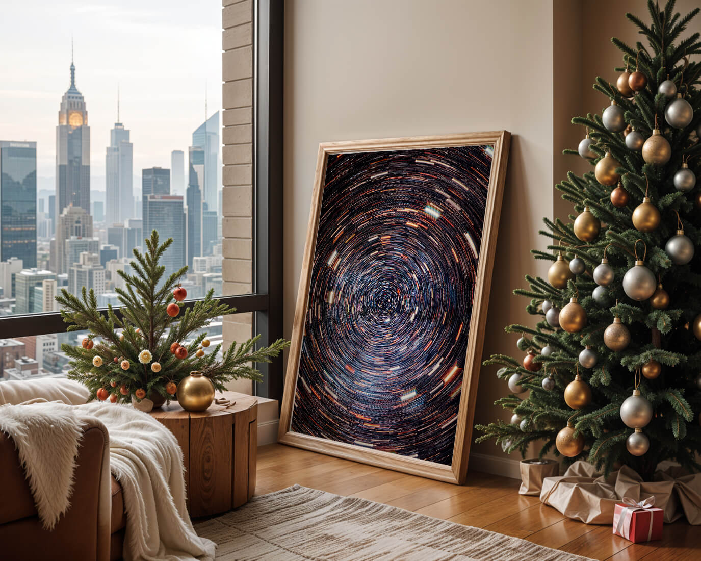 This artwork, with its harmonious blend of colors and dynamic motion, is a striking representation of modern abstract photography. The intricate details and fluid motion invite viewers to get lost in its depths, offering a new perspective with each glance. Ideal for those who appreciate abstract themes and the captivating play of light.