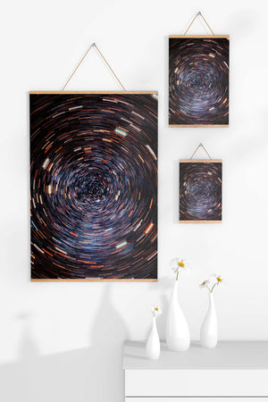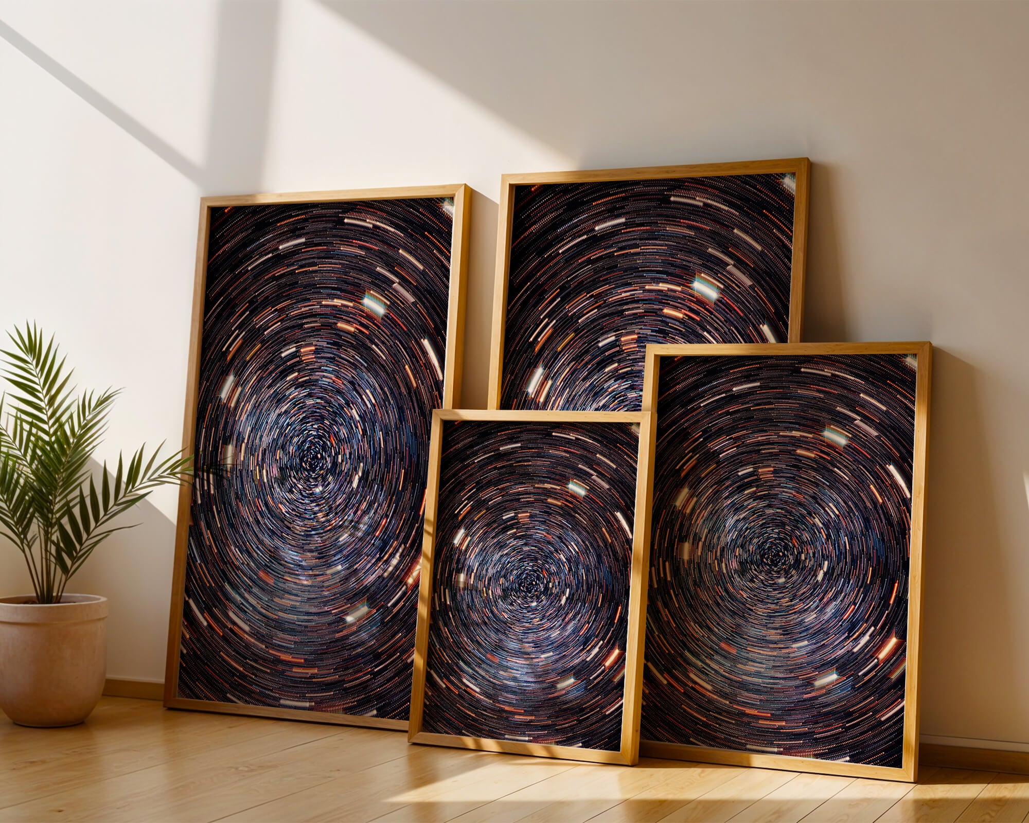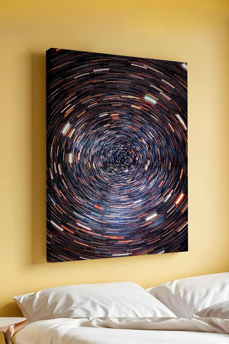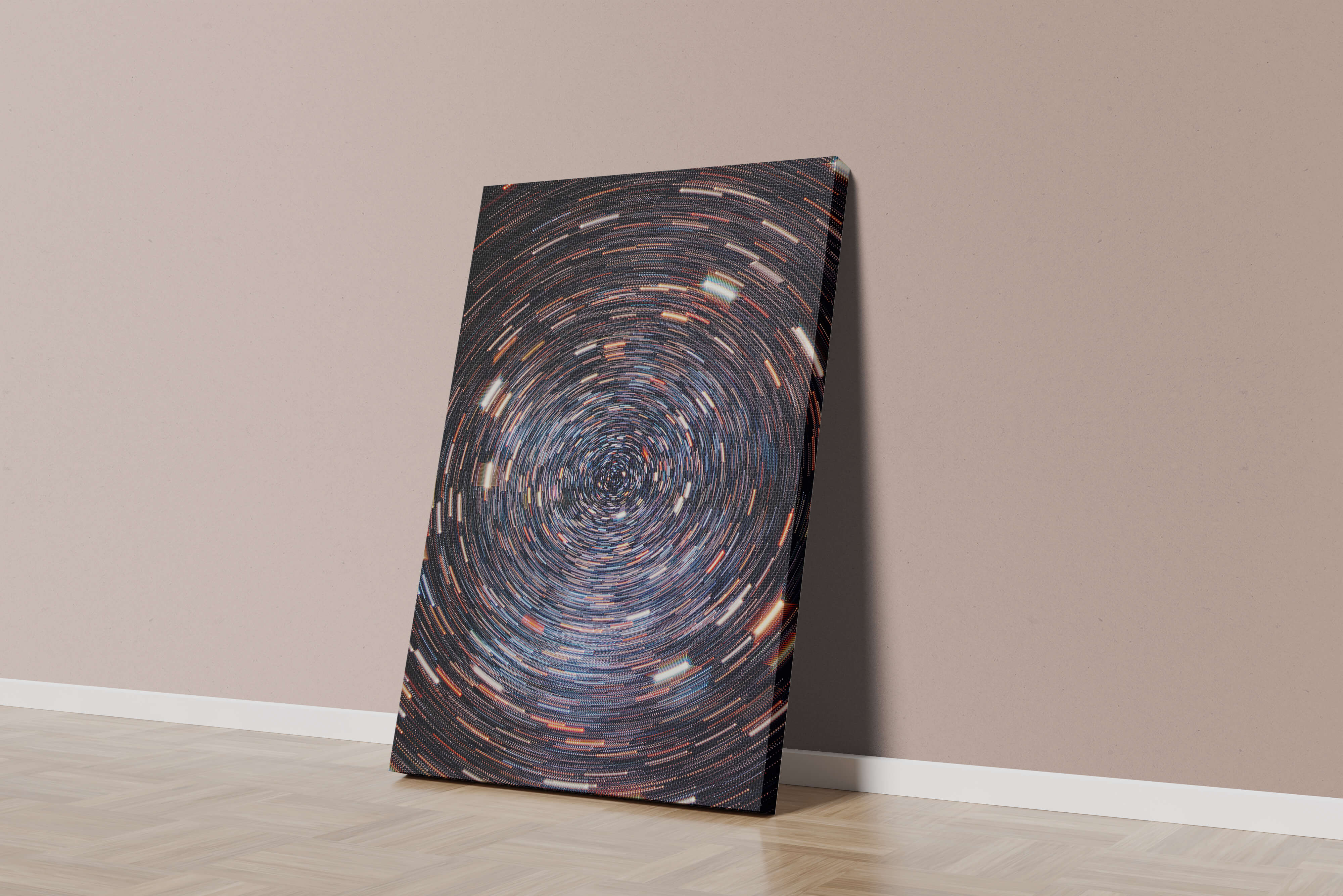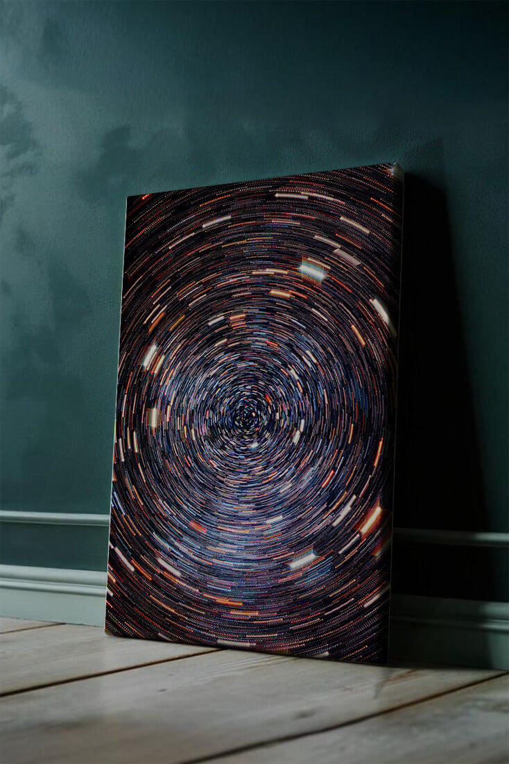 The image presents a fascinating exploration of light and motion, captured through the mesmerizing whirl of colorful streaks. Each line of light seems to dance across the composition, creating a lively and energetic visual experience. The circular pattern suggests an infinite loop, reminiscent of galaxies or an artistic interpretation of time and space.