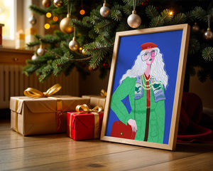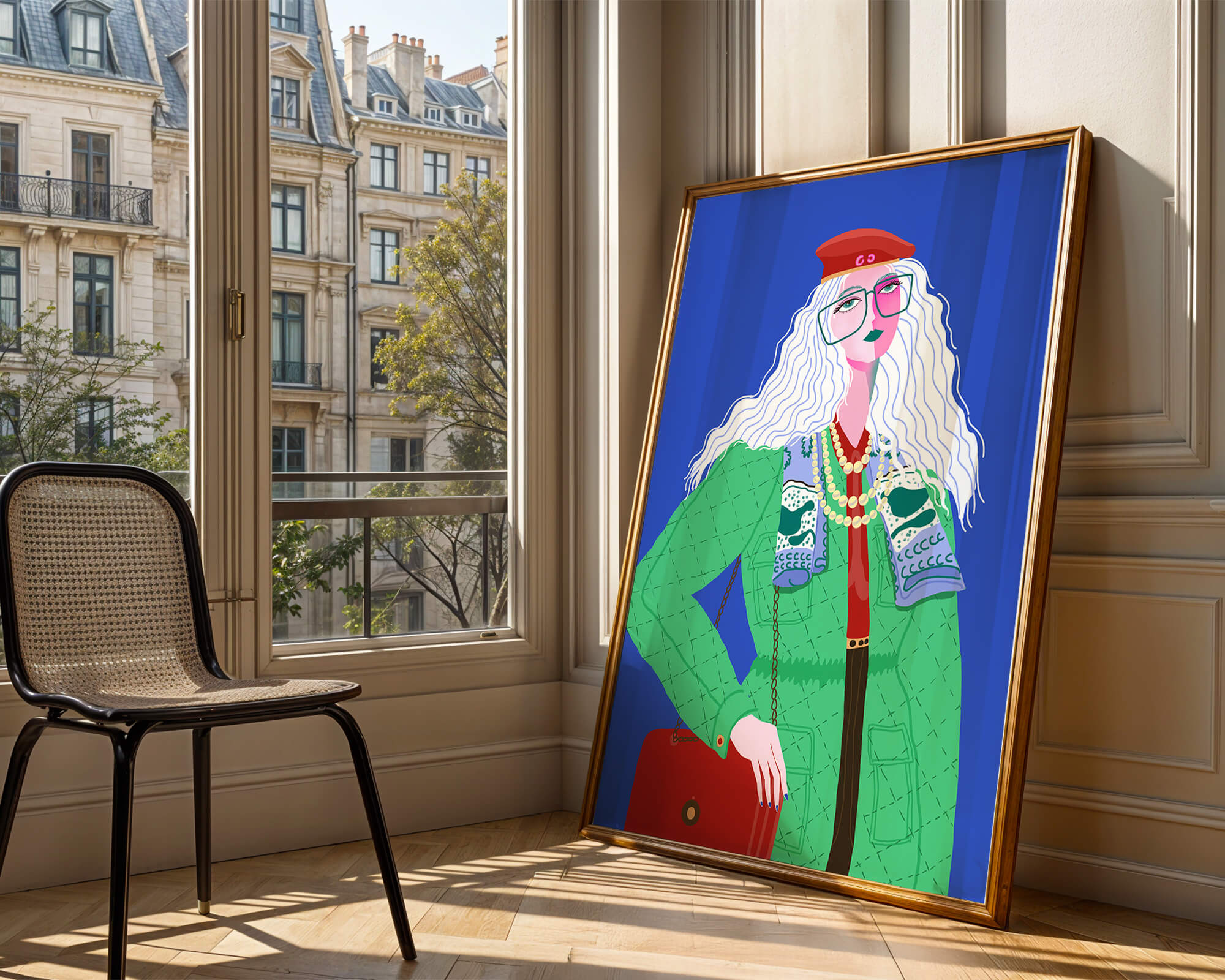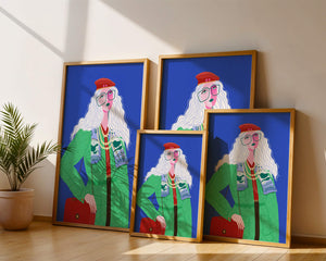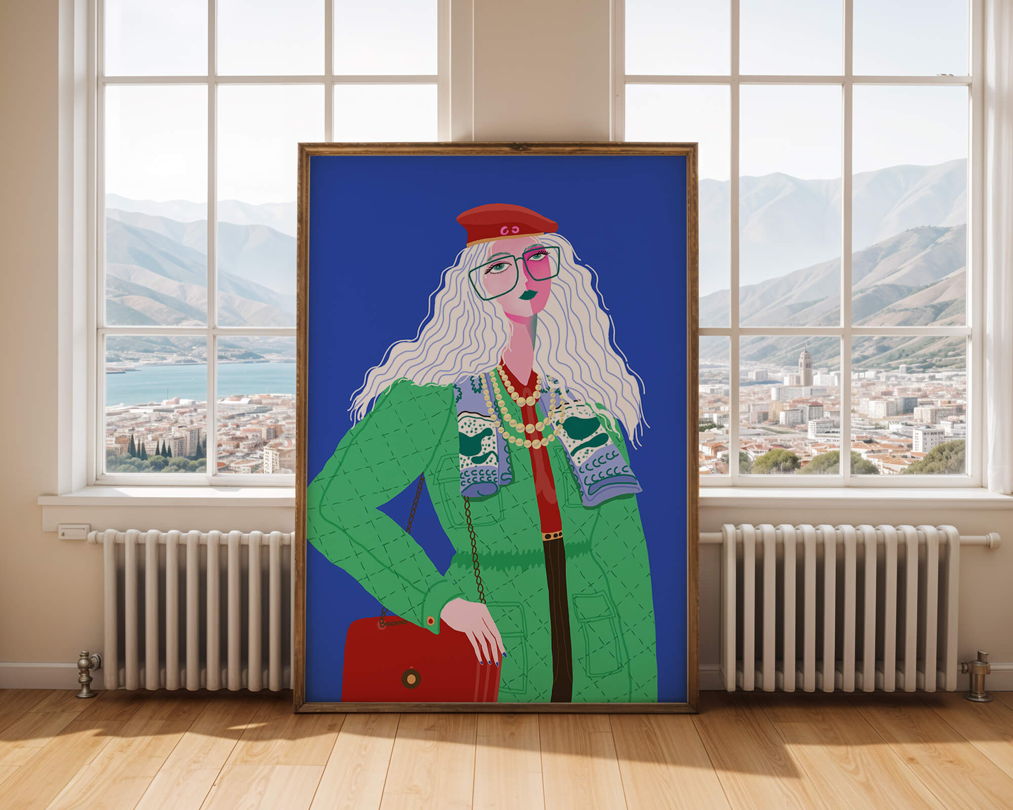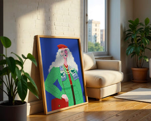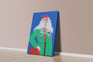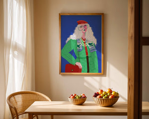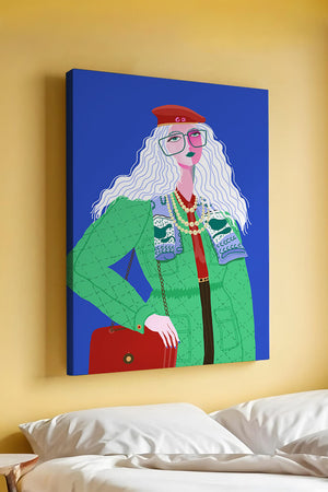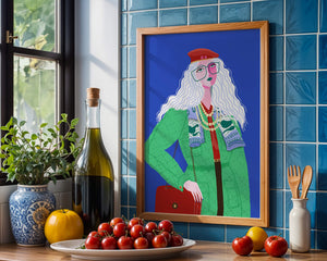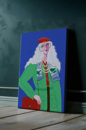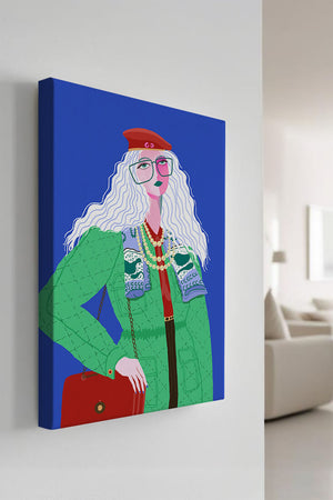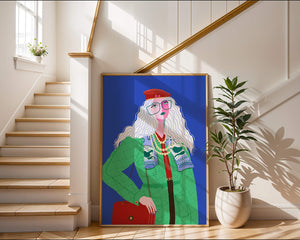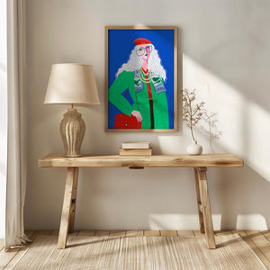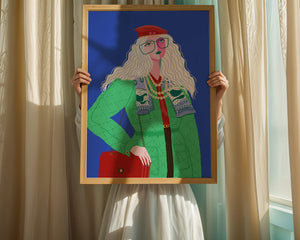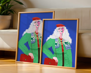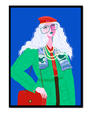 The illustration is a striking portrait featuring a woman with long, flowing white hair and prominent accessories. She wears an oversized green coat and a red beret, exuding a sense of modern chic. Her oversized glasses and layered necklaces add a bold touch to her look, making her stand out against the bright blue background. Each element, from the intricate patterns on her clothing to the choice of colors, demonstrates a unique expression of style.The womans pose and outfit combine elements of whimsy and fashion savviness, creating a visually captivating image. The vibrant colors and abstract design make it an appealing piece of art. The illustration successfully blends artistic creativity with contemporary fashion, resulting in a visually engaging and stylish depiction.| Type |