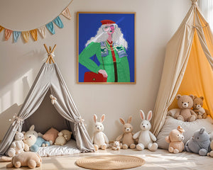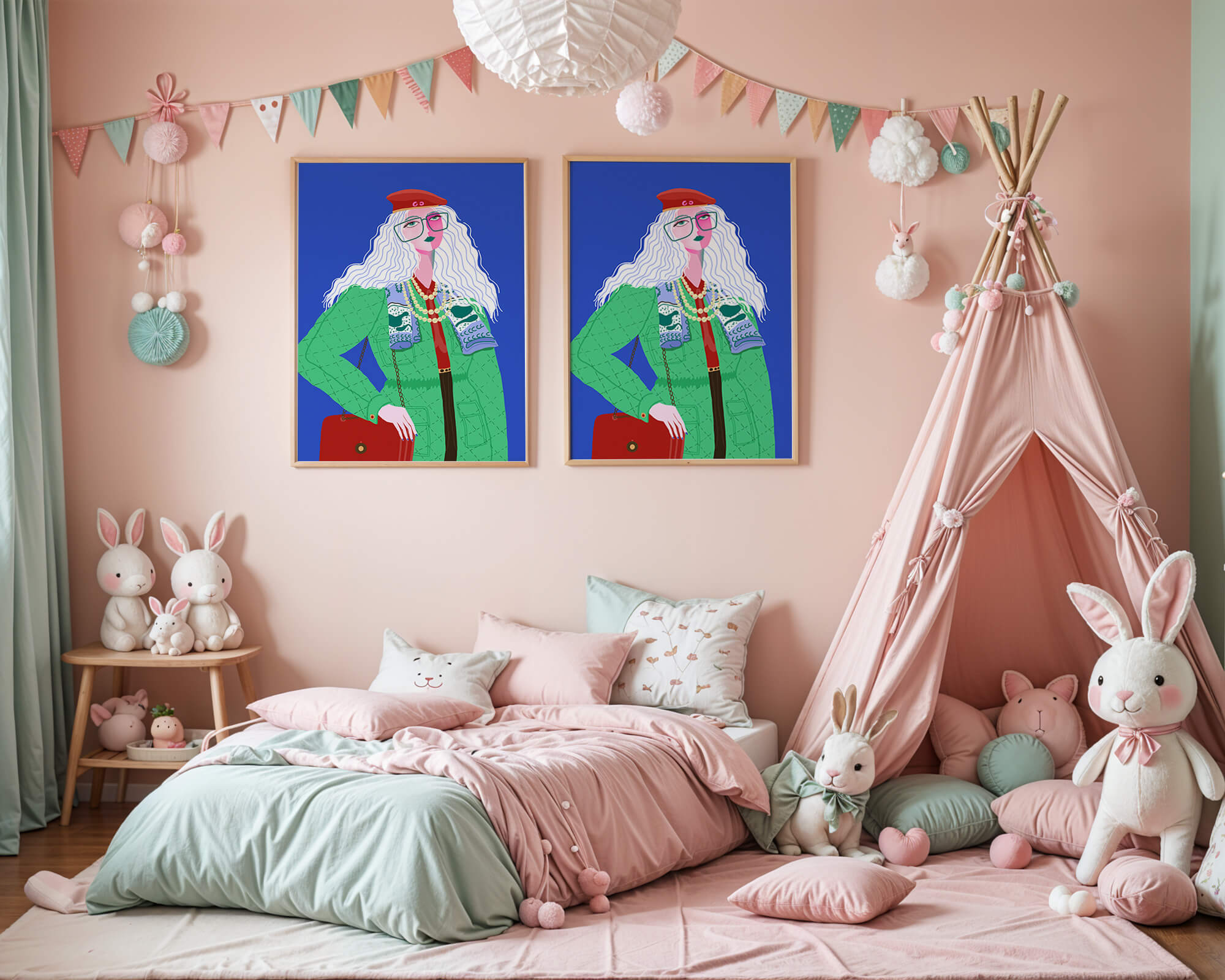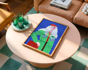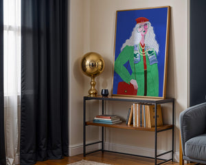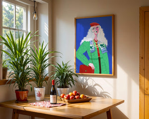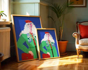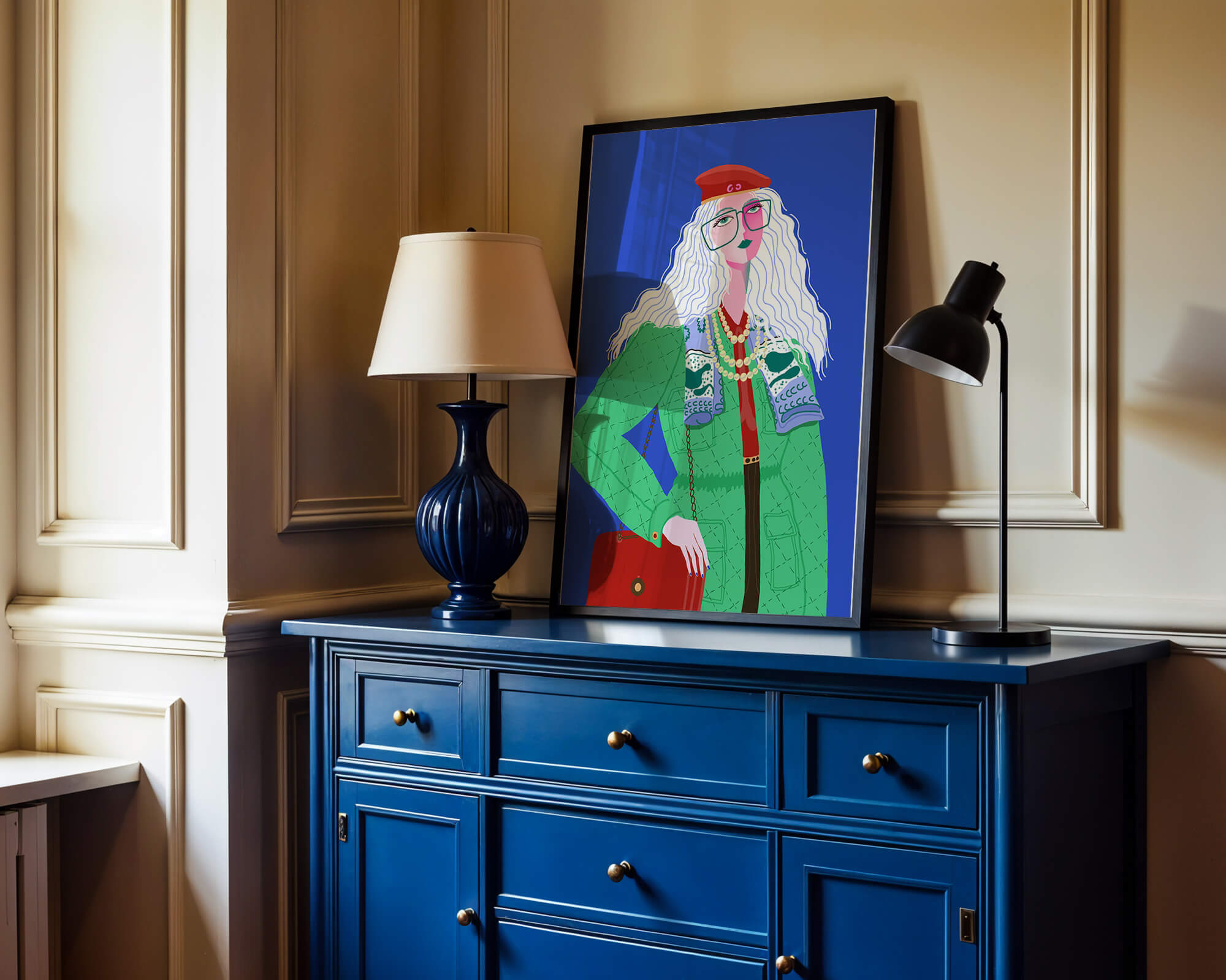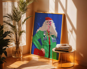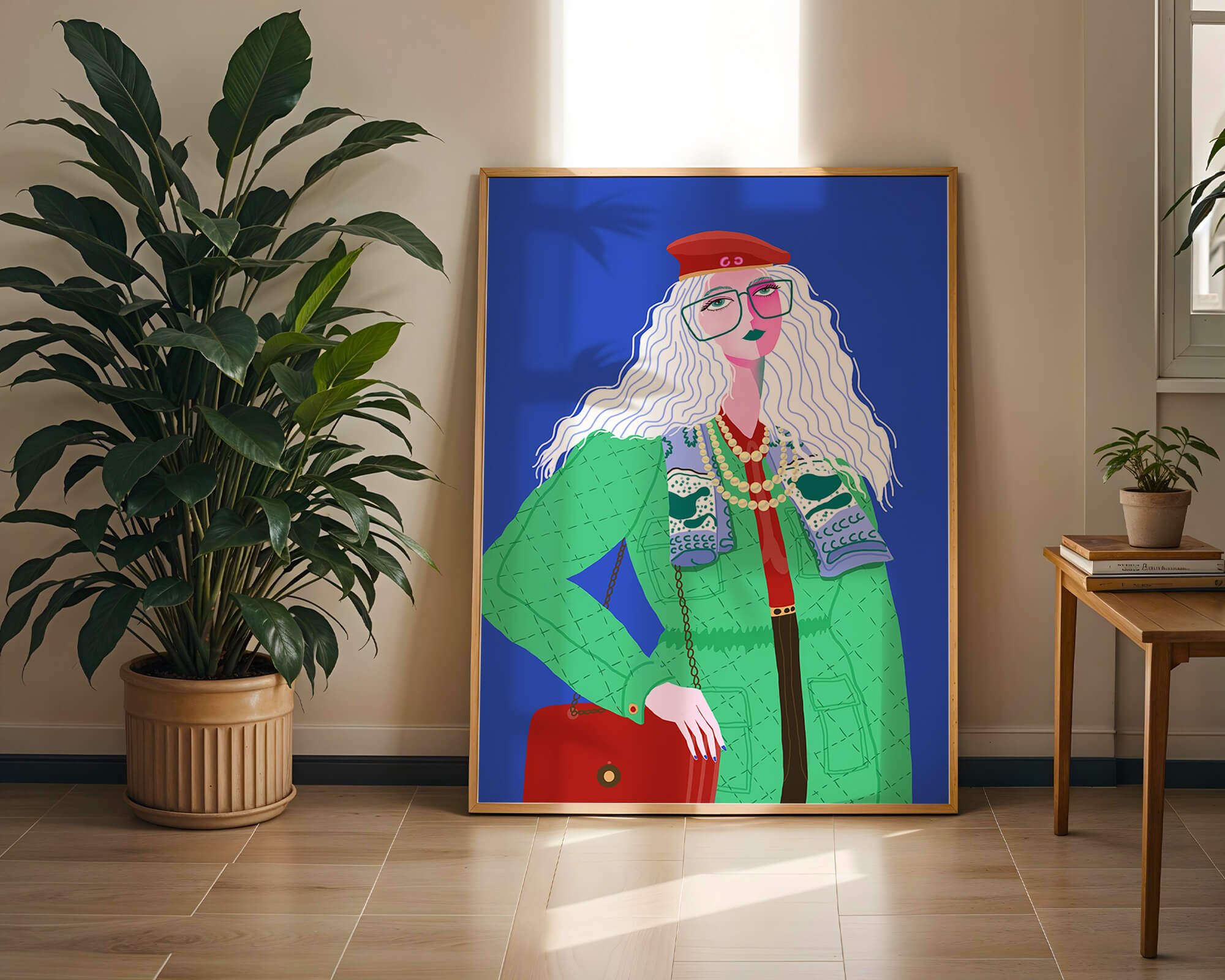 The illustration is a striking portrait featuring a woman with long, flowing white hair and prominent accessories. She wears an oversized green coat and a red beret, exuding a sense of modern chic. Her oversized glasses and layered necklaces add a bold touch to her look, making her stand out against the bright blue background. Each element, from the intricate patterns on her clothing to the choice of colors, demonstrates a unique expression of style.The womans pose and outfit combine elements of whimsy and fashion savviness, creating a visually captivating image. The vibrant colors and abstract design make it an appealing piece of art. The illustration successfully blends artistic creativity with contemporary fashion, resulting in a visually engaging and stylish depiction.| Type |